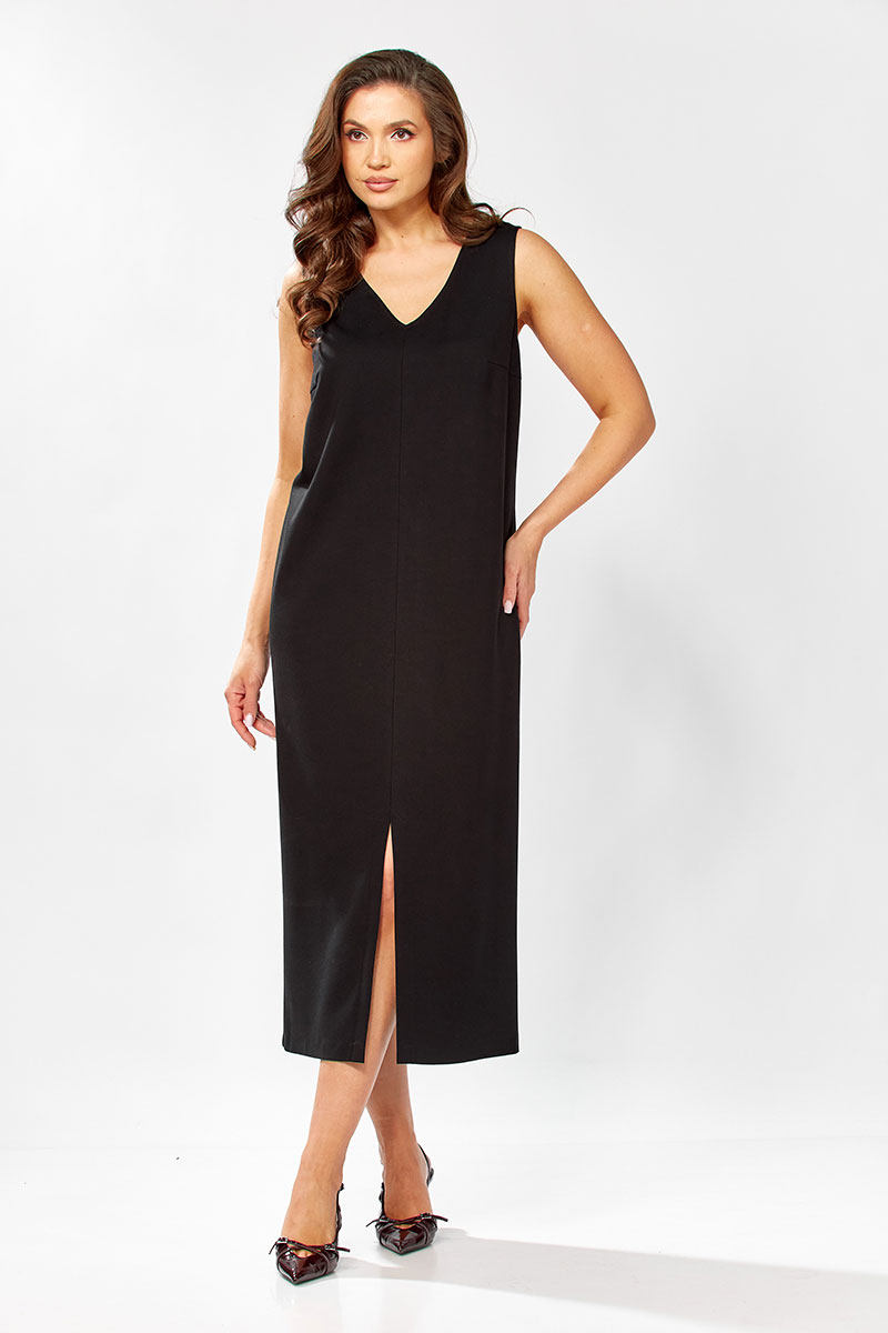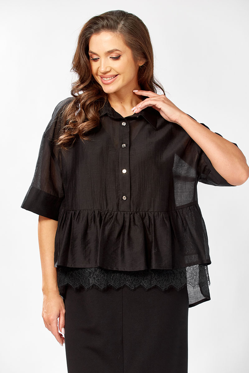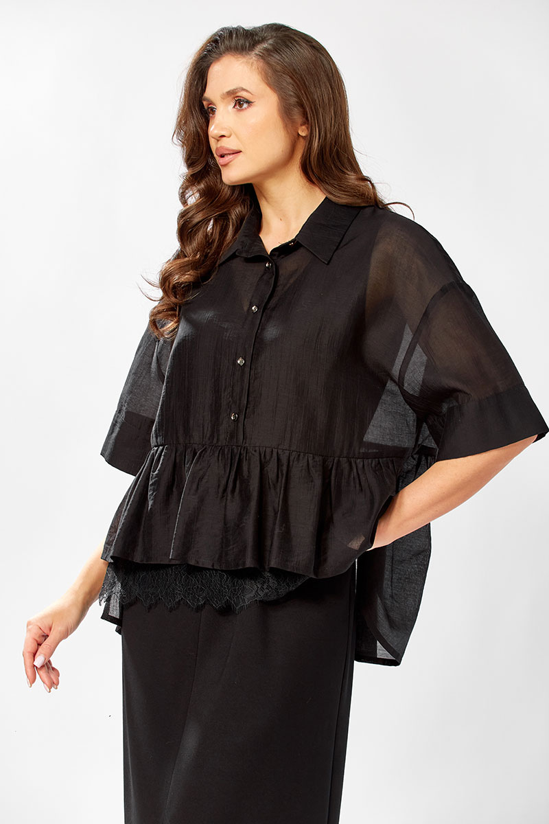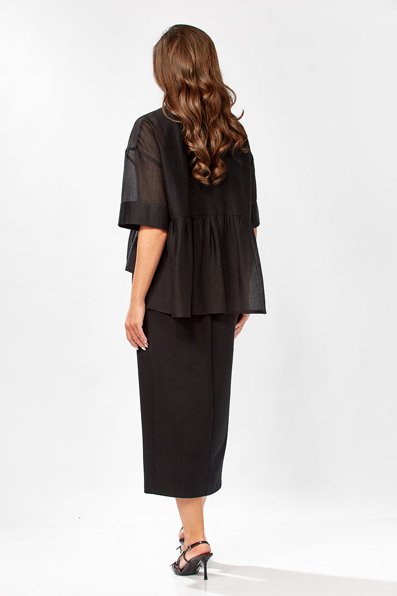 Платье полуприлегающего силуэт, без рукавовс V - образным вырезом. Платье длинное с разрезом по переду, спинка разрезная. Низ изделия подшит на плоскошовной машине. Блузка прямого силуэта с воротнтком стойкой, с коротким спущенным рукавом на манжете. Застежка по переду до талии на пели-пуговицы. По низу изделия баска, по переду настрочено декоративное кружево. Спинка удлиненная.