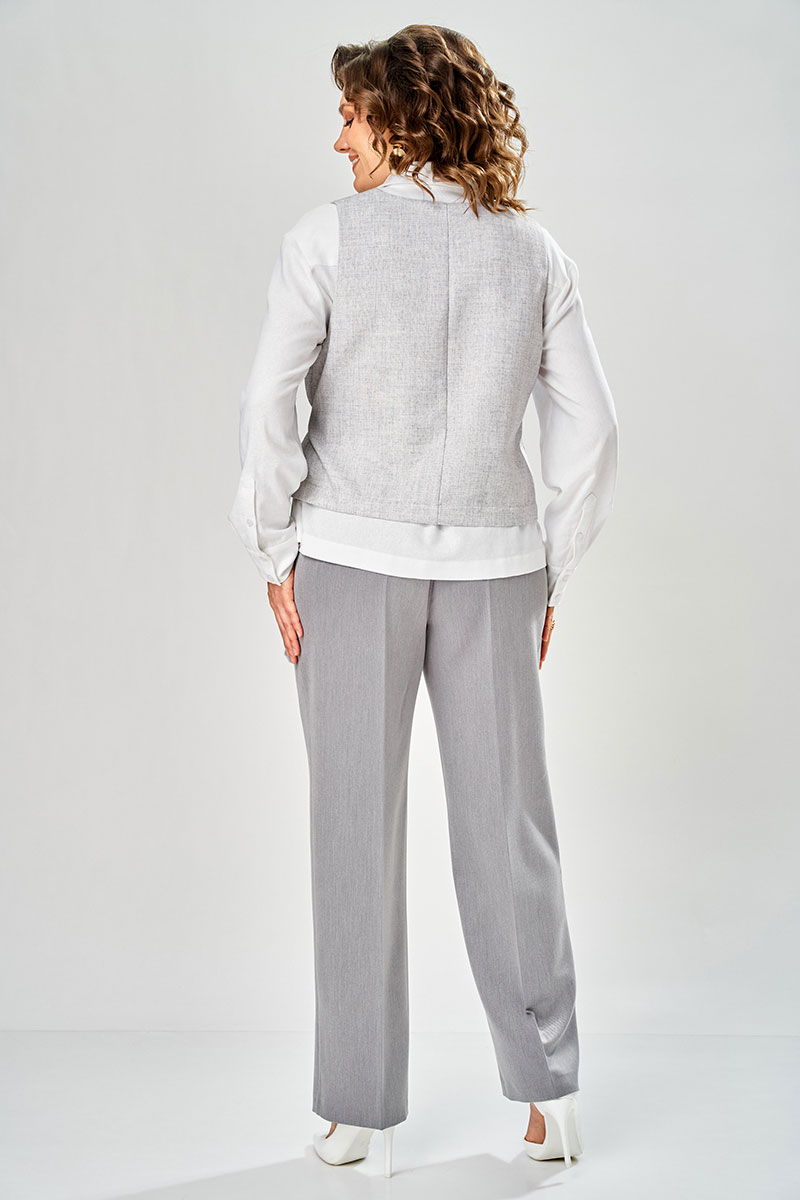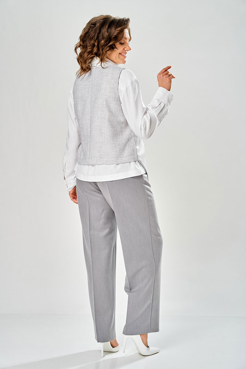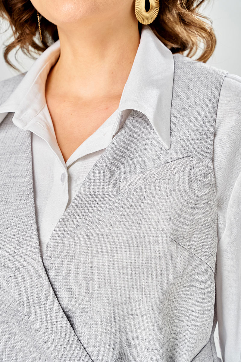 Рубашка прямого силуэта, с длинным рукавом на манжете, по спинке расположена кокетка и встречная складка. По переду два накладных карманов. С отлетным воротником на стойке. Застежка на петли пуговицы. Брюки прямого силуэта с отсроченными кантами на 0.2 см по переднему и заднему полотнищу. На переднем полотнище брюк расположены карманы. Верх пояса обработан поясам с резинкой, в пояс вставлен декоративный шнурок с наконечниками. Низ брюк обработан швом с открытым срезом. Жилетка полуприлегающего силуэта с фигурным передом. По левому переду расположен прорезной карман обманка. Застежка на потайную кнопку и пояс. Спинка разрезна. Низ обработан на обтачке. Изделие без подкладке.