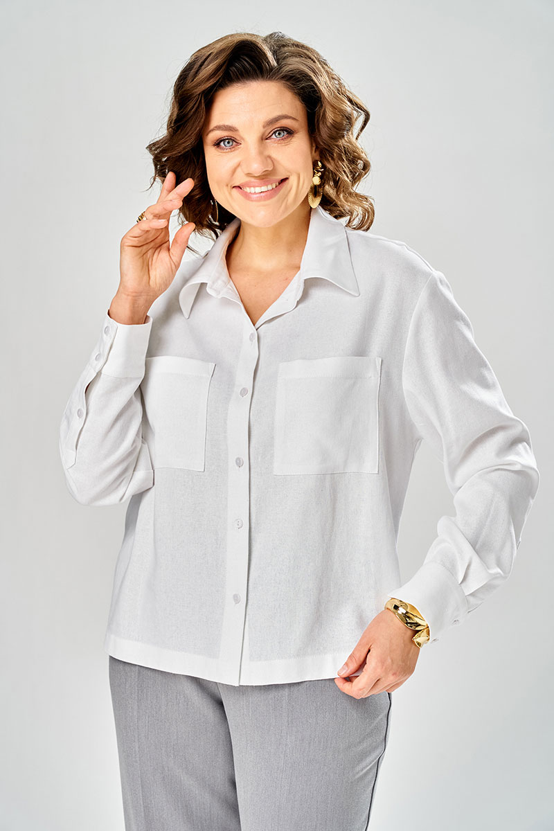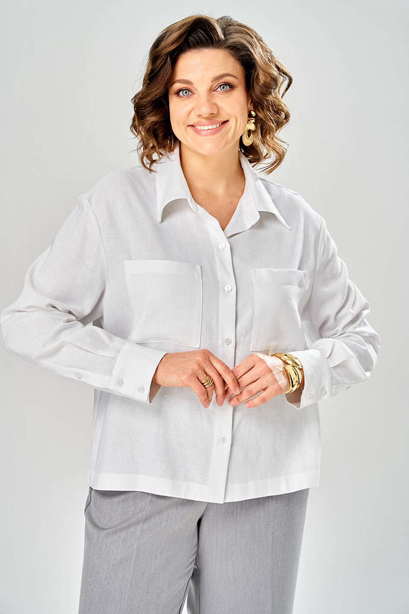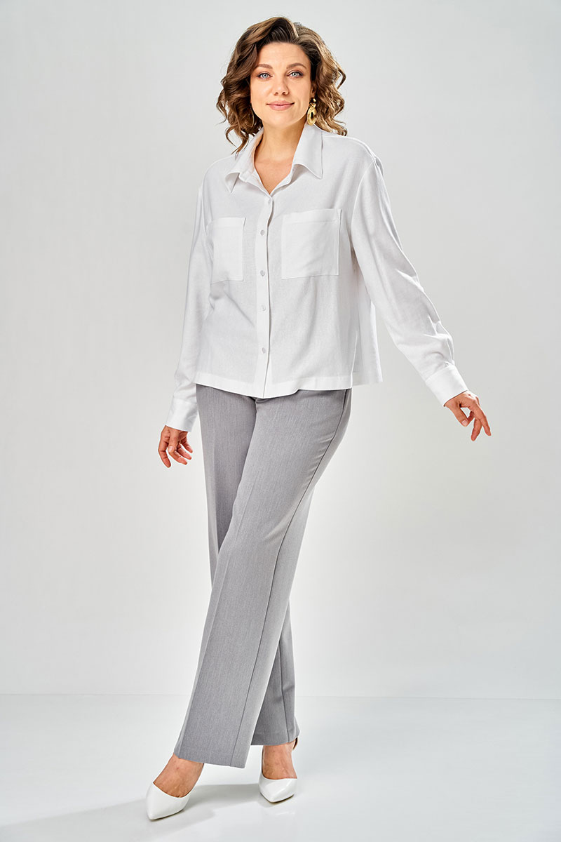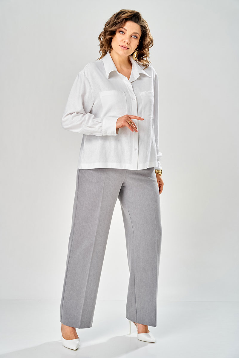 Рубашка прямого силуэта, с длинным рукавом на манжете, по спике расположена кокетка и встречная складка. По переду два наклодных корманов. С отлетным воротником на стойке. Застежка на петли пуговицы. Брюки прямого силуэта с отсрочеными кантами на 0.2 см по переднему и заднему полотнищу. На переднем полотнище брюк расположены карманы. Верх пояса обработан поясам с резинкой, в пояс вставлен декоративный шнурок с наконечниками. Низ брюк обработан швом с открытым срезом.