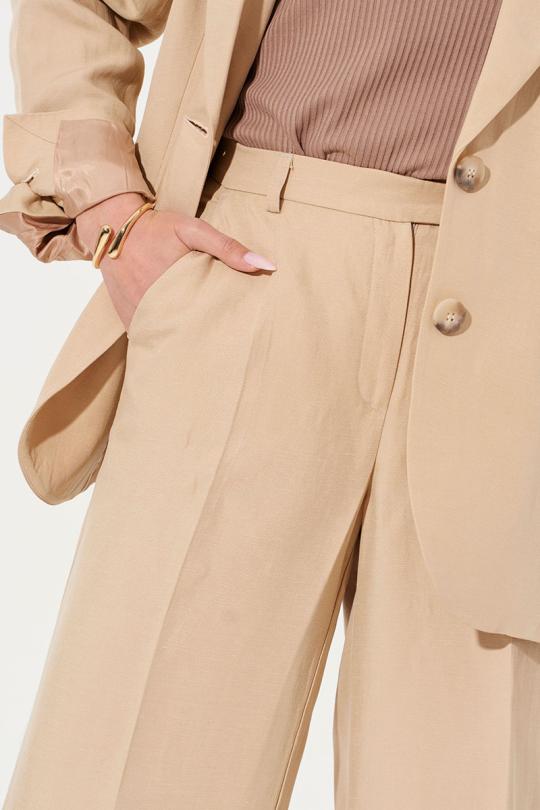 Брюки женские прямые из смесовой ткани с добавлением льна для повседневной носки. Верхний срез брюк обработан притачным поясом, застежка на один крючок, а также имеется застежка на тесьму-молнию в среднем шве брюк. Пояс брюк имеет шлевки, что дает возможность носить с ремнем. Задняя часть брюк имеет талиевые вытачки. В брюках расположен в боковом шве карман с подкройным бочком. Отличный классический вариант брюк, который станет базовой вещью в вашем гардеробе.