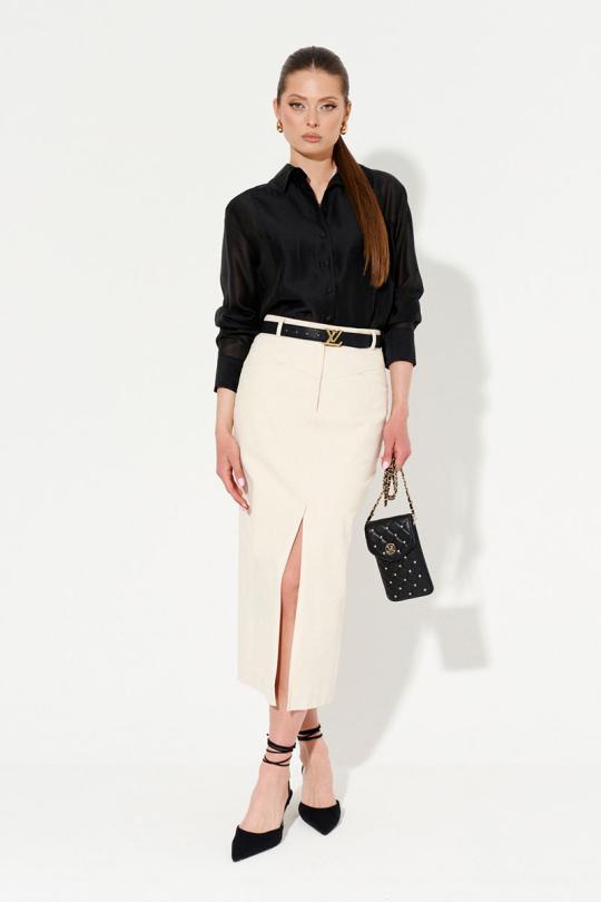 Блузка женская из смесовой ткани с большим содержание хлопка для повседневной носки. Застежка центральная на обметанные петли и пуговицы. По переду имеется отделочная строчка от плечевого шва до края борта. В боковых швах имеются небольшие разрезы. Горловина обработана рубашечным воротником с отрезной стойкой. Рукава втачные длинные, низ рукава обработан притачной манжетой. Застежка в манжете на обметанные петли и пуговицы с дополнительным рядом для регулировки облегания низа рукава. Красивая и легкая блузочка, в которой вам будет очень комфортно, а главное она станет не заменимой вещью в вашем гардеробе.