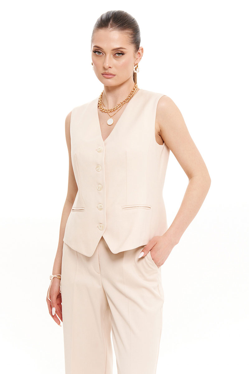 Жилет женский из поливискозной ткани для повседневной носки. Жилет полуприлегающего силуэта. Застежка центральная бортовая на обметанные петли и пуговицы. Перед имеет два рельефа идущих от проймы до линии низа, а также две талиевые вытачки и два прорезных кармана в рамку с двумя обтачками. Спинка со средним швом и двумя рельефами, идущими от проймы до линии низа, а также по спинке имеется две плечевые вытачки. По спинке располагается декоративный хлястик. Горловина обработана пиджачным воротником. Жилет без рукавов. Жилет на подкладке. Стильная жилетка, в которой вы безусловно будете чувствовать себя превосходно.