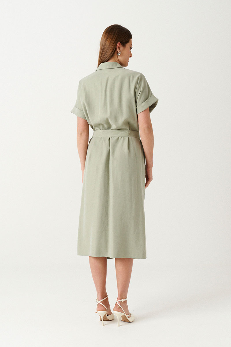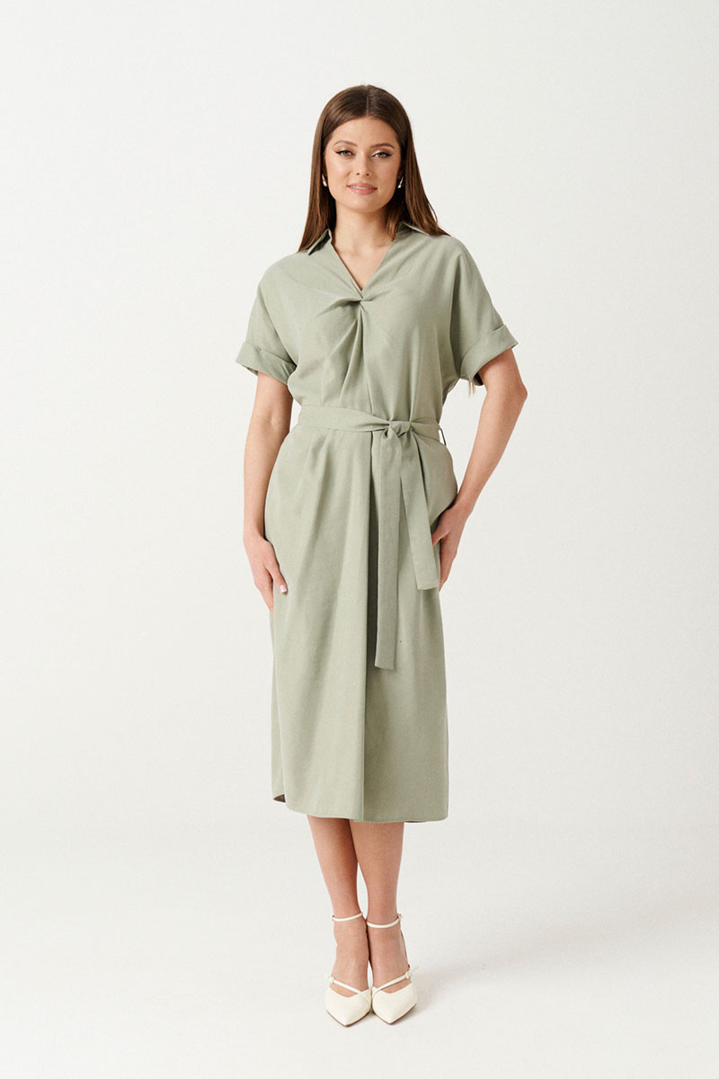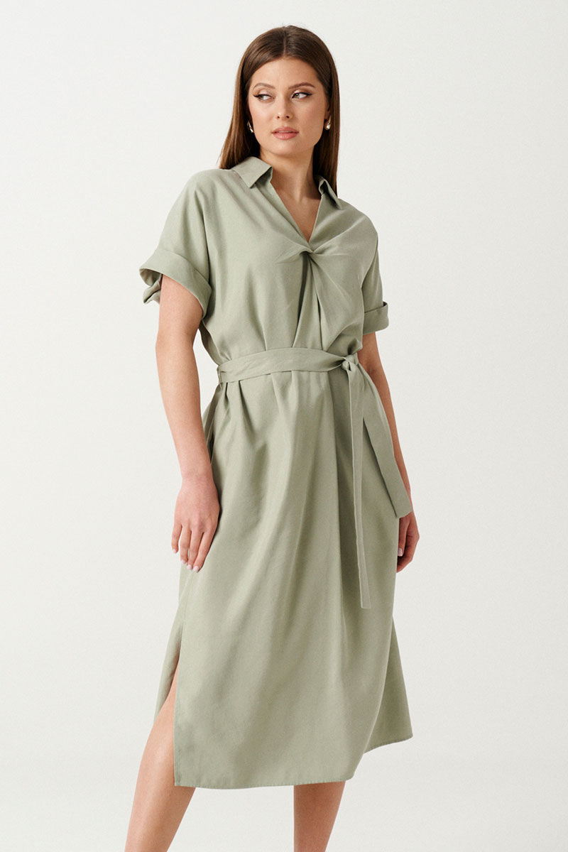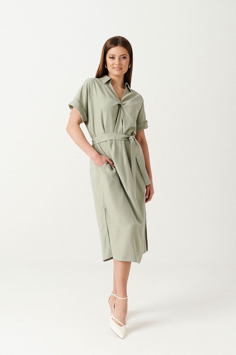 Платье женское из вискозной ткани для повседневной носки. Без подкладки. Платье длинное прямое, рукав короткий, воротник- стойка. На передней части платья декоративный элемент на груди. В боковых швах прорезные карманы, разрезы. Есть шлевки. Платье укомплектовано поясом из основной ткани изделия.