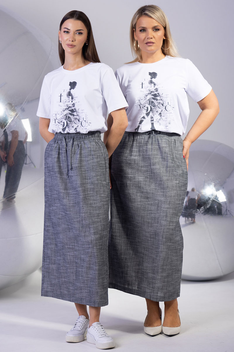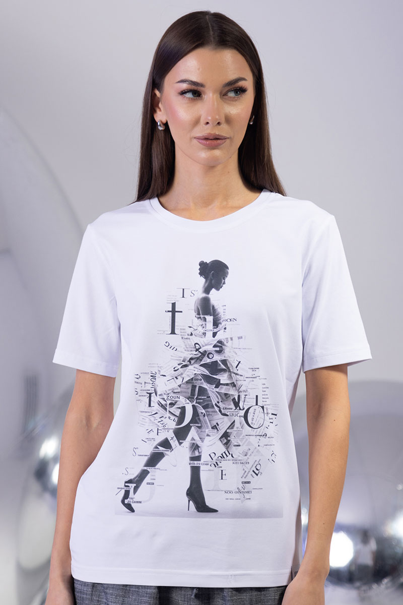 Футболка украшена разнообразными принтами — от минималистичных геометрических узоров до ярких графических иллюстраций. Выбирайте принты под настроение: урбанистические надписи,