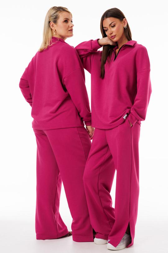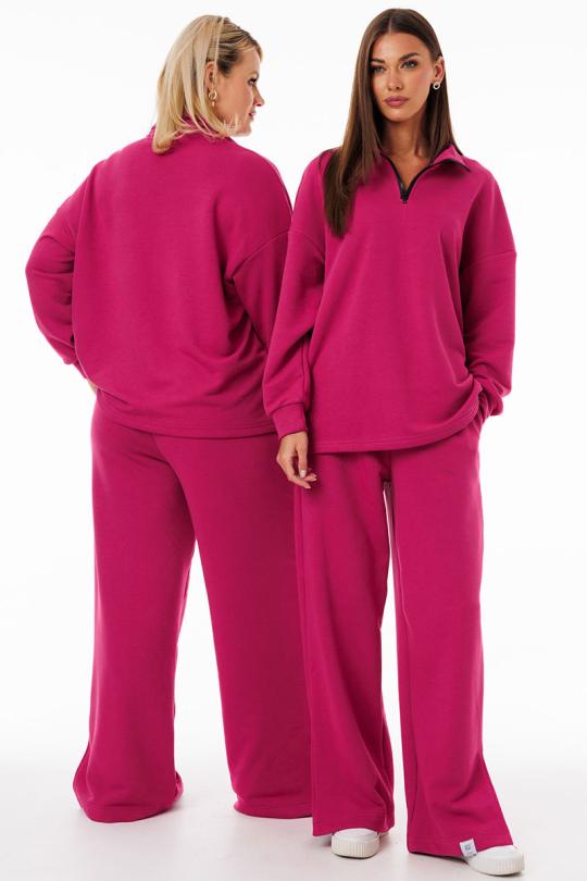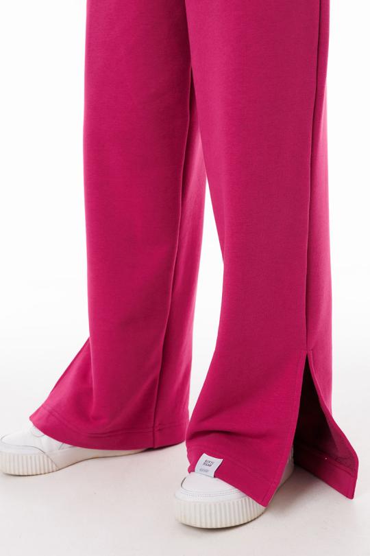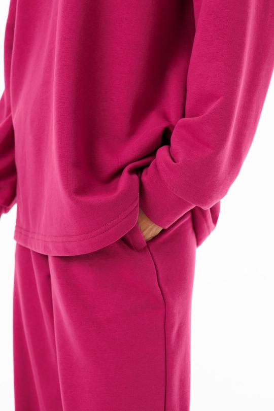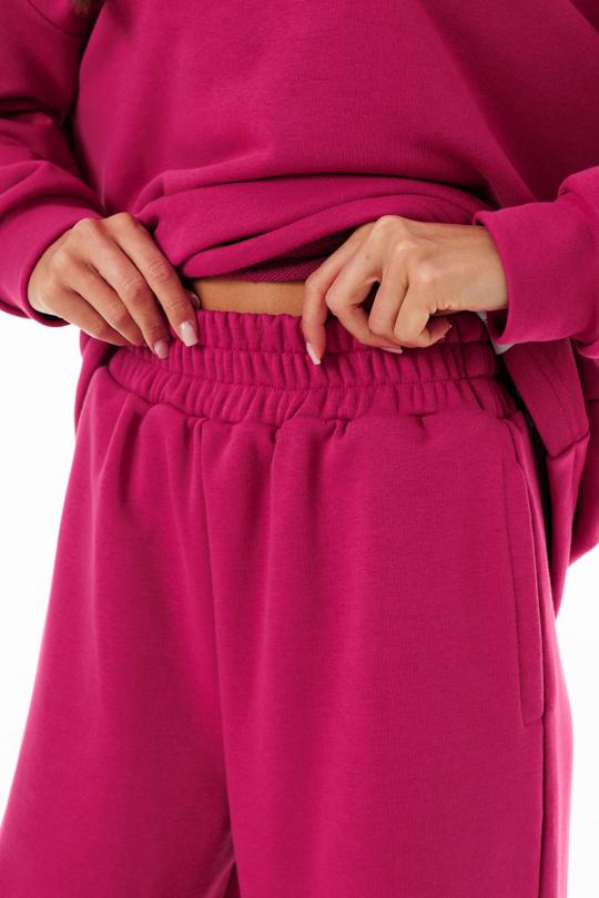 Брюки выполнены из трехниточного футера — плотной, но дышащей ткани с изнаночной петельной основой. Такой материал обеспечивает мягкость прилегания, сохраняет тепло в прохладную
