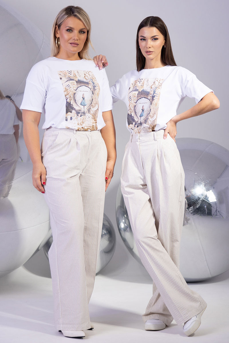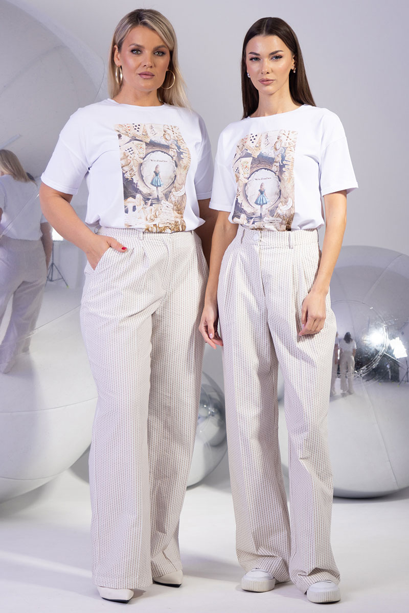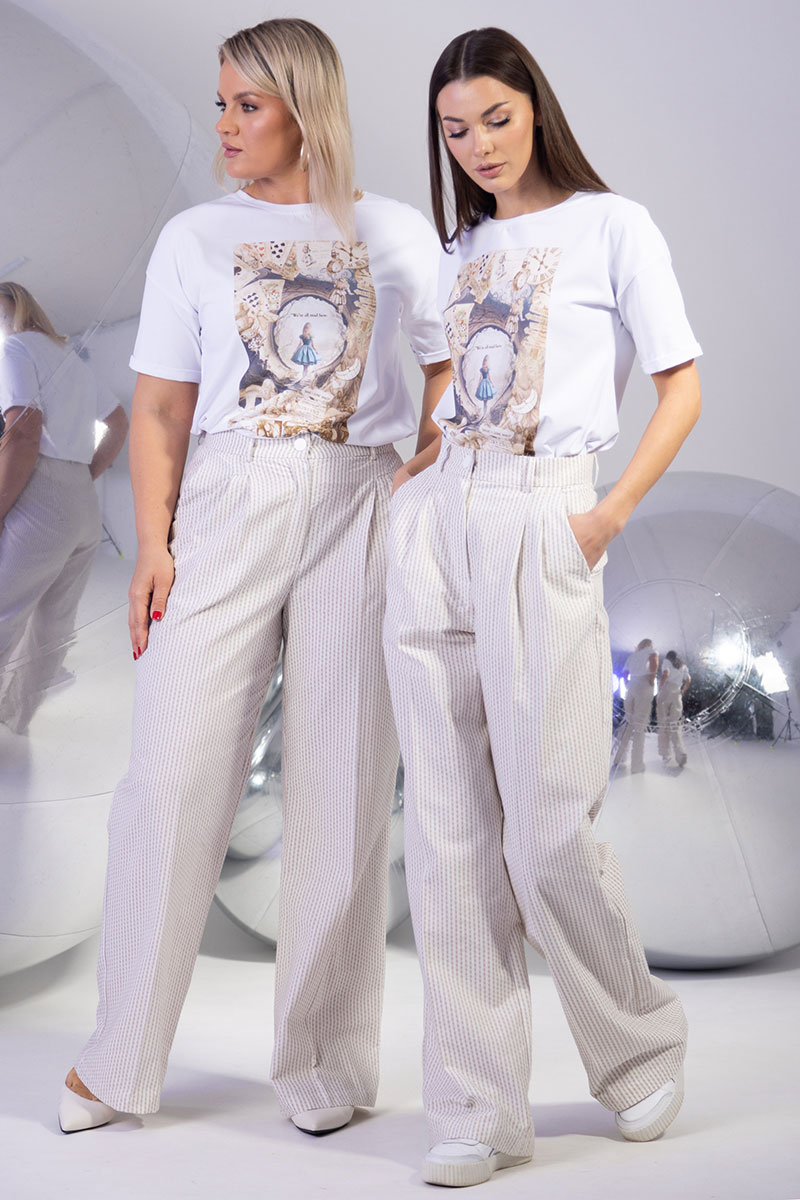 Вертикальная полоска в мелкий рисунок визуально вытягивает силуэт, добавляя образу стройности и динамики. Эта деталь делает модель универсальной: брюки легко комбинировать с
