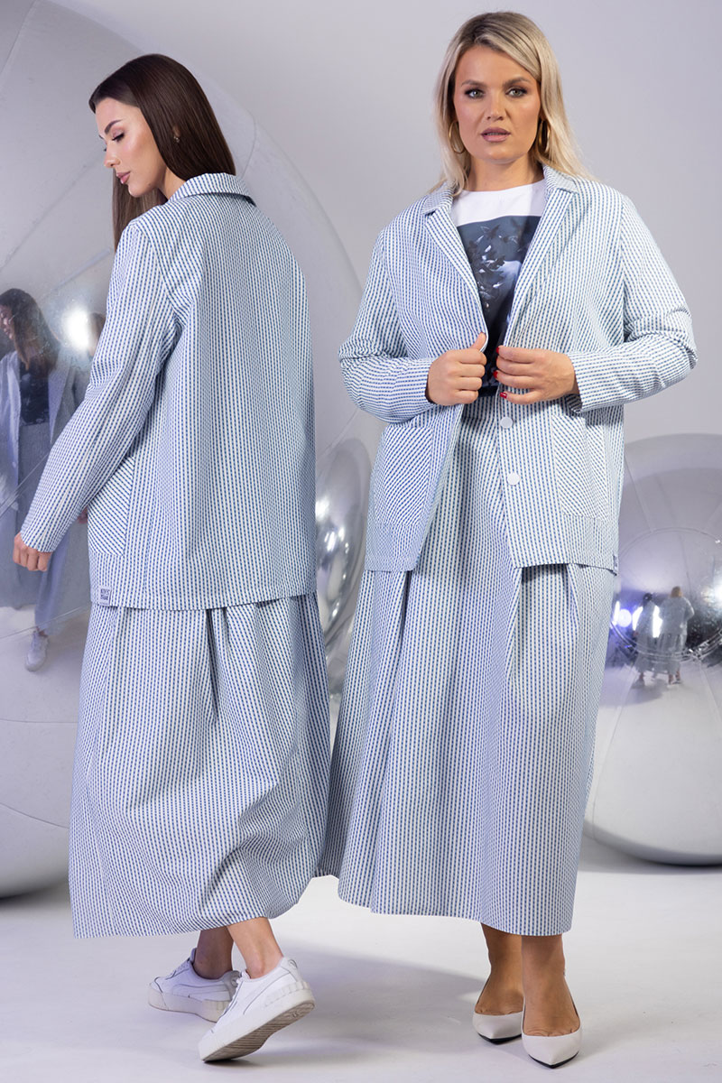 гарантирует комфорт в течение всего дня благодаря мягкости, дышащим свойствам и легкой тянущейся структуре. Узкая вертикальная полоска на полотне визуально удлиняет силуэт, добавляя