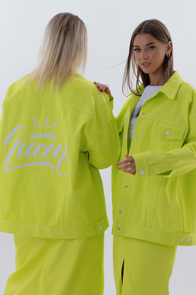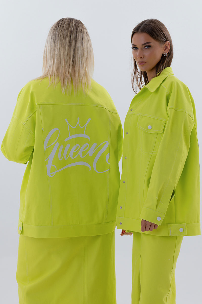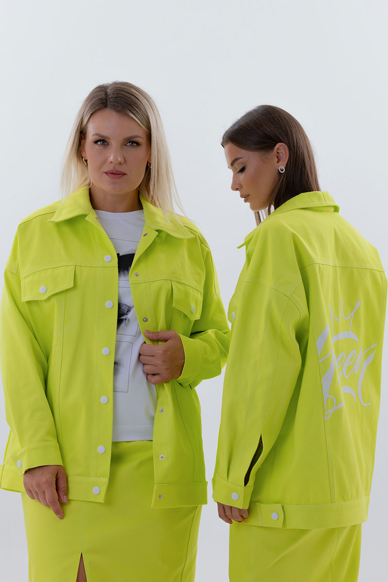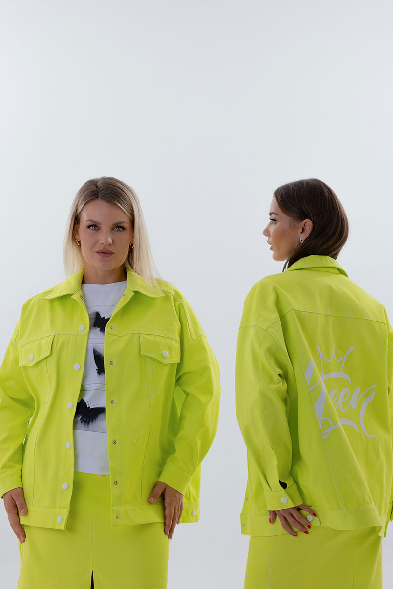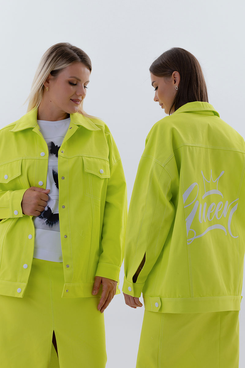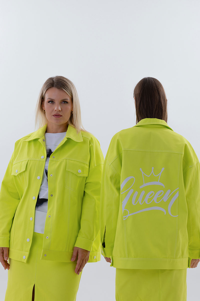 современный оверсайз-эффект, а яркий принт на спине превращает жакет в арт-объект, притягивающий взгляды. Накладные карманы с клапанами подчеркивают брутальный характер, а спущенные