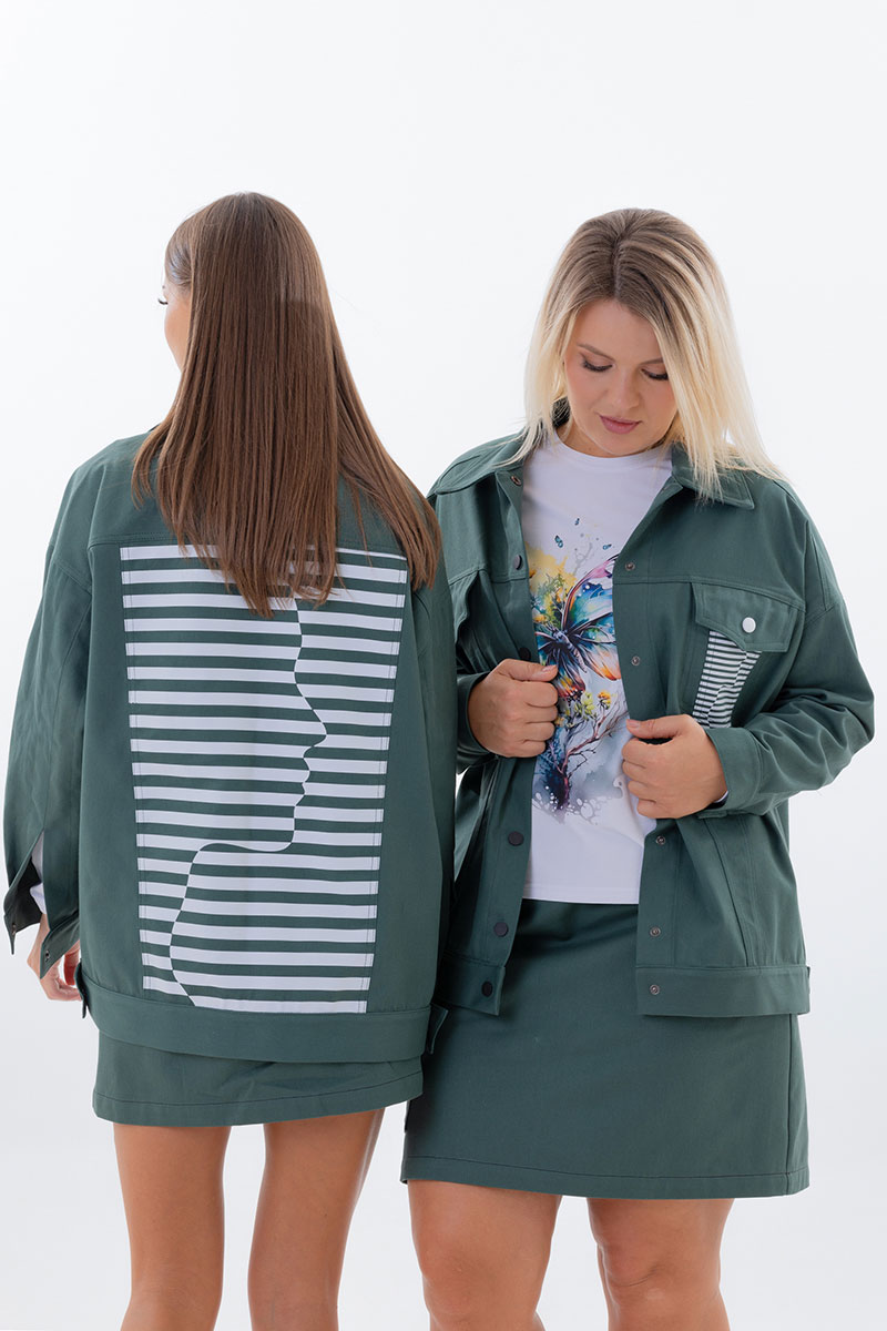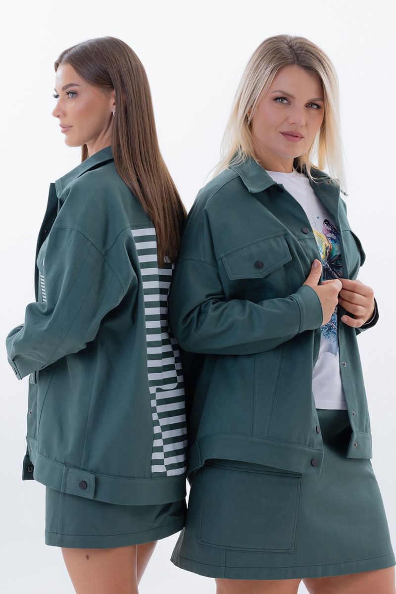 современный оверсайз-эффект, а яркий принт на спине превращает жакет в арт-объект, притягивающий взгляды. Накладные карманы с клапанами подчеркивают брутальный характер, а спущенные