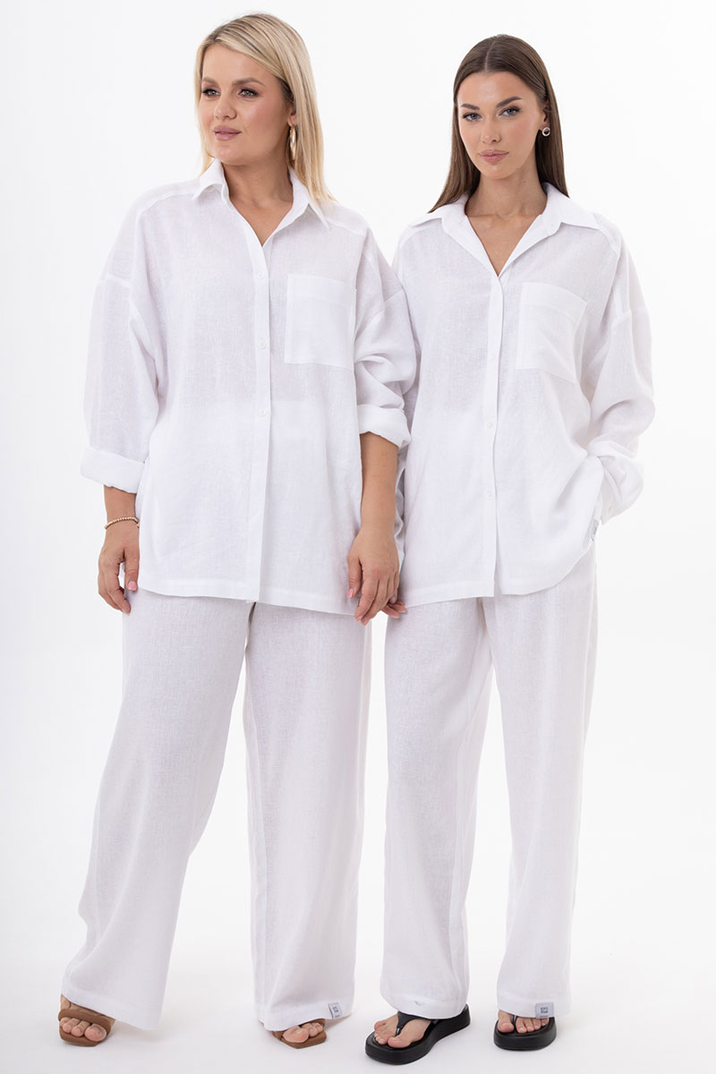 Элегантный женский костюм из белорусского льна с вискозой — гармония стиля, комфорта и экологичности. Комплект премиум-класса включает блузу и брюки свободного прямого кроя, созданные