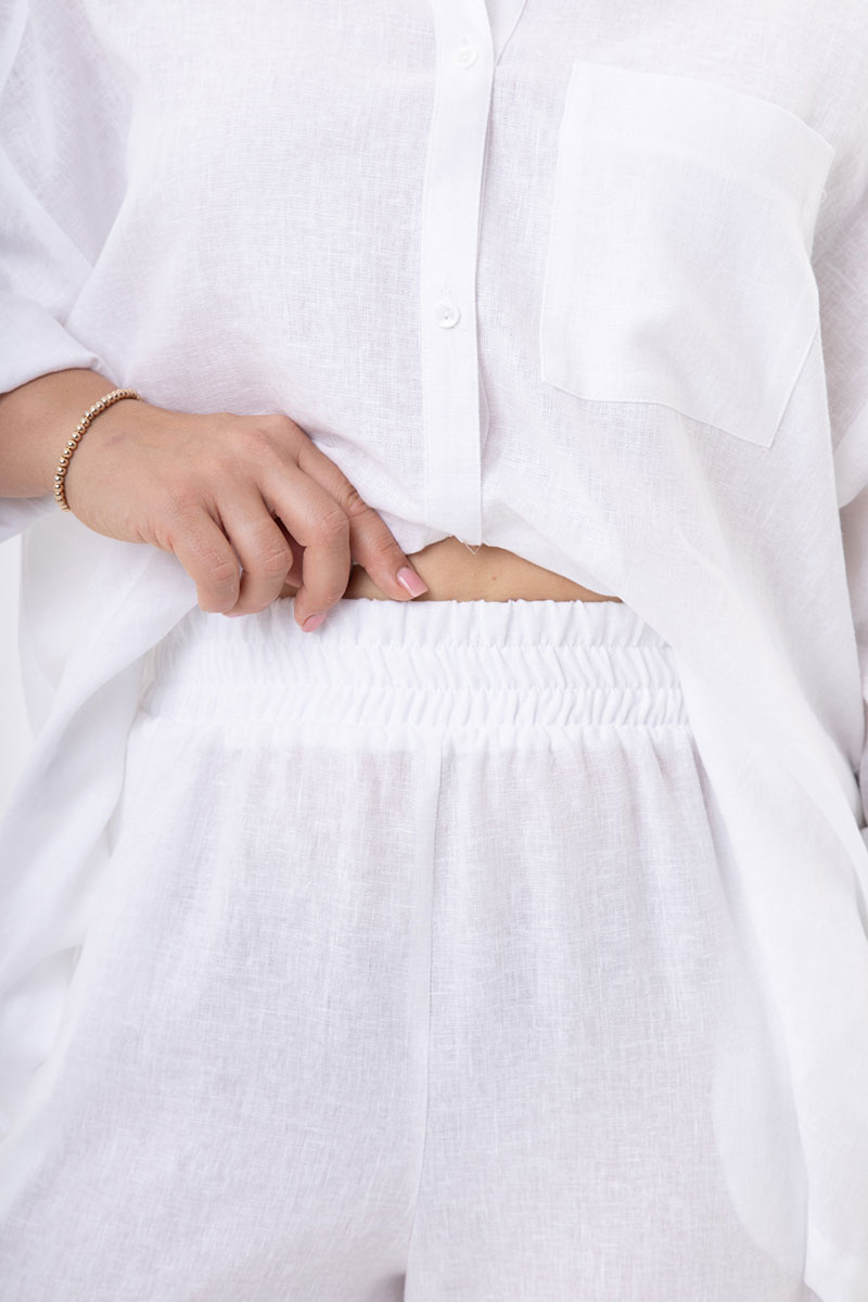 Блуза: Изысканный крой с аккуратным воротником и натуральной текстурой льна подчеркивает женственность. Легкий силуэт идеально сочетается с брюками, создавая целостный лук для офиса,