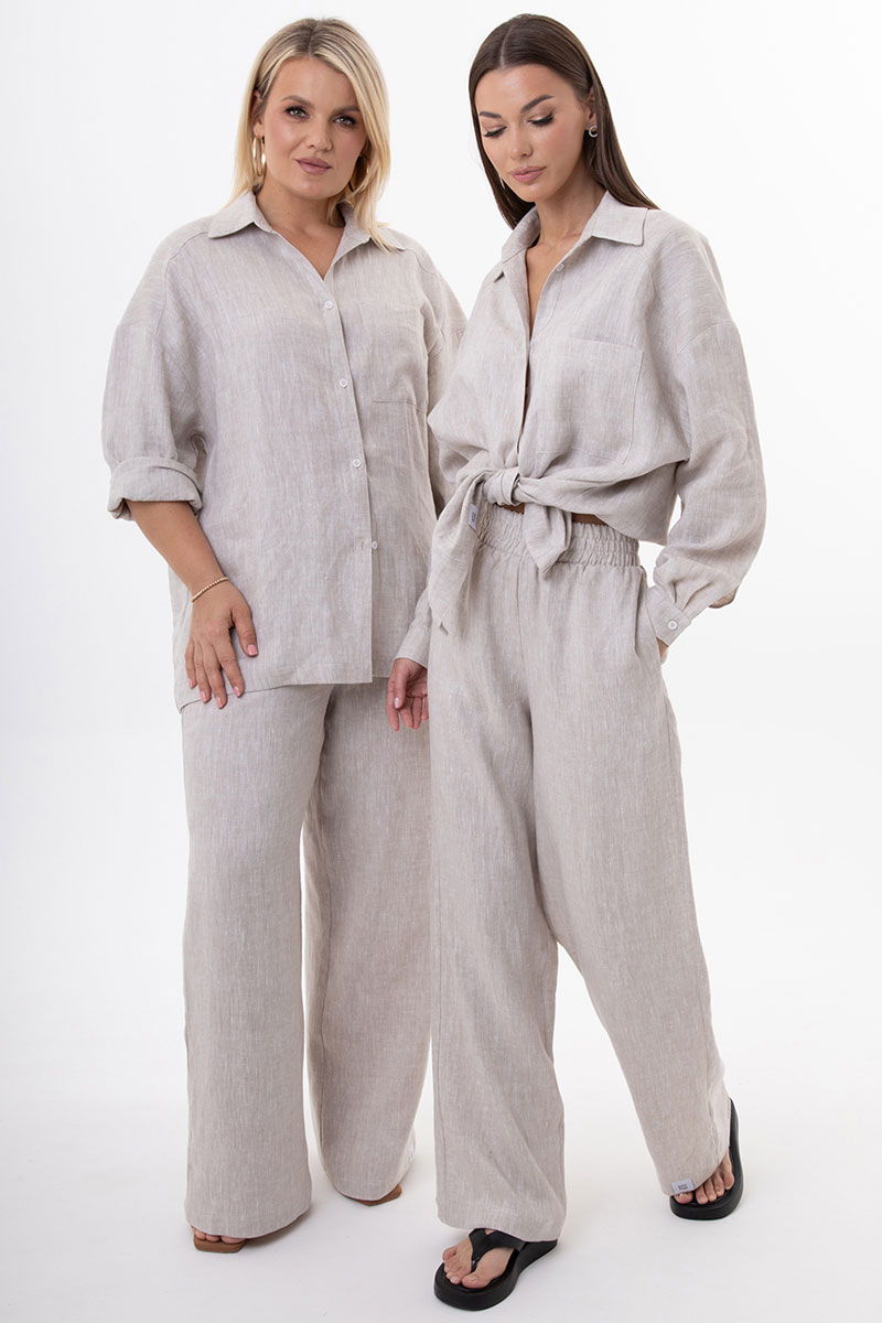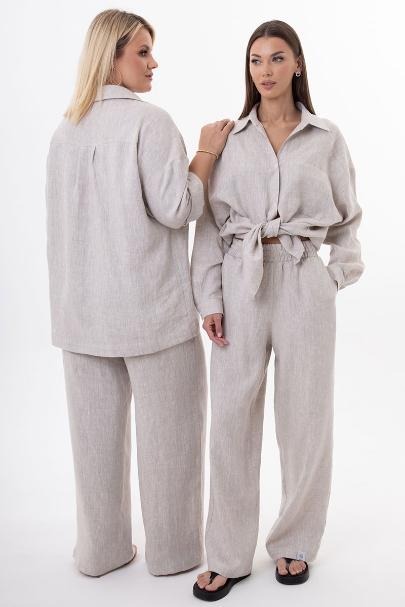 Блуза: Изысканный крой с аккуратным воротником и натуральной текстурой льна подчеркивает женственность. Легкий силуэт идеально сочетается с брюками, создавая целостный лук для офиса,
