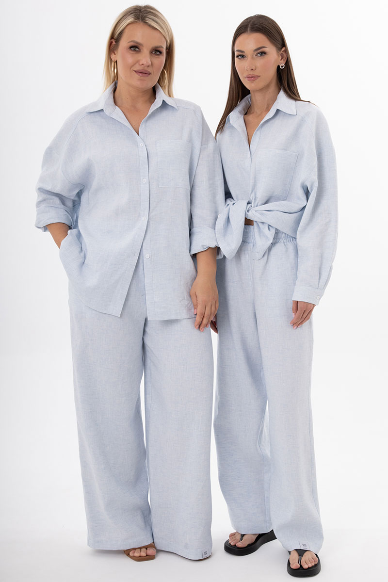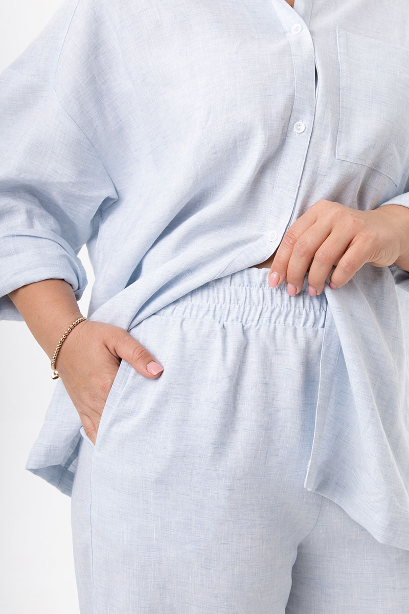 Блуза: Изысканный крой с аккуратным воротником и натуральной текстурой льна подчеркивает женственность. Легкий силуэт идеально сочетается с брюками, создавая целостный лук для офиса,
