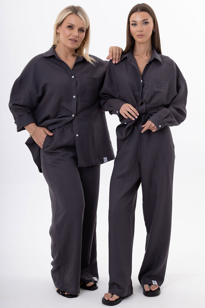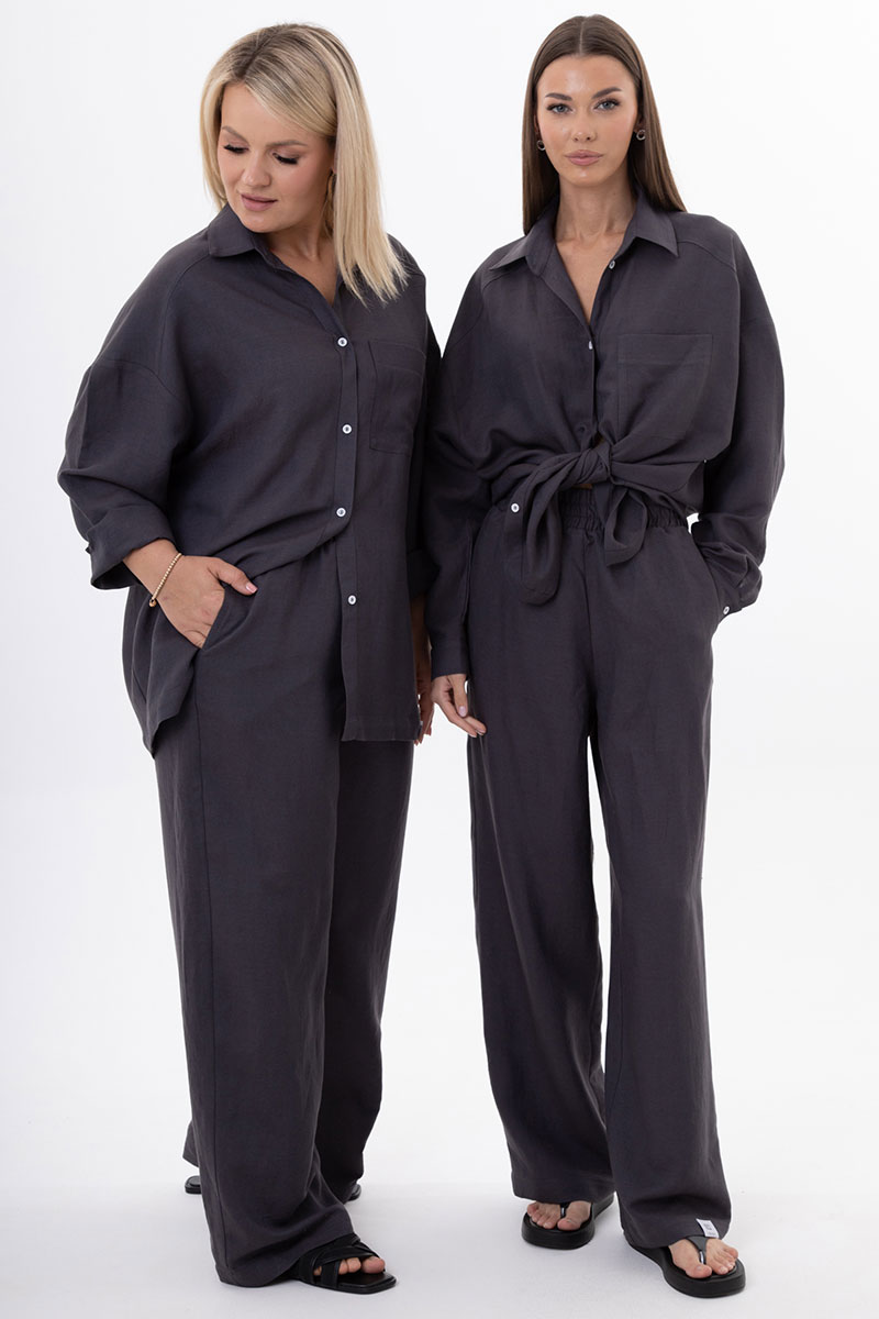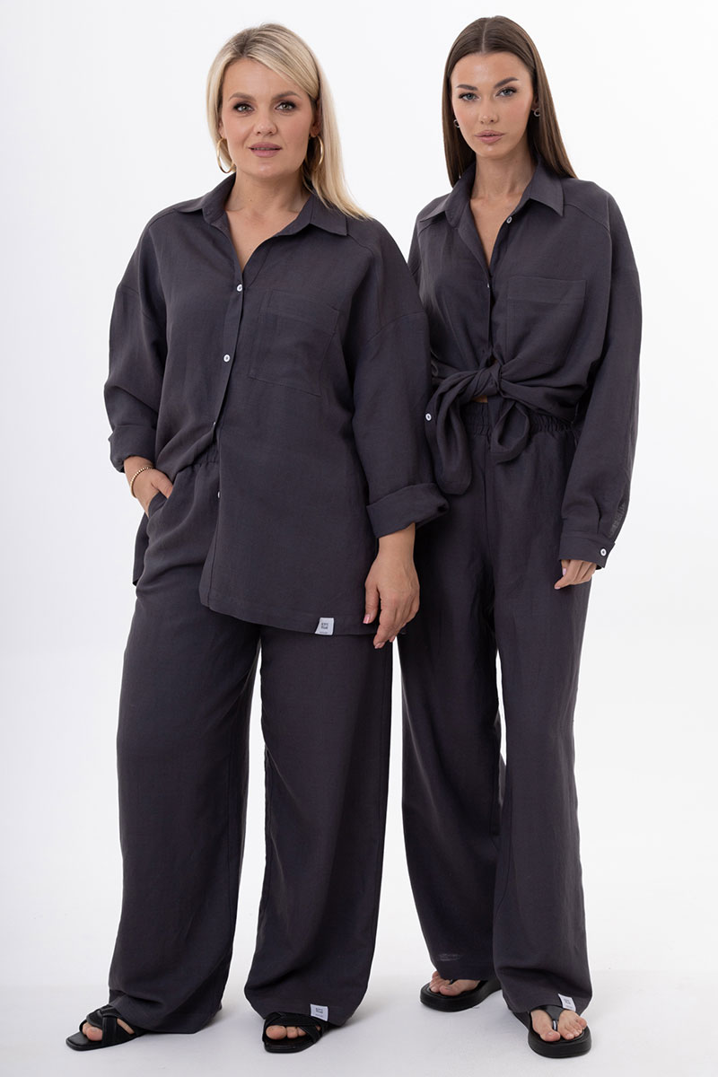 Элегантный женский костюм из белорусского льна с вискозой — гармония стиля, комфорта и экологичности. Комплект премиум-класса включает блузу и брюки свободного прямого кроя, созданные