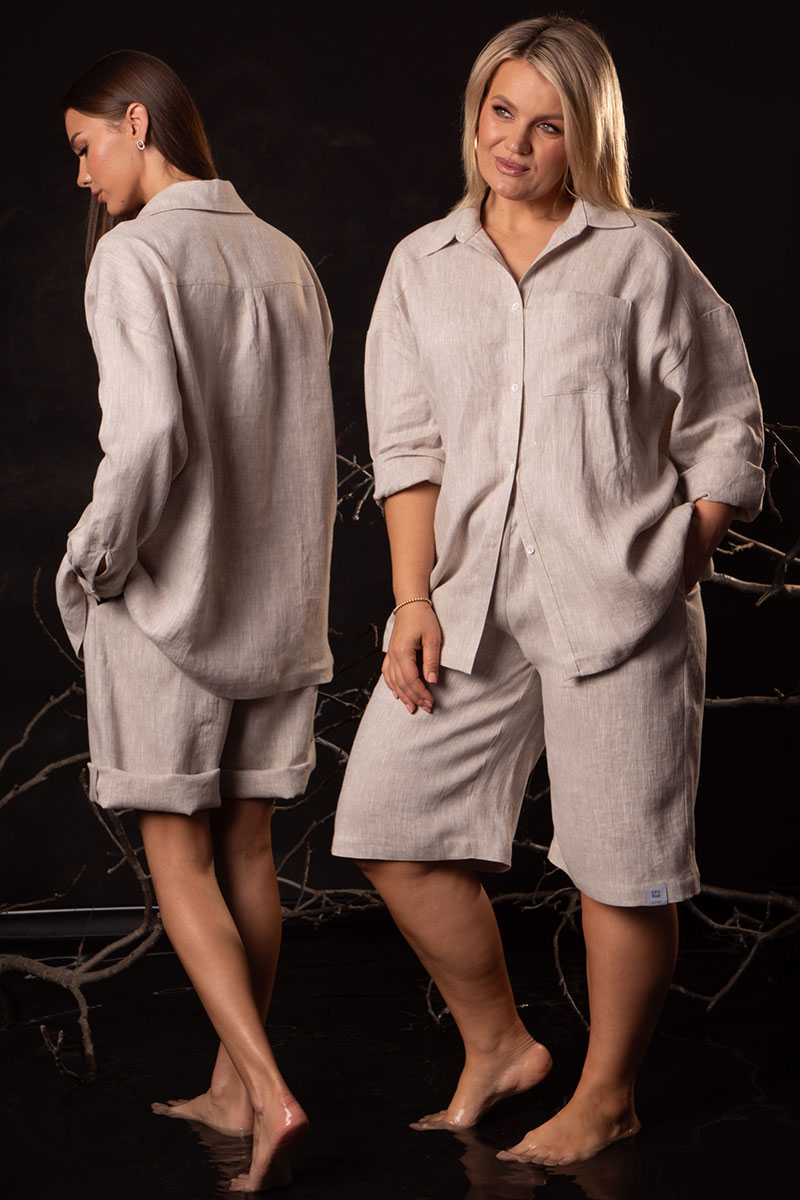 Блуза: Утонченный фасон с аккуратным воротником и натуральной текстурой льна подчеркивает женственность. Свободный крой и лаконичный дизайн делают ее идеальной парой для шорт,