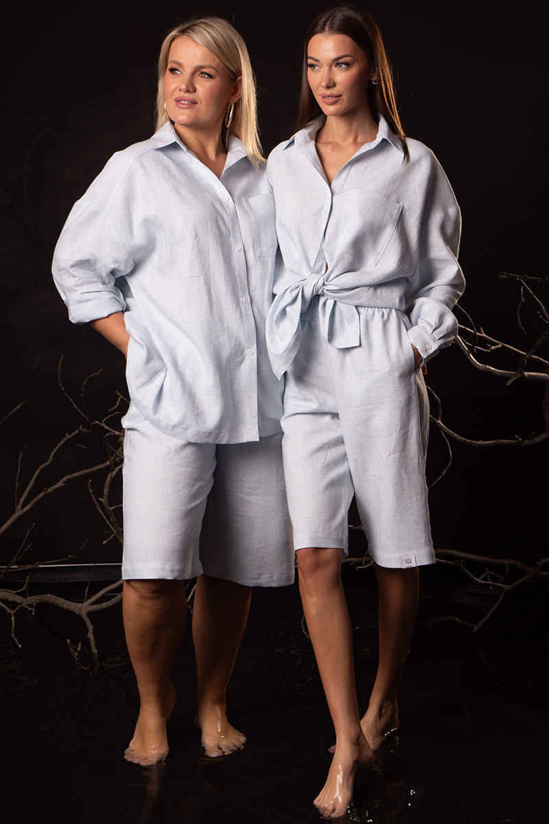 Блуза: Утонченный фасон с аккуратным воротником и натуральной текстурой льна подчеркивает женственность. Свободный крой и лаконичный дизайн делают ее идеальной парой для шорт,