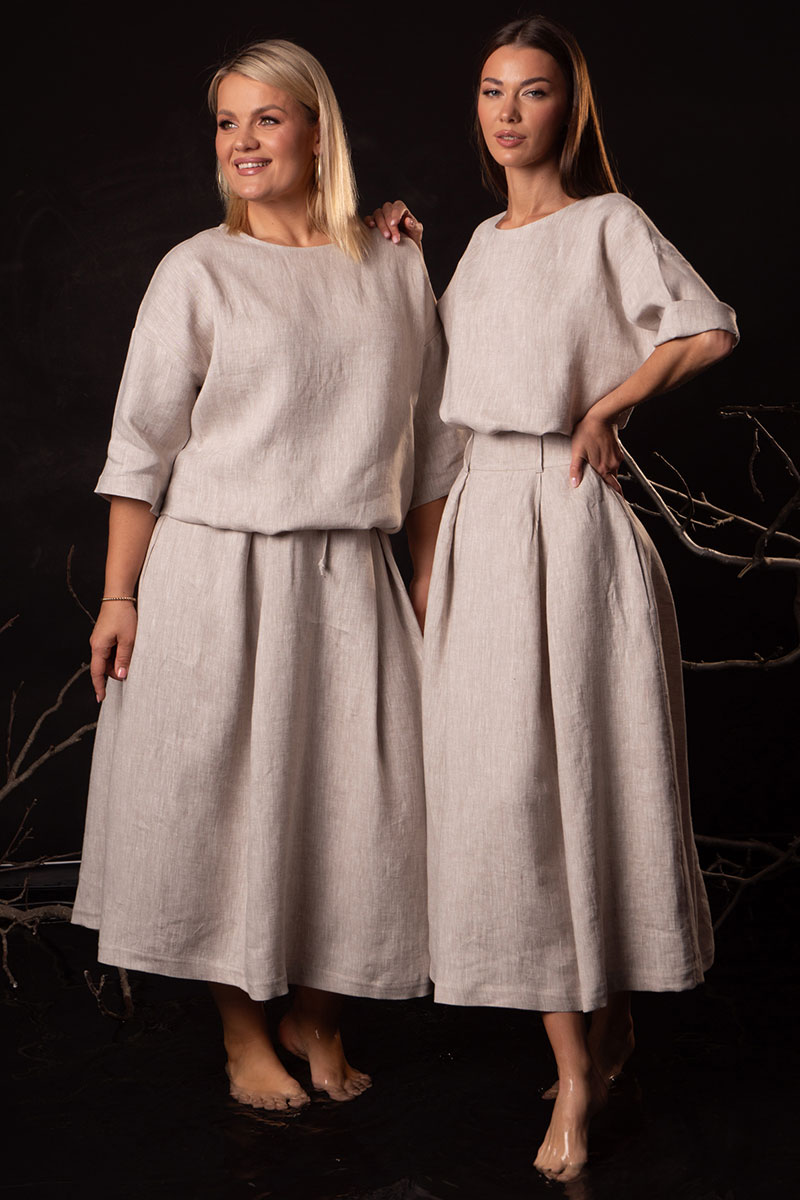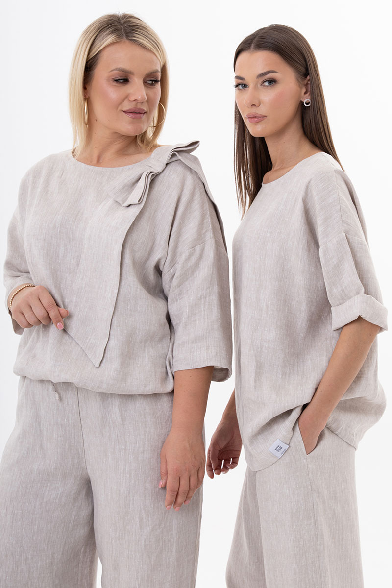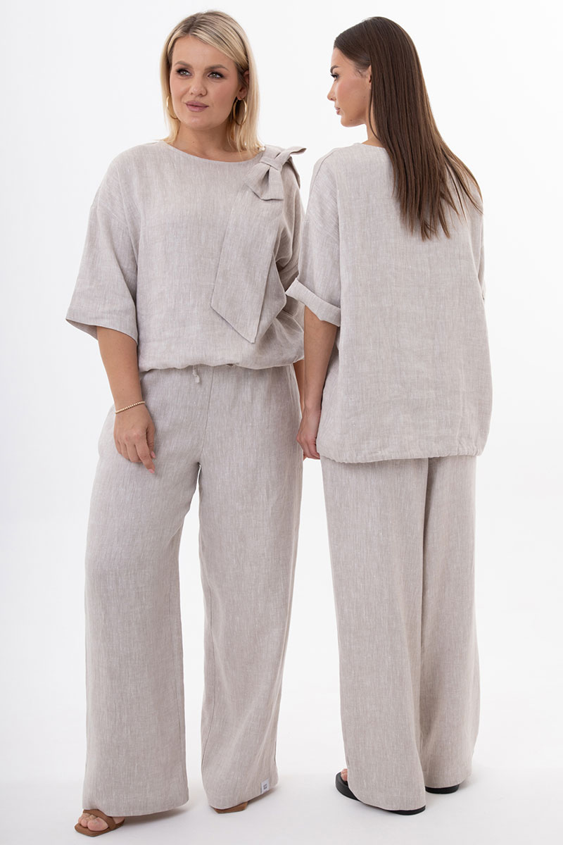 из премиального льна с вискозой белорусского производства, он сочетает легкость натуральных материалов, мягкость и эластичность, обеспечивая комфорт в течение всего дня. Съемный бант