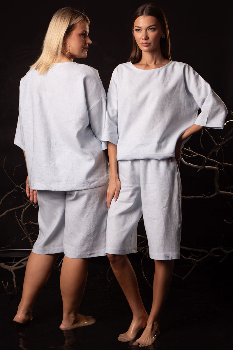из премиального льна с вискозой белорусского производства, он сочетает легкость натуральных материалов, мягкость и эластичность, обеспечивая комфорт в течение всего дня. Съемный бант