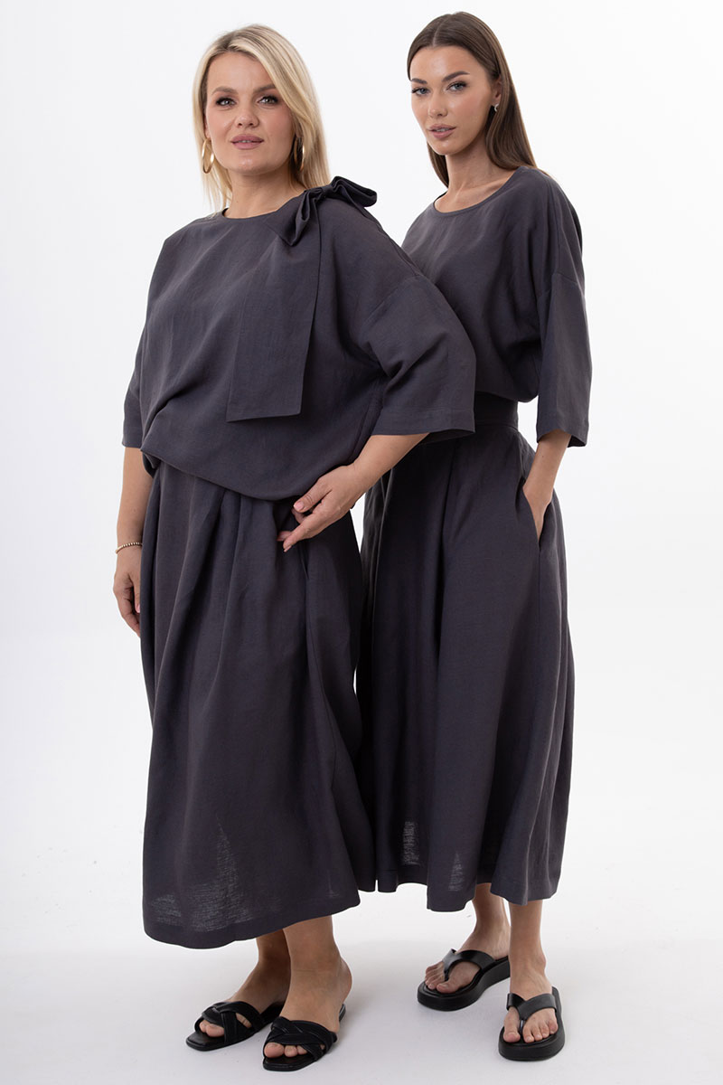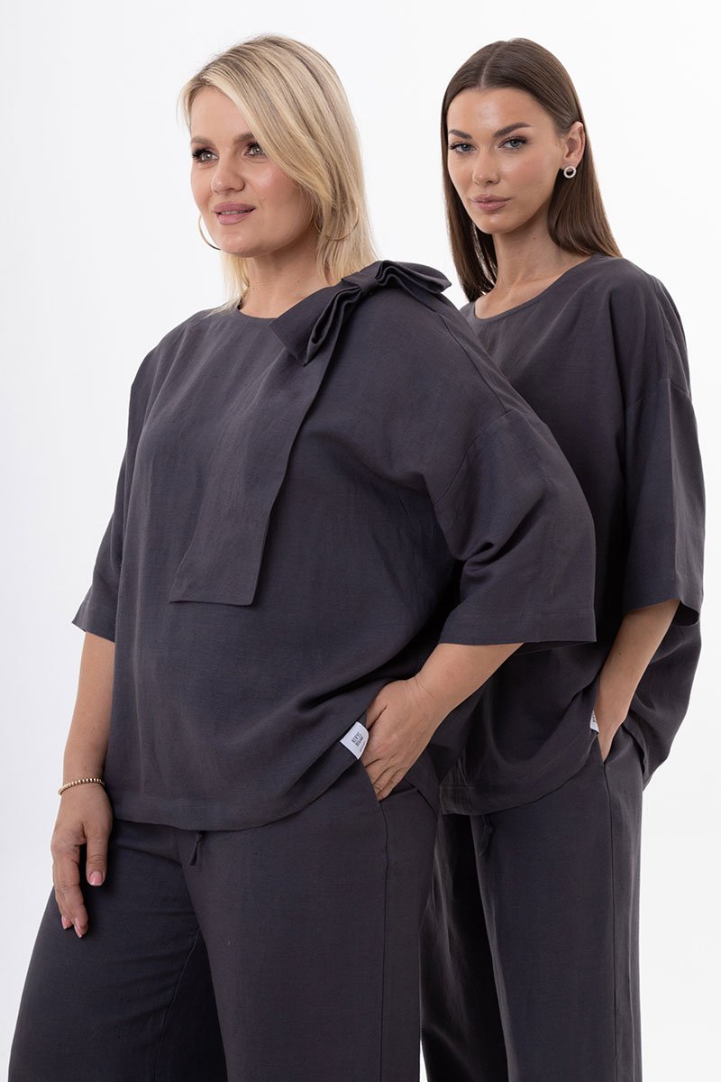 из премиального льна с вискозой белорусского производства, он сочетает легкость натуральных материалов, мягкость и эластичность, обеспечивая комфорт в течение всего дня. Съемный бант