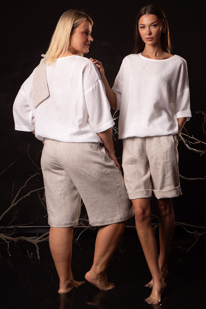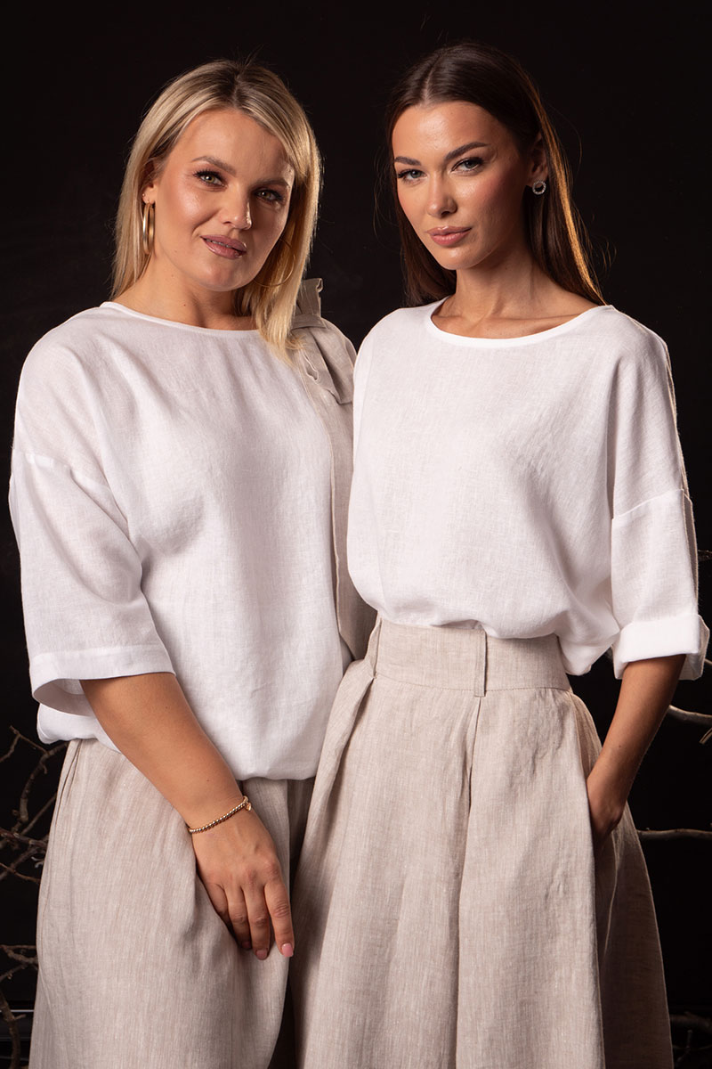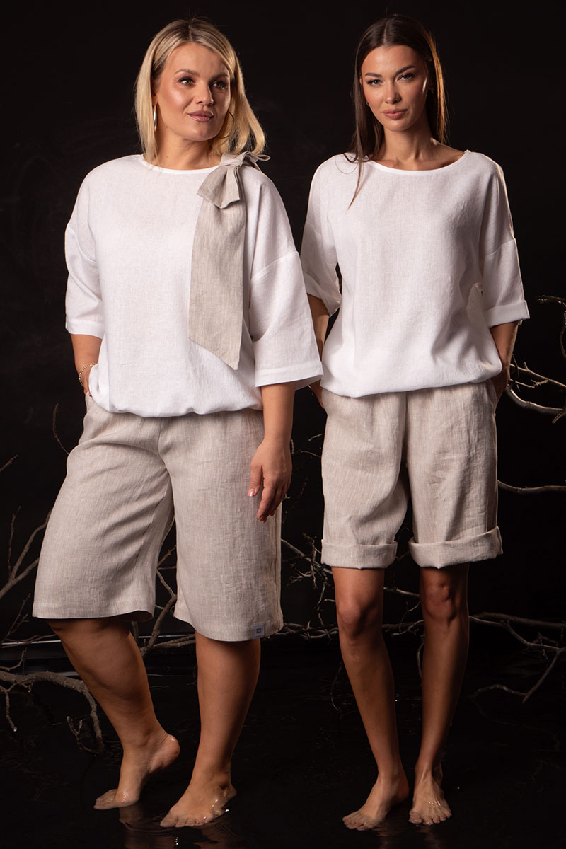 из премиального льна с вискозой белорусского производства, он сочетает легкость натуральных материалов, мягкость и эластичность, обеспечивая комфорт в течение всего дня. Съемный бант