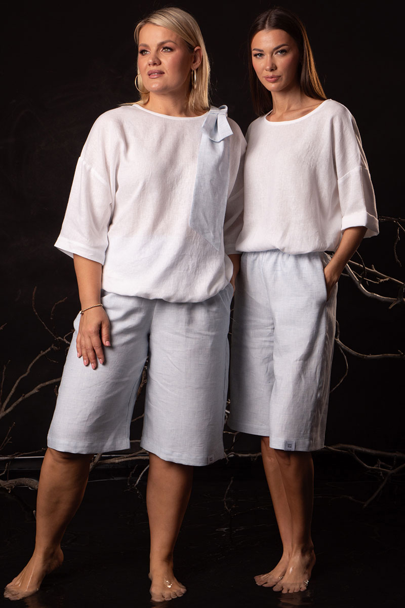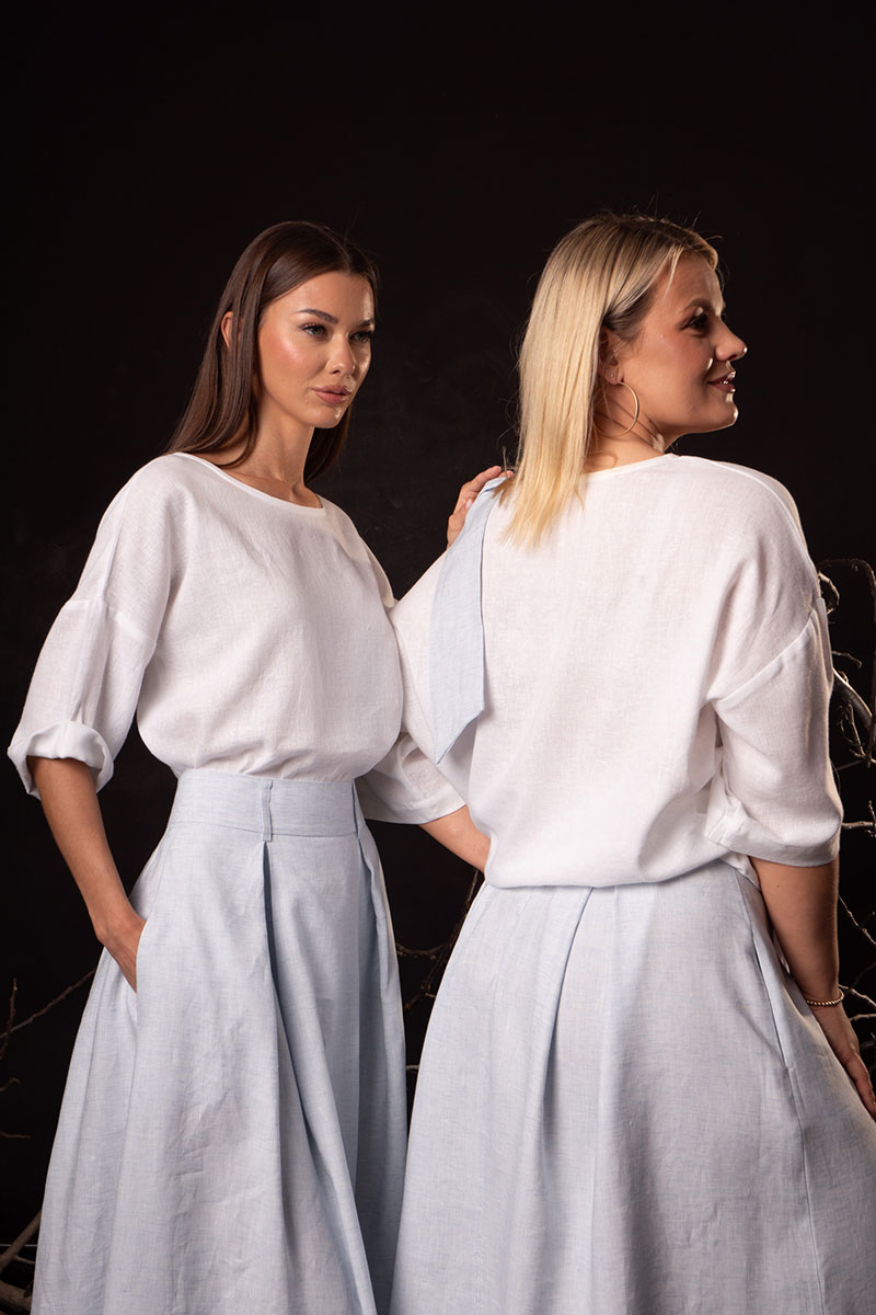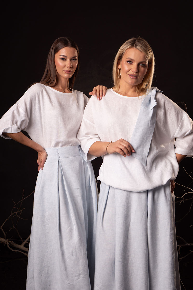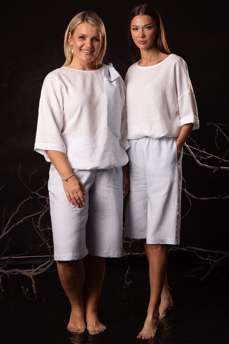 из премиального льна с вискозой белорусского производства, он сочетает легкость натуральных материалов, мягкость и эластичность, обеспечивая комфорт в течение всего дня. Съемный бант
