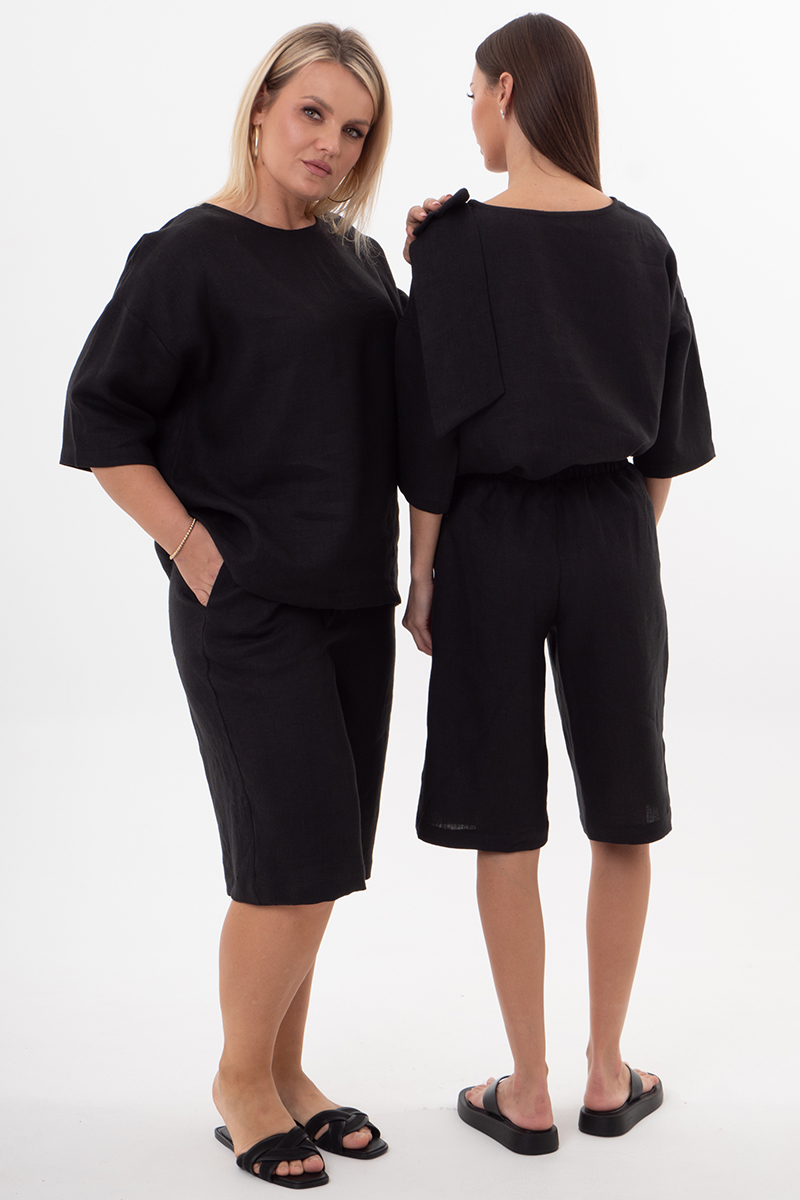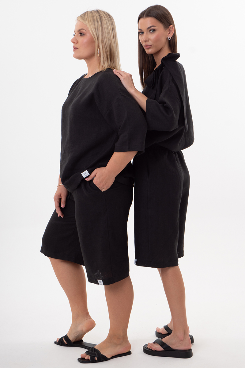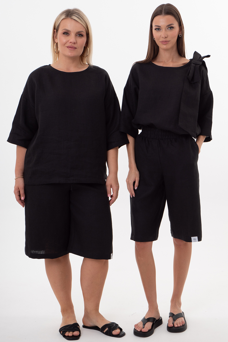 Женский костюм из льна с вискозой премиум-класса. Комплект: джемпер со съемным бантом в комплекте и шорты.