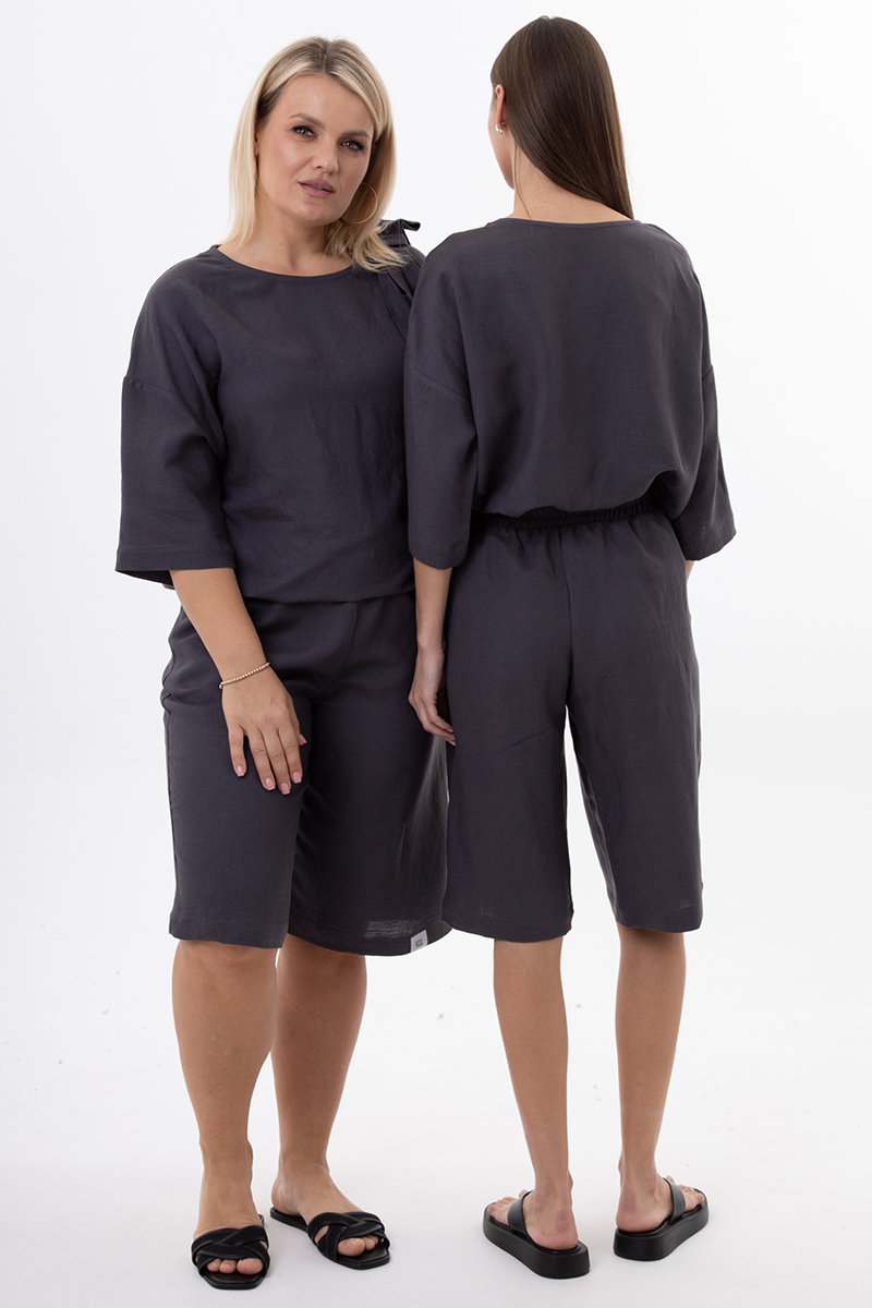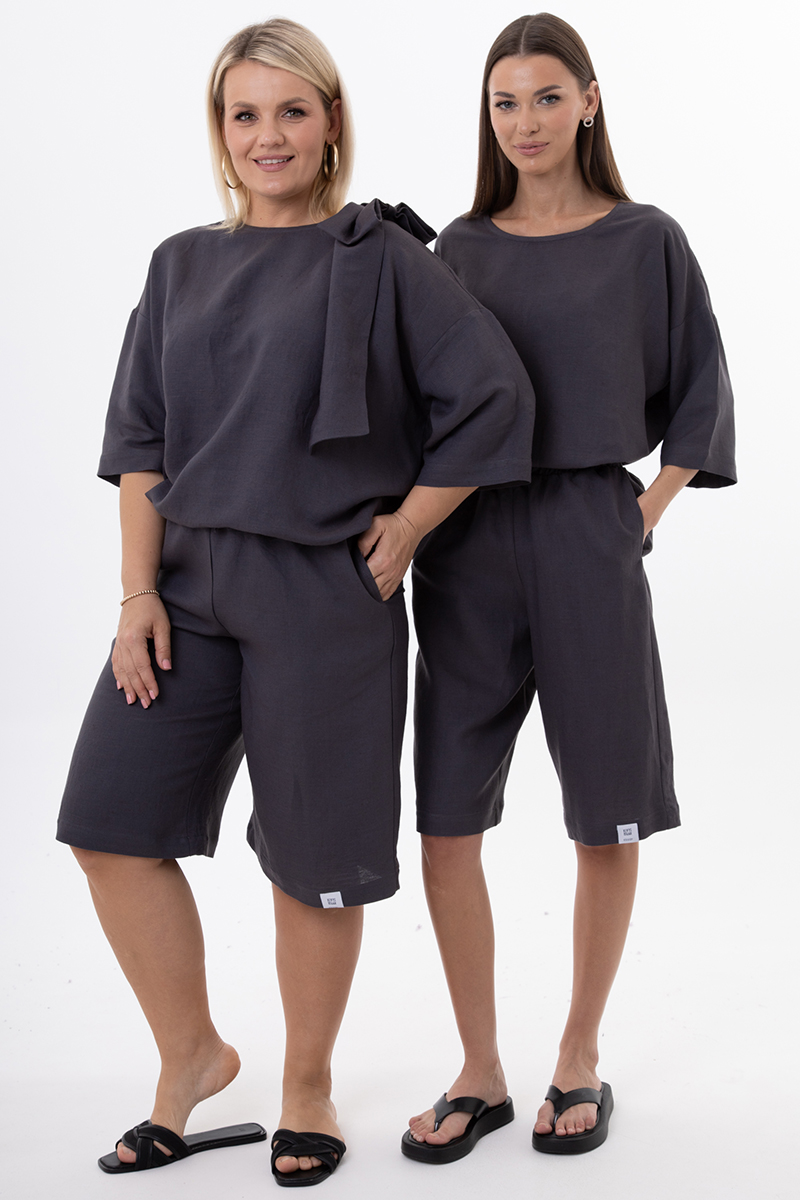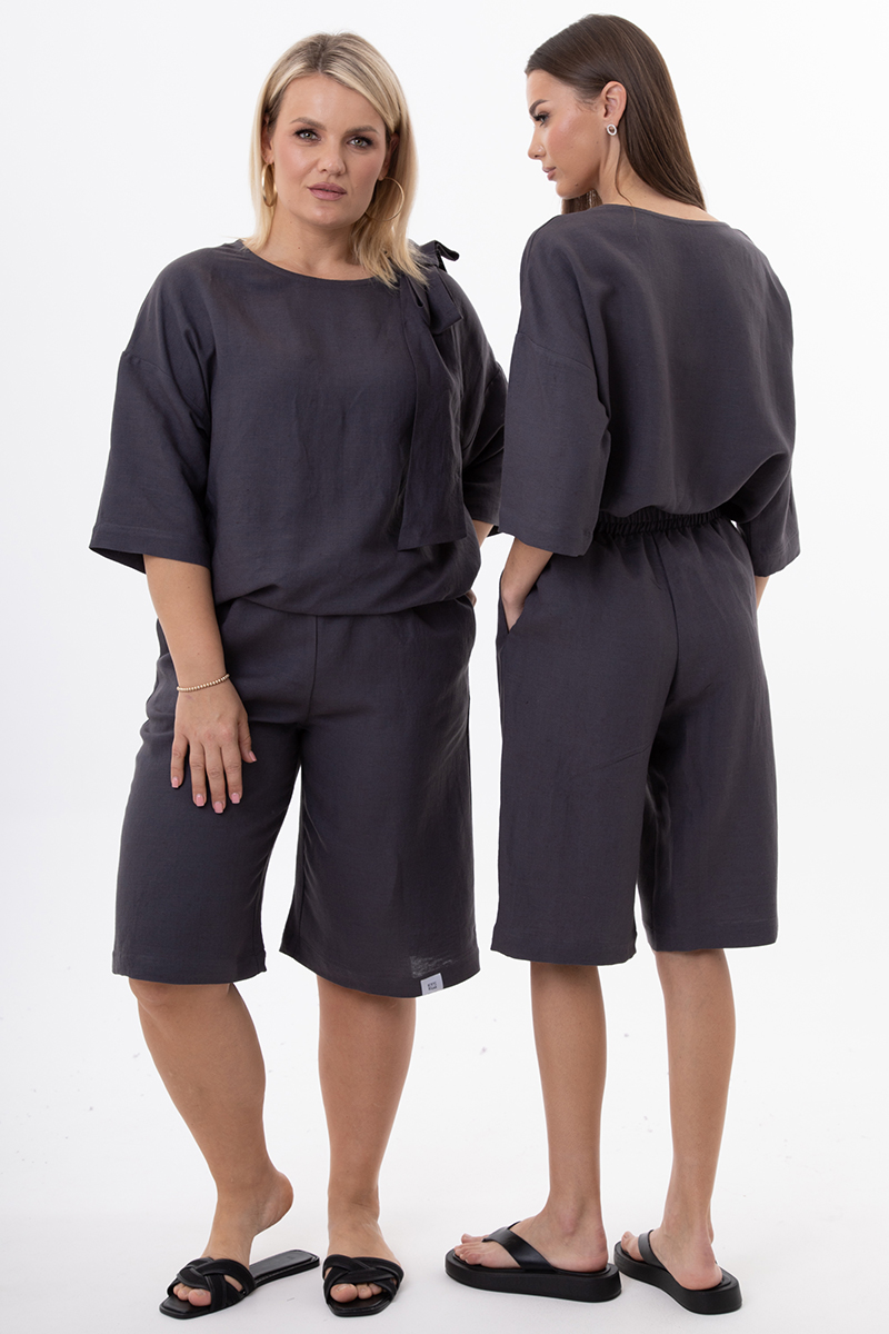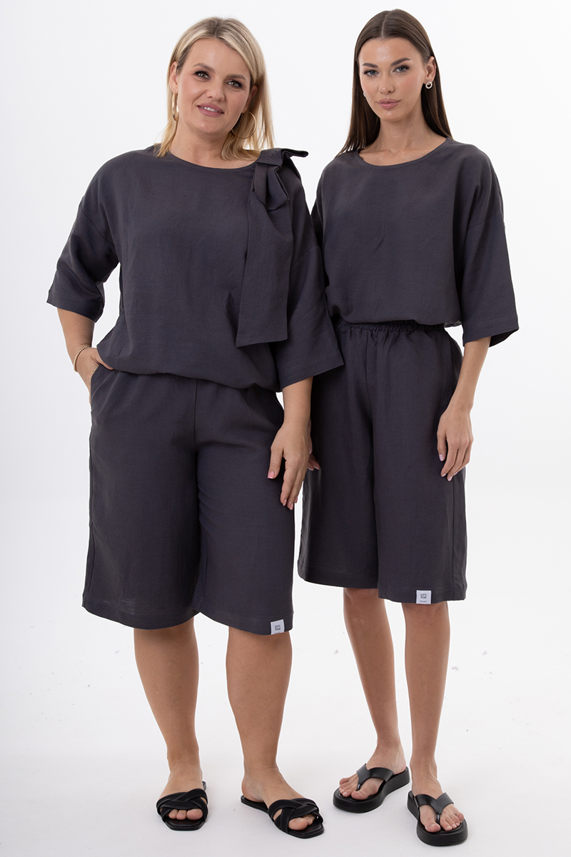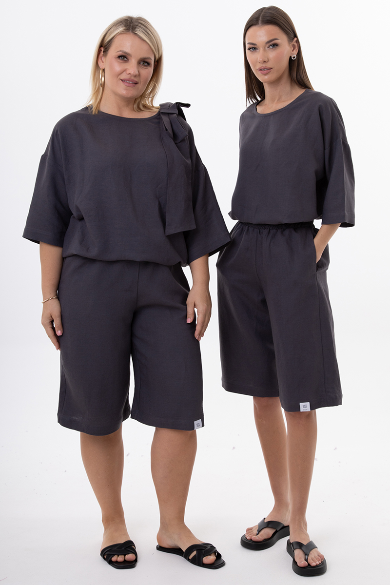 Женский костюм из льна с вискозой премиум-класса. Комплект: джемпер со съемным бантом в комплекте и шорты.