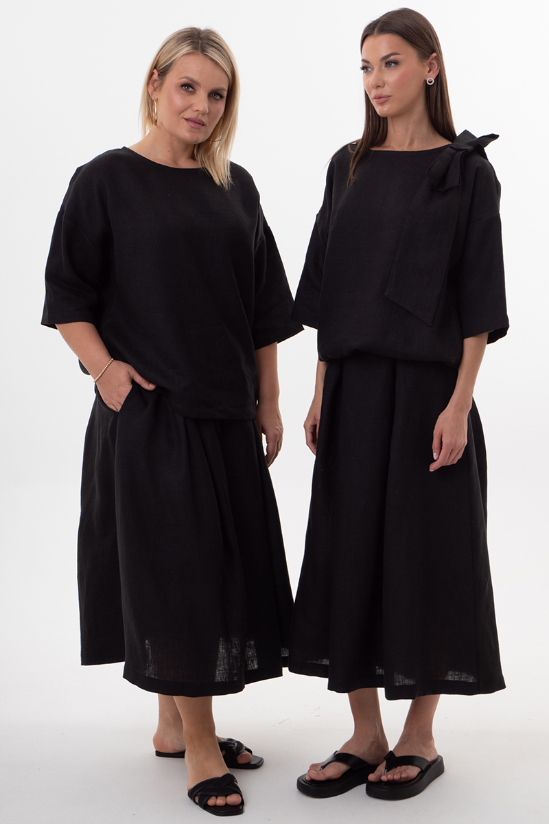 Элегантный костюм премиум-класса из белорусского льна с вискозой премиального качества — идеальный баланс романтики, практичности и экологичности. Набор включает джемпер свободного