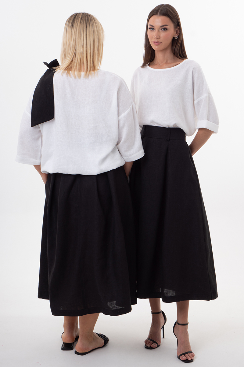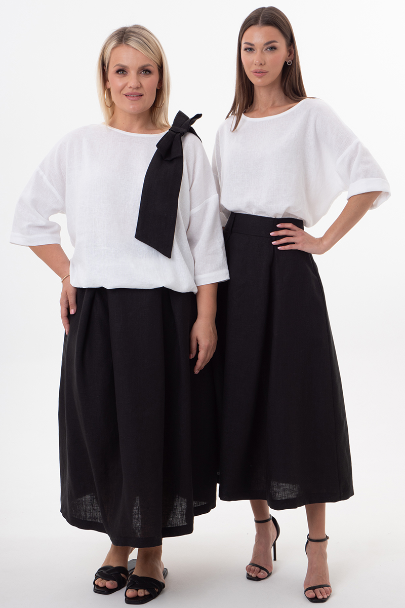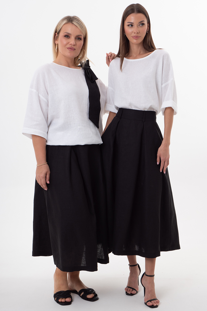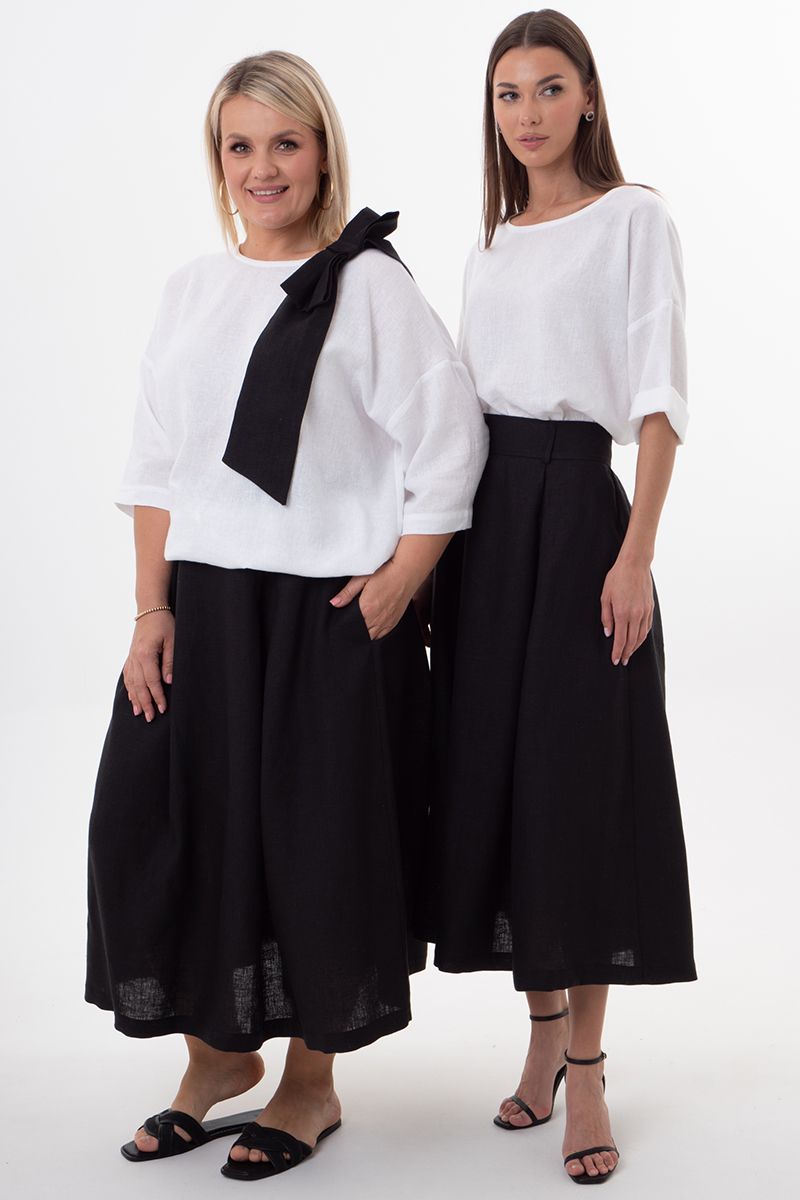 Элегантный костюм премиум-класса из белорусского льна с вискозой премиального качества — идеальный баланс романтики, практичности и экологичности. Набор включает джемпер свободного
