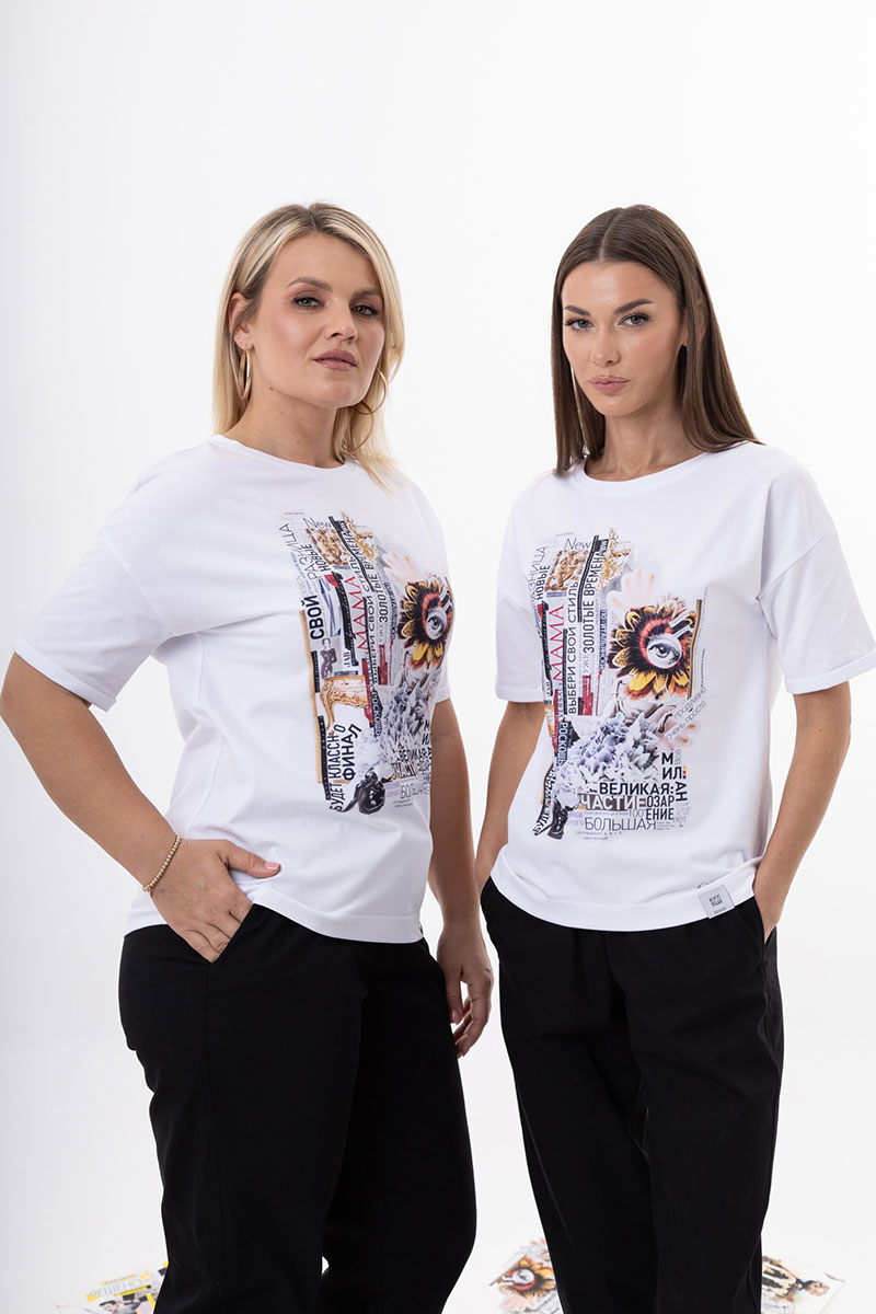 Уникальная футболка воплощающая творческий дух коллаборации с талантливой художницей Ольгой Южик. На футболках нанесены эксклюзивные принты, созданные по мотивам её картин, которые