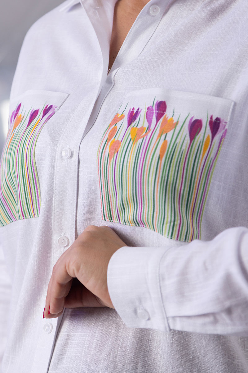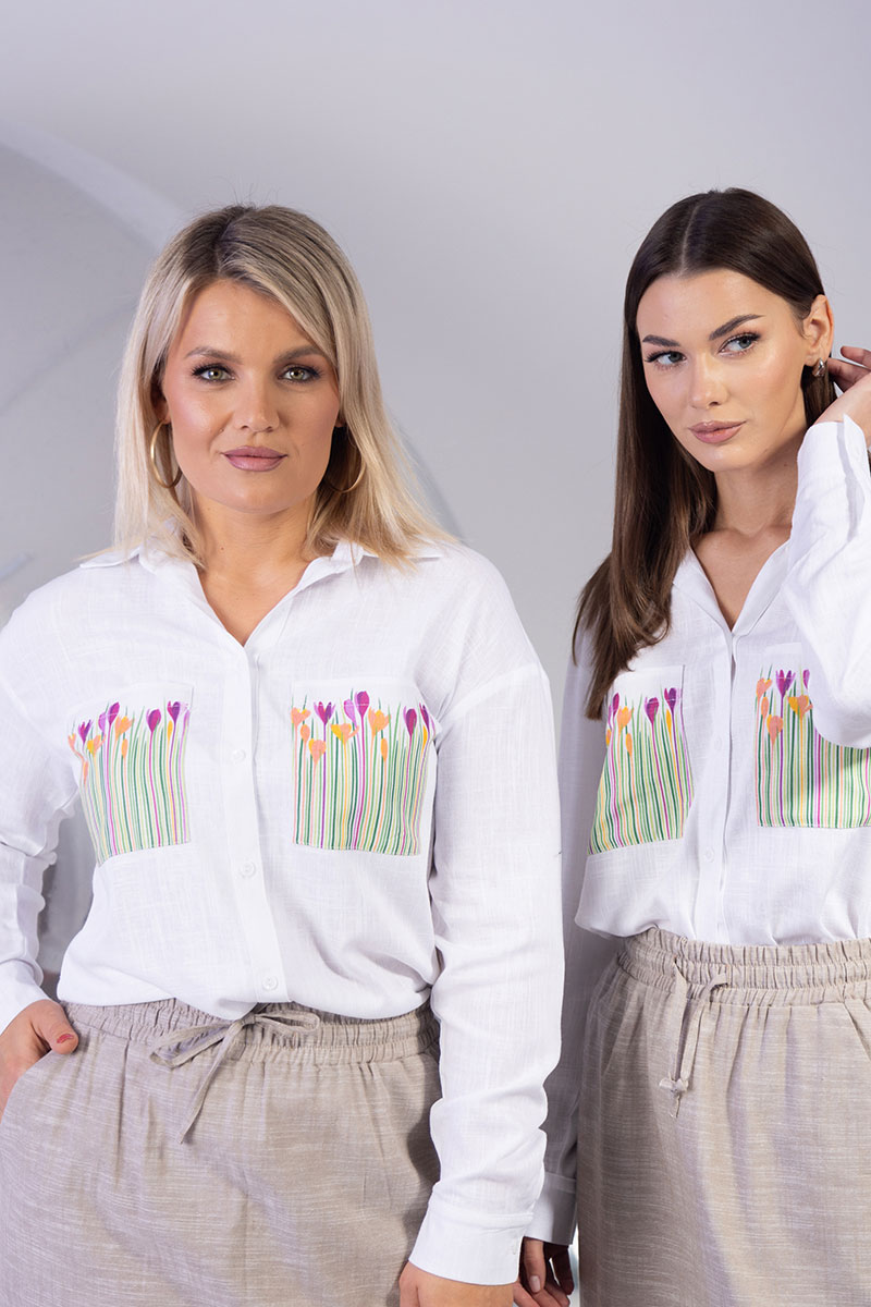 - Модные детали: накладные нагрудные карманы с ярким принтом делают блузу стильным акцентом в образе.