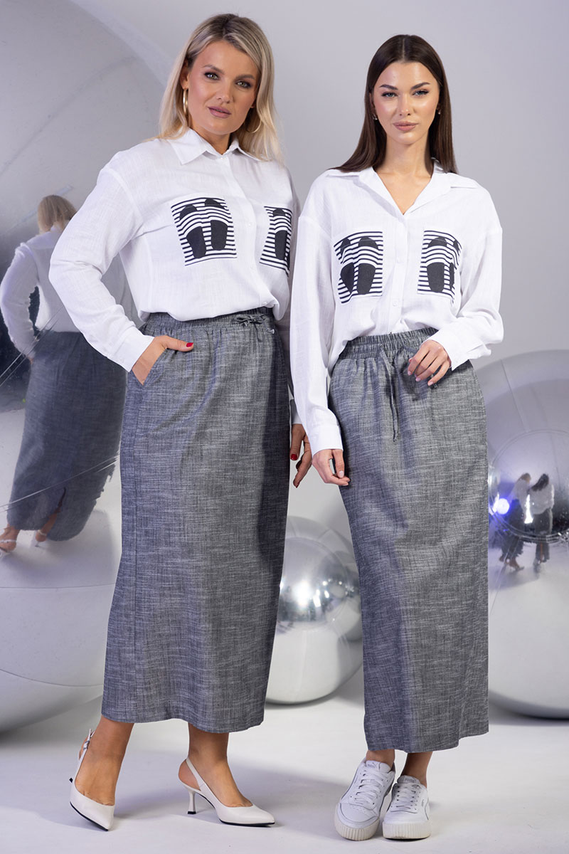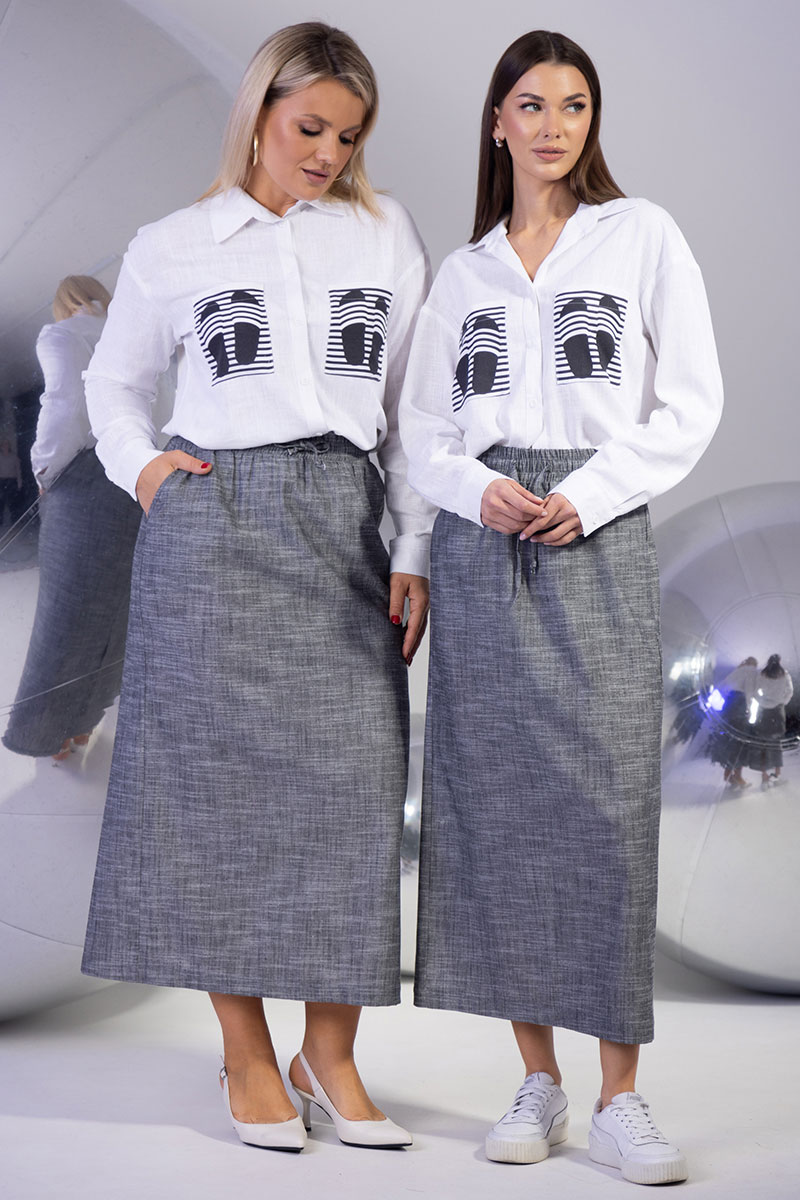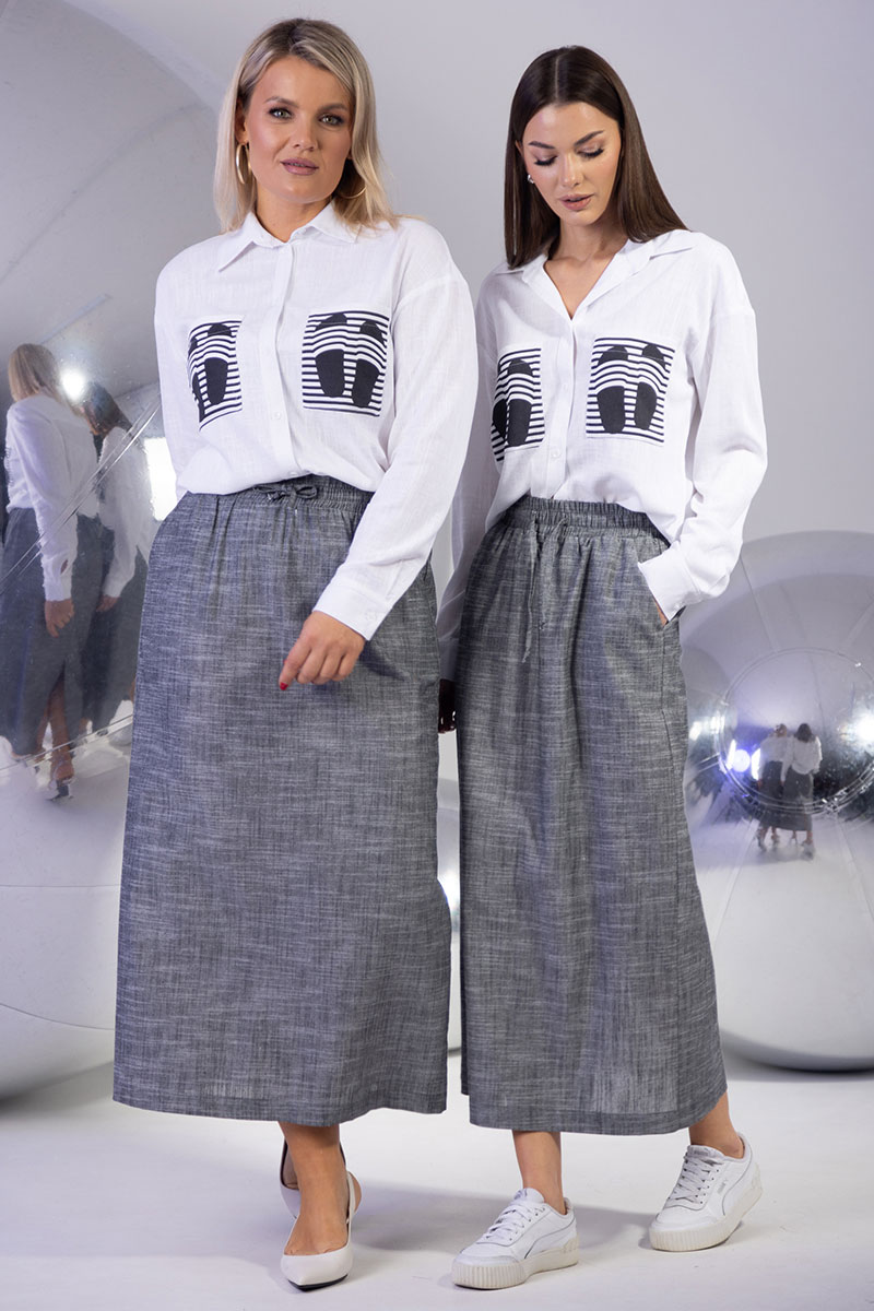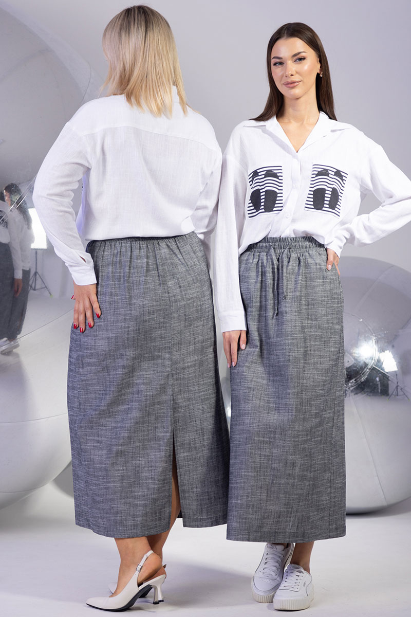 Женский комплект из льна: стильная блуза с принтом и элегантная юбка с разрезом