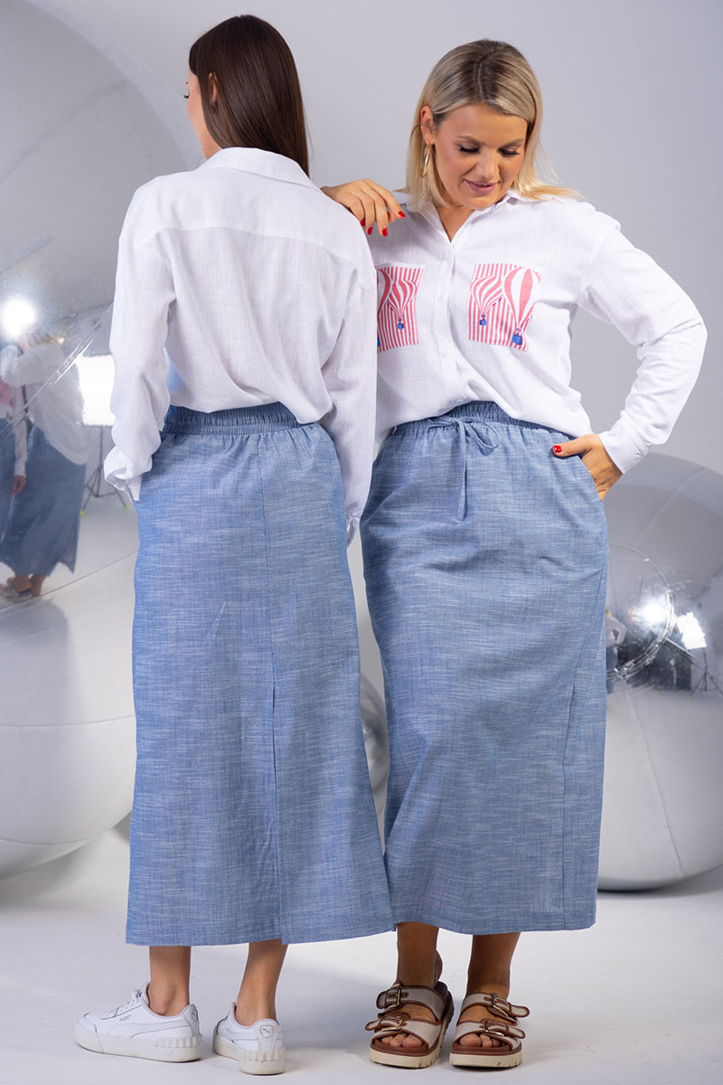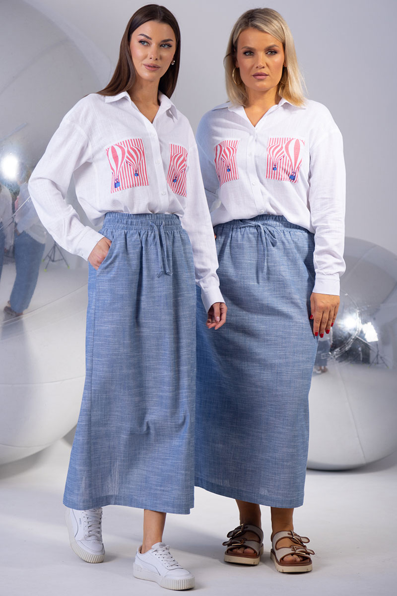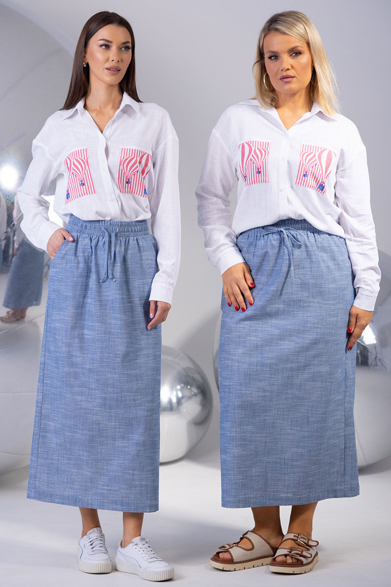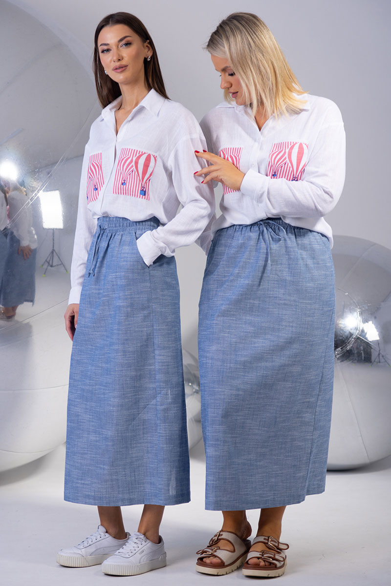 Обновите свой гардероб этим летом с гармоничным комплектом из натуральных тканей! Этот координированный набор сочетает женственную приталенную блузу и роскошную длинную юбку –