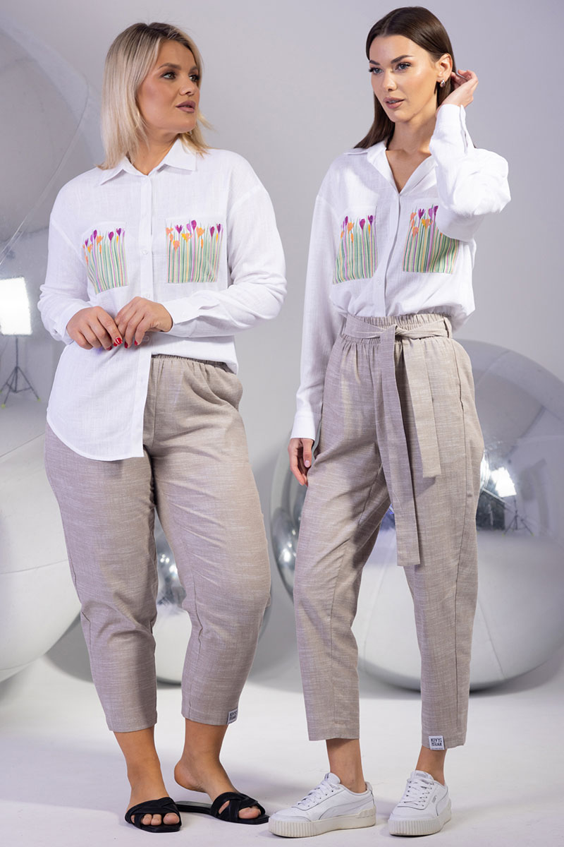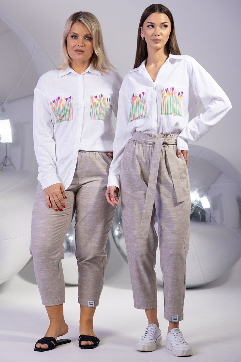 Женский костюм из льна с вискозой: элегантная блуза с принтом и укороченные брюки