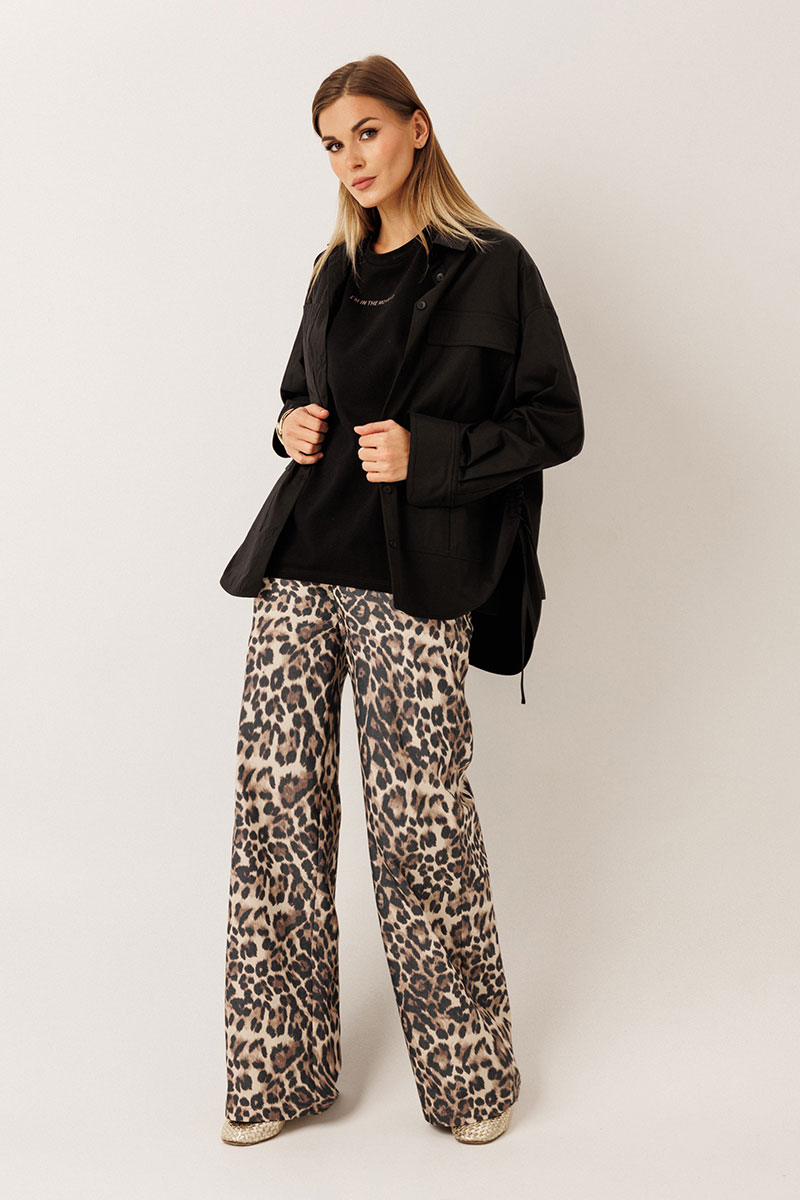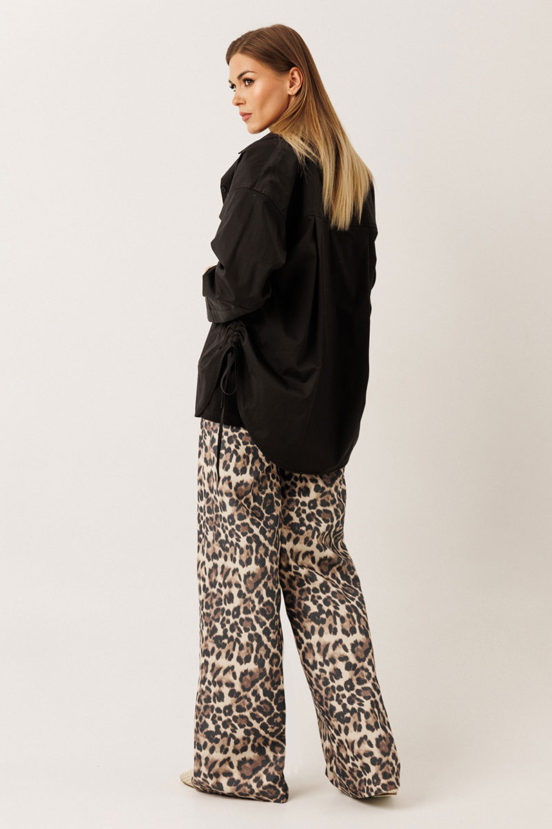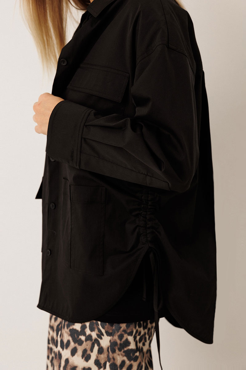 – по бокам — кулиса: шнурки можно затянуть и завязать, создавая новый силуэт рубашки