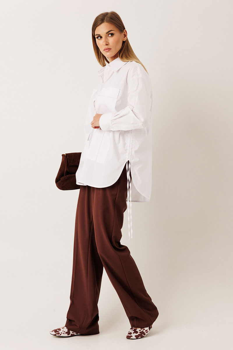 – по бокам — кулиса: шнурки можно затянуть и завязать, создавая новый силуэт рубашки