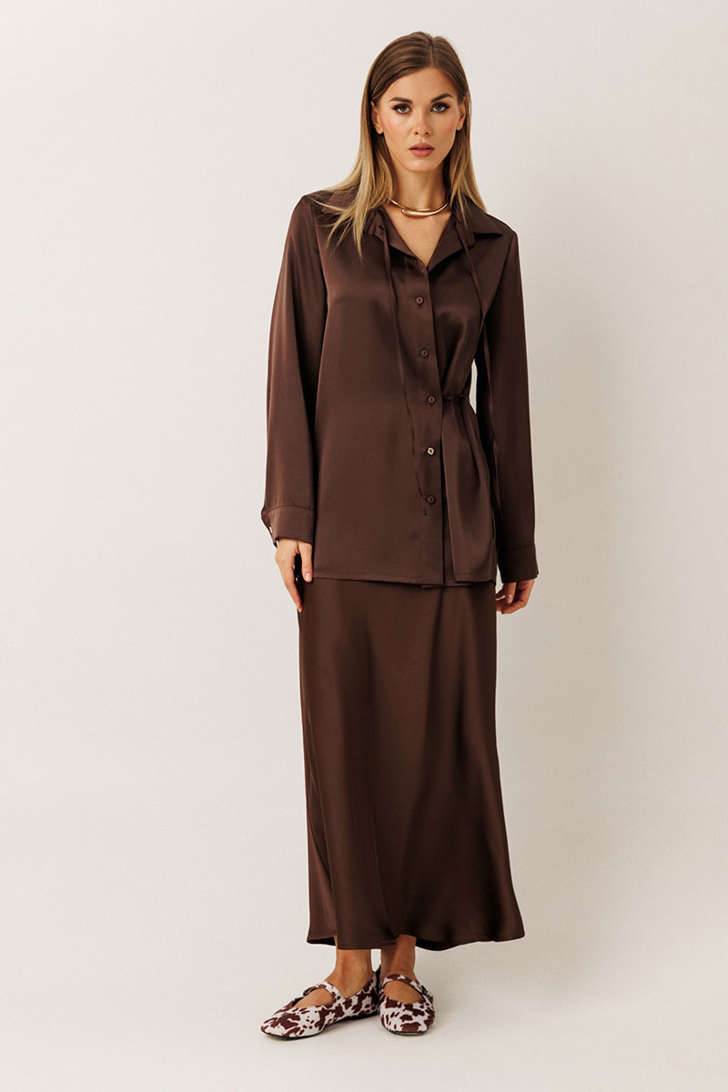 – трансформер: можно носить приталенно, застегнув потайной ремешок, или создать расслабленный образ, завязав внутренние ленты и спустив на плечи.