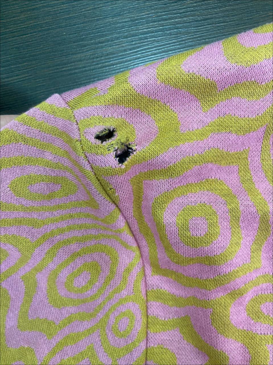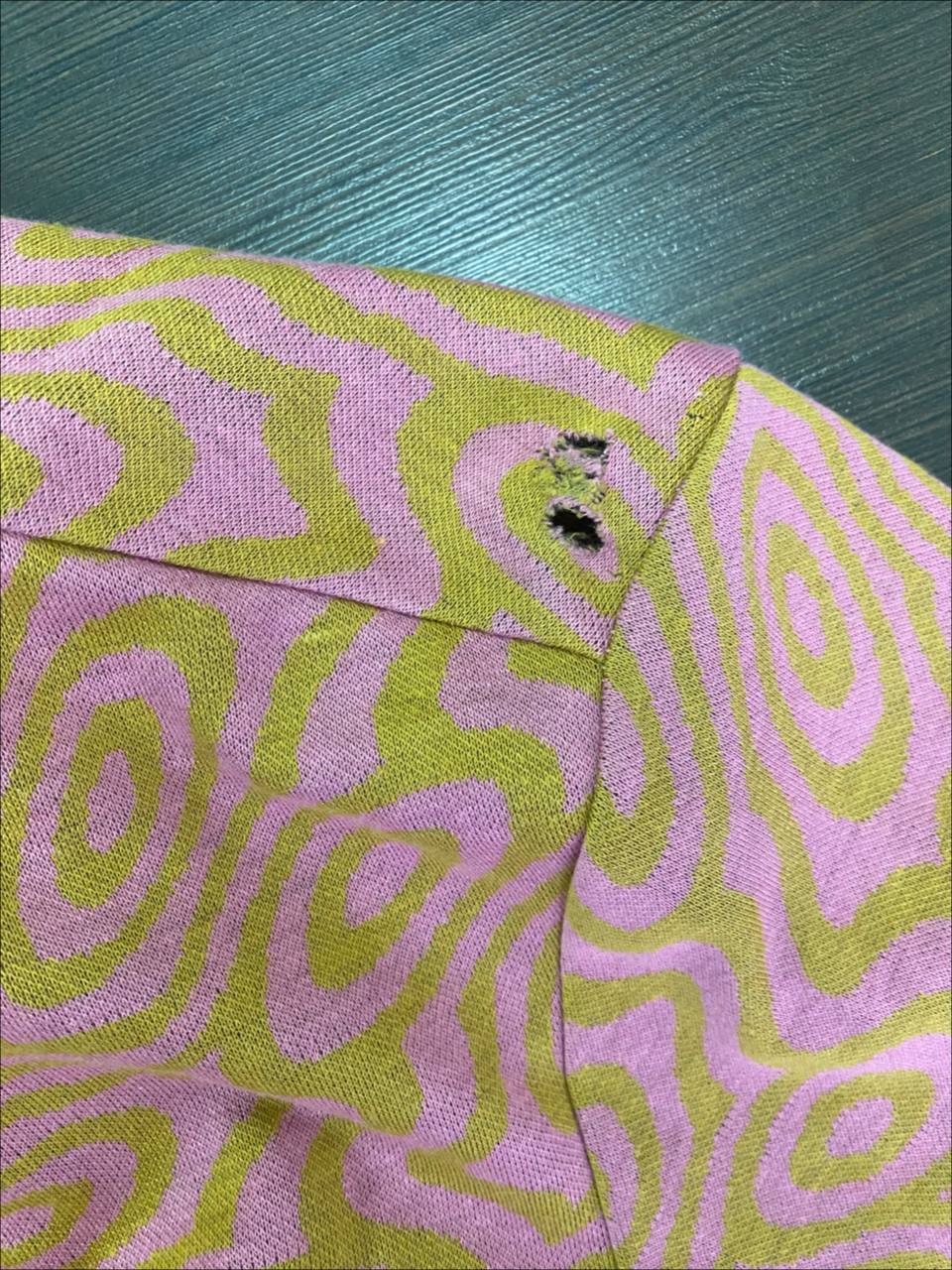Сзади на плече у блузы, рядом со швом, порвана ткань.