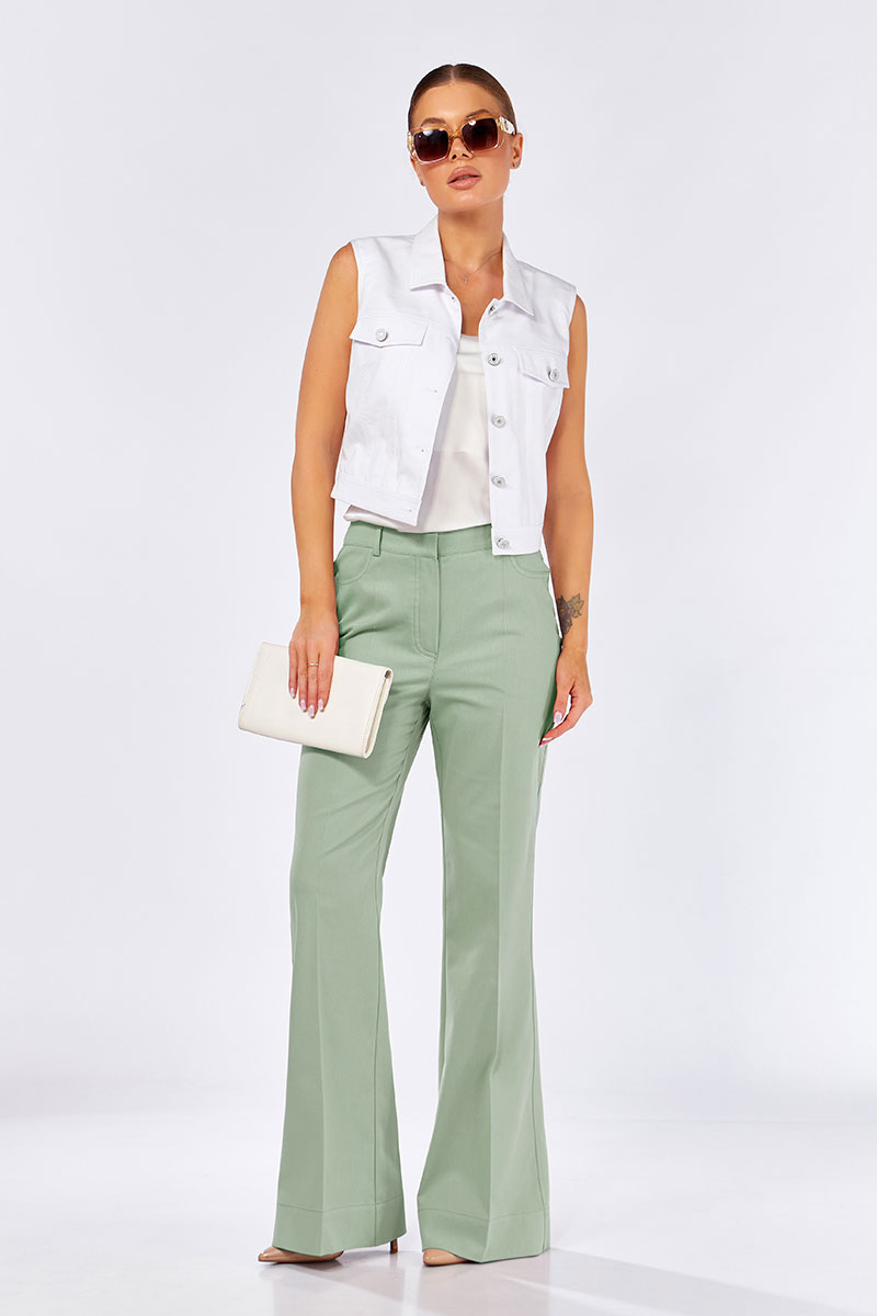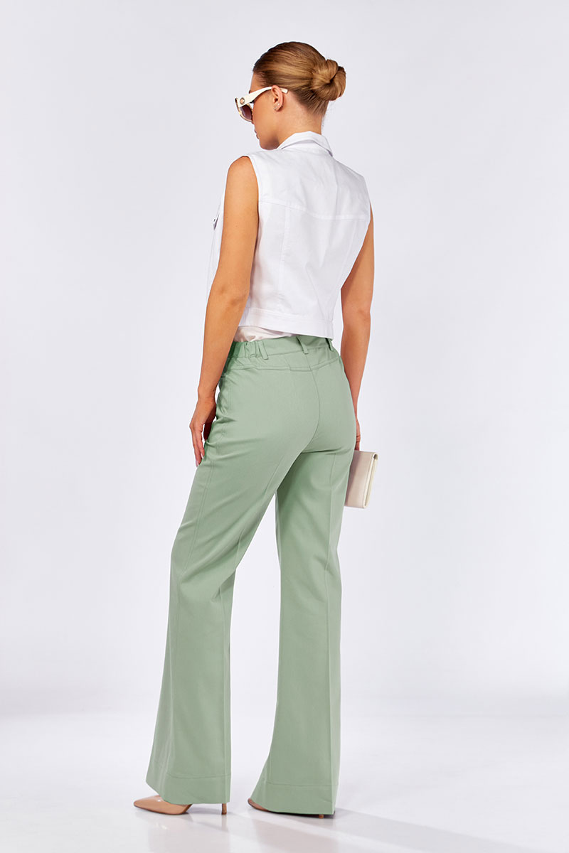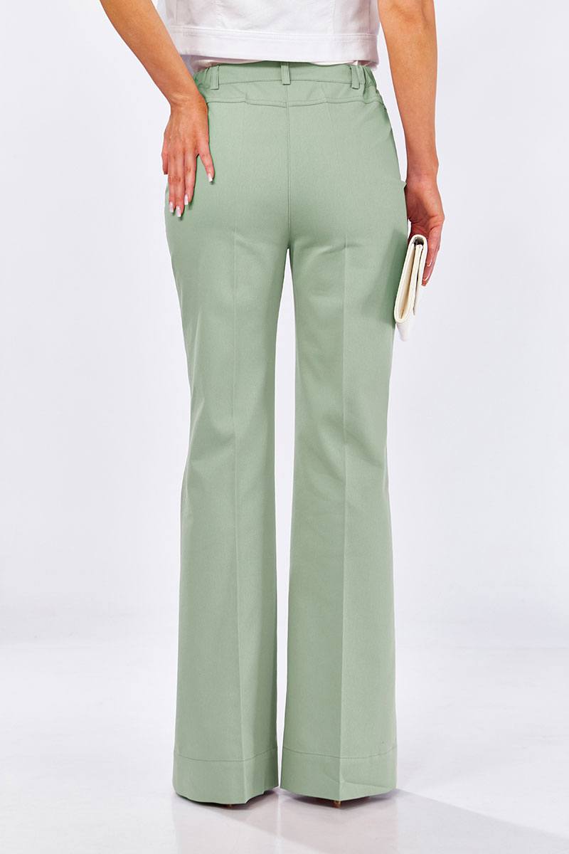 Брюки с двойными отстрочками,расширенные от колена,высокая посада, по талии на поясе мо шлевками, в боковых швах карманы.