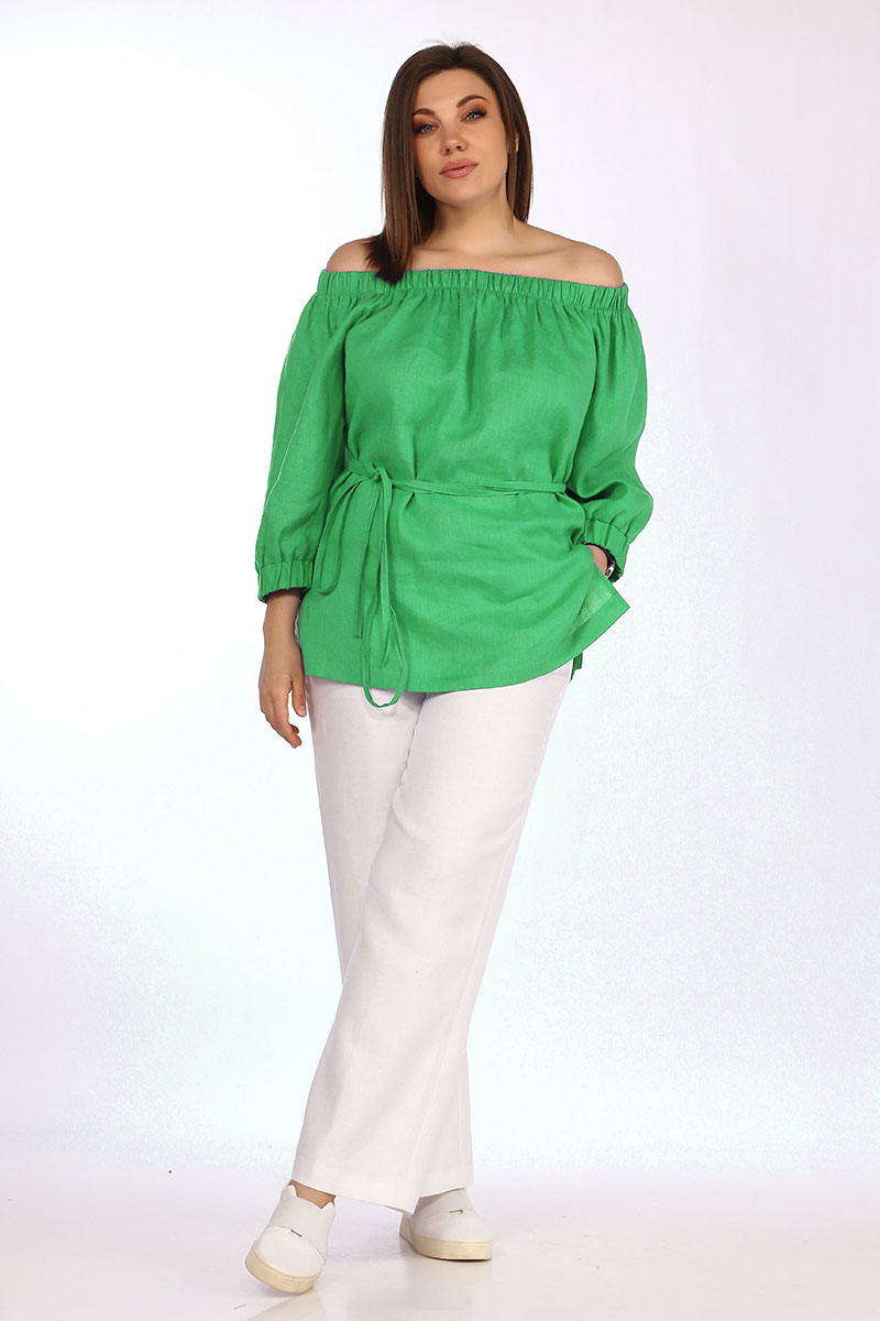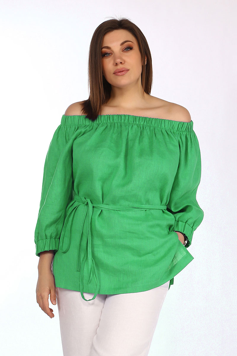 Туника свободного силуэта выполнена из 100% льна, рукав реглан на эластичной манжете. Вырез горловины глубокая лодочка на эластичной сборке, что позволяет менять форму выреза от декольте, до асимметрии. Пояс в комплекте.