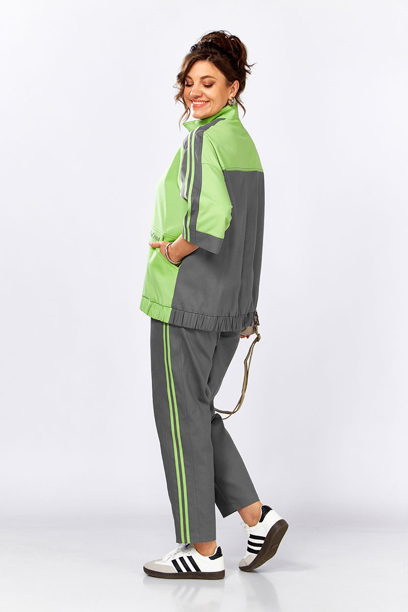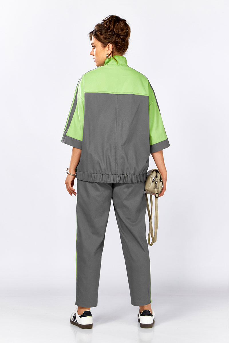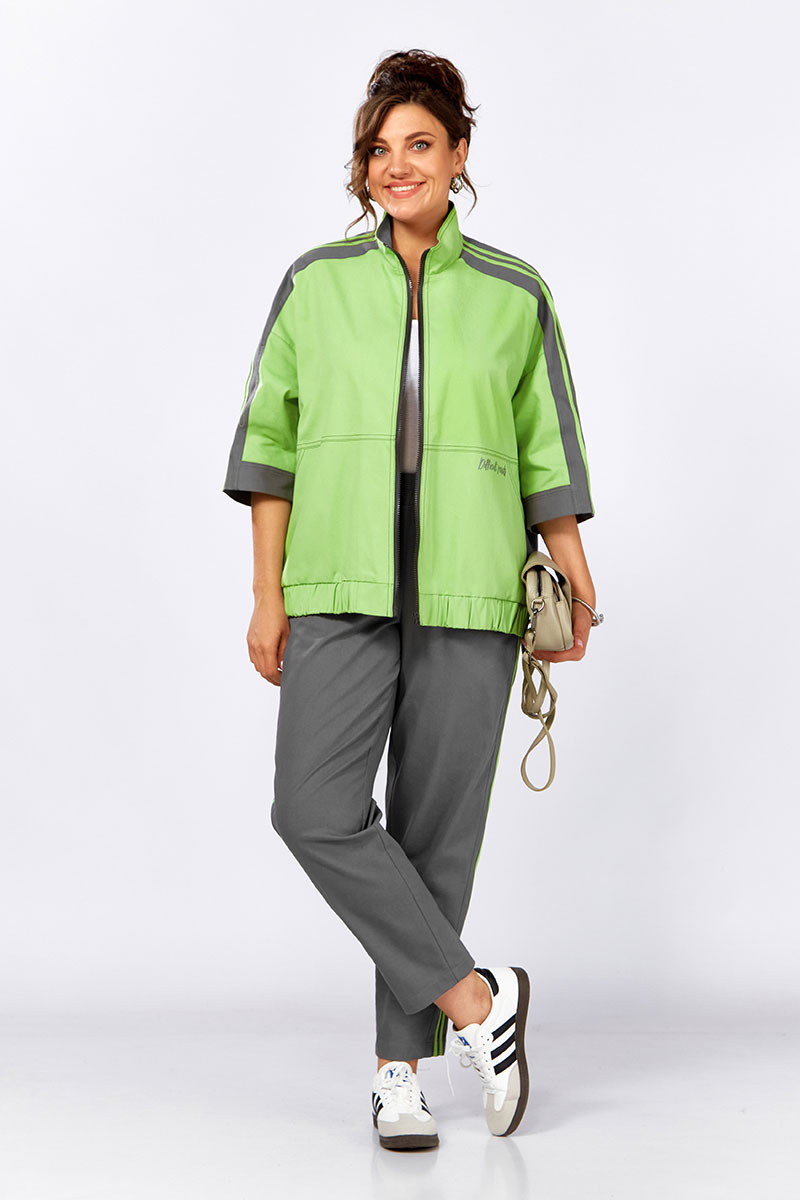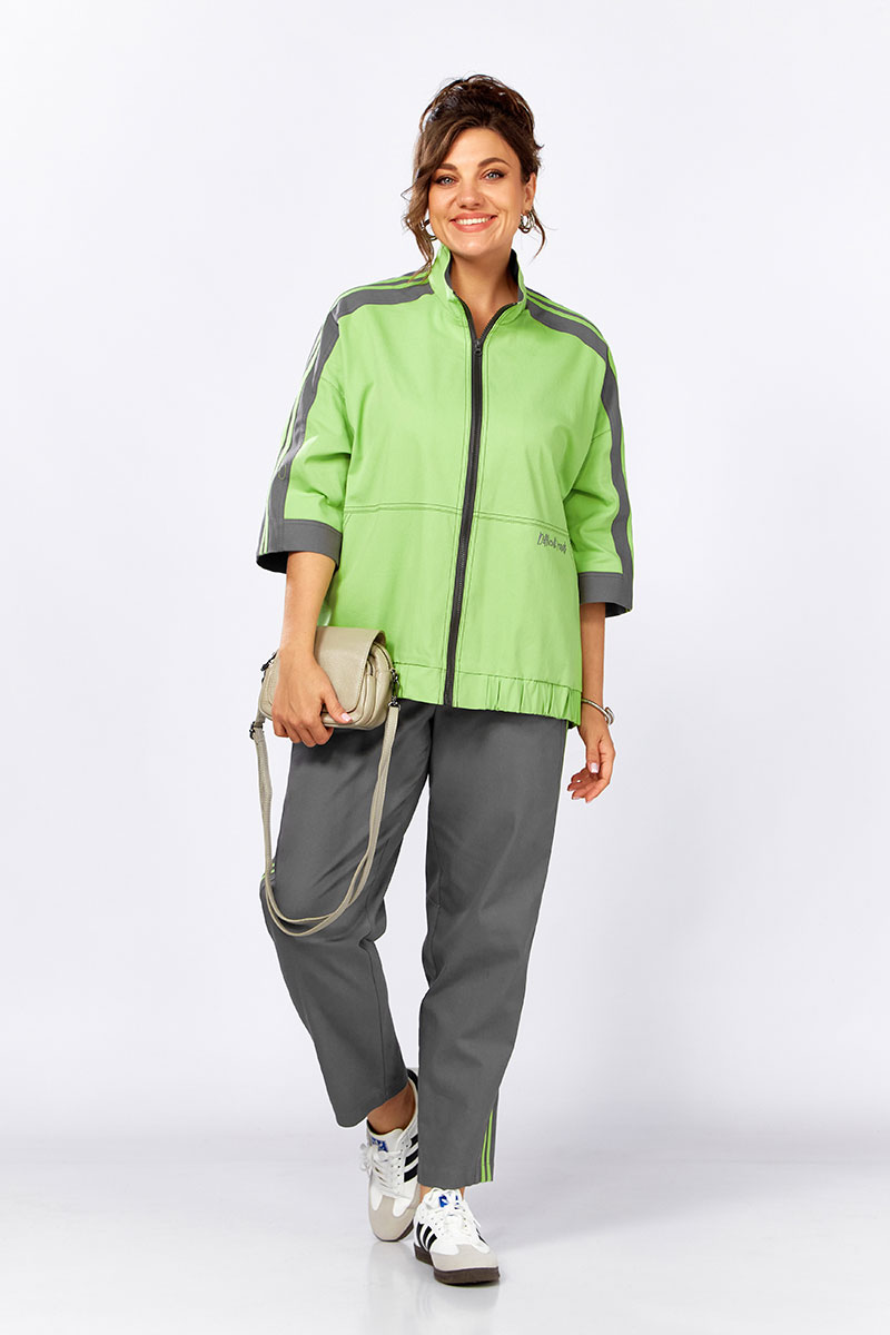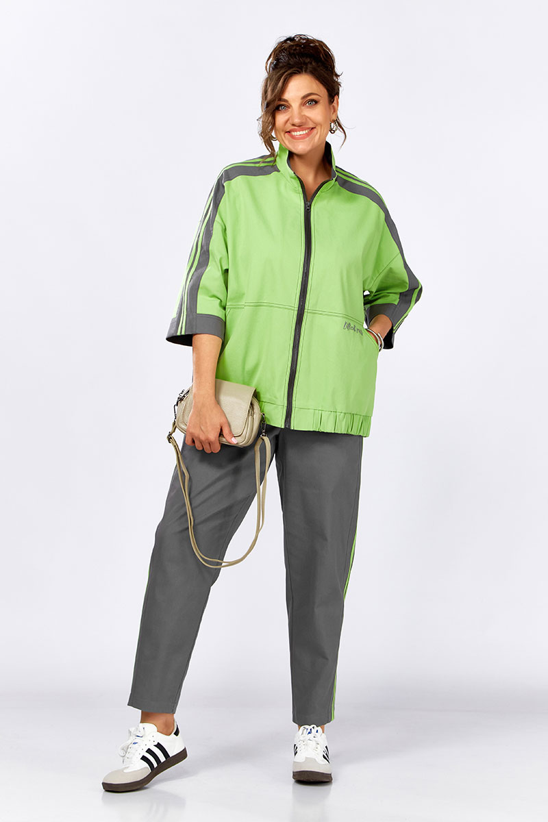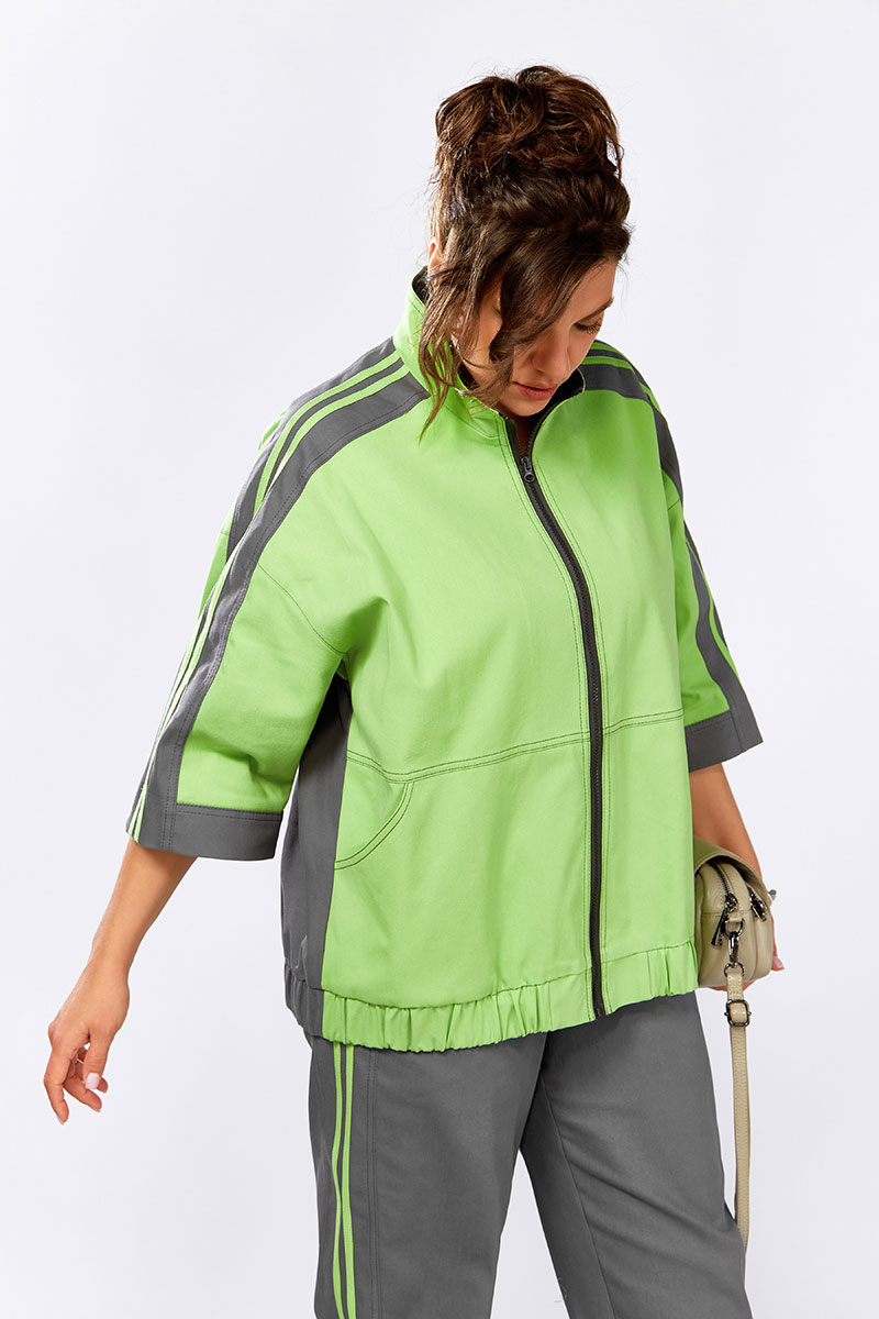 Бомбер свободного силуэта на молнии, с накладными карманами, воротник высокая отложная стойка, по рукаву контрастная отделка. Спинка комбинированная, по низу эластичная лента.
