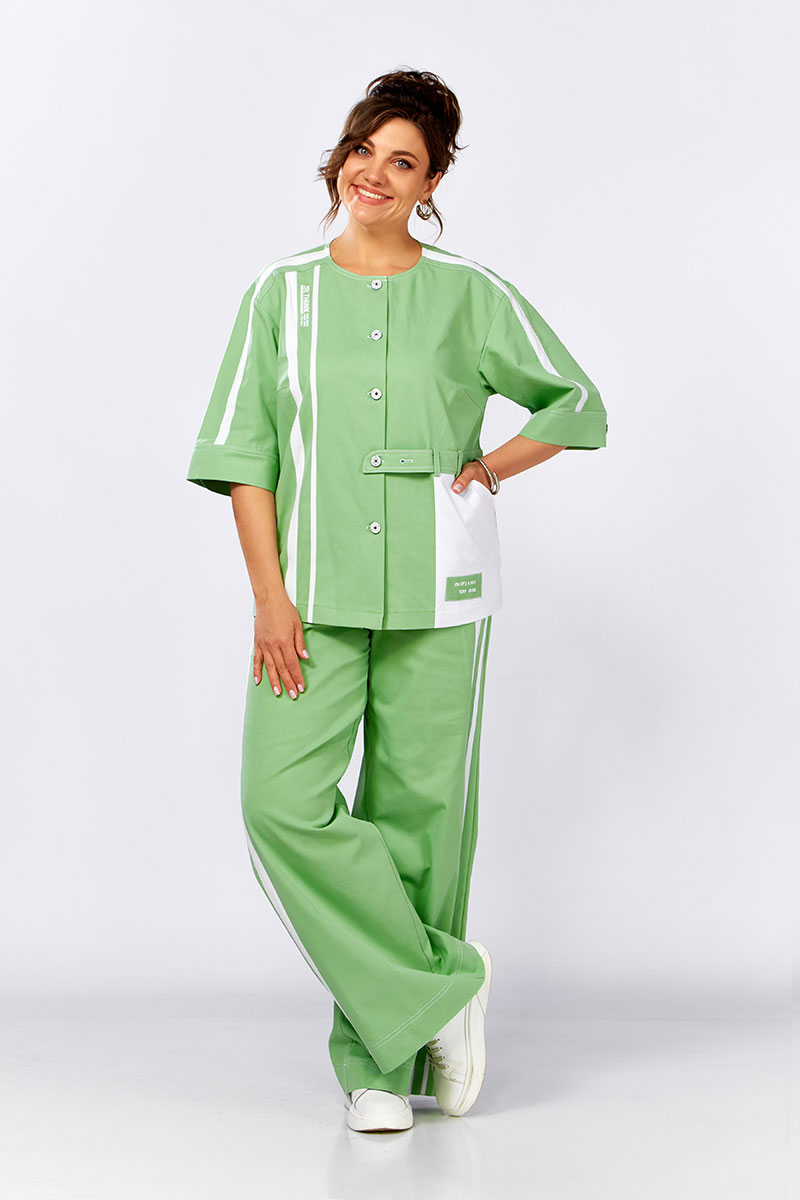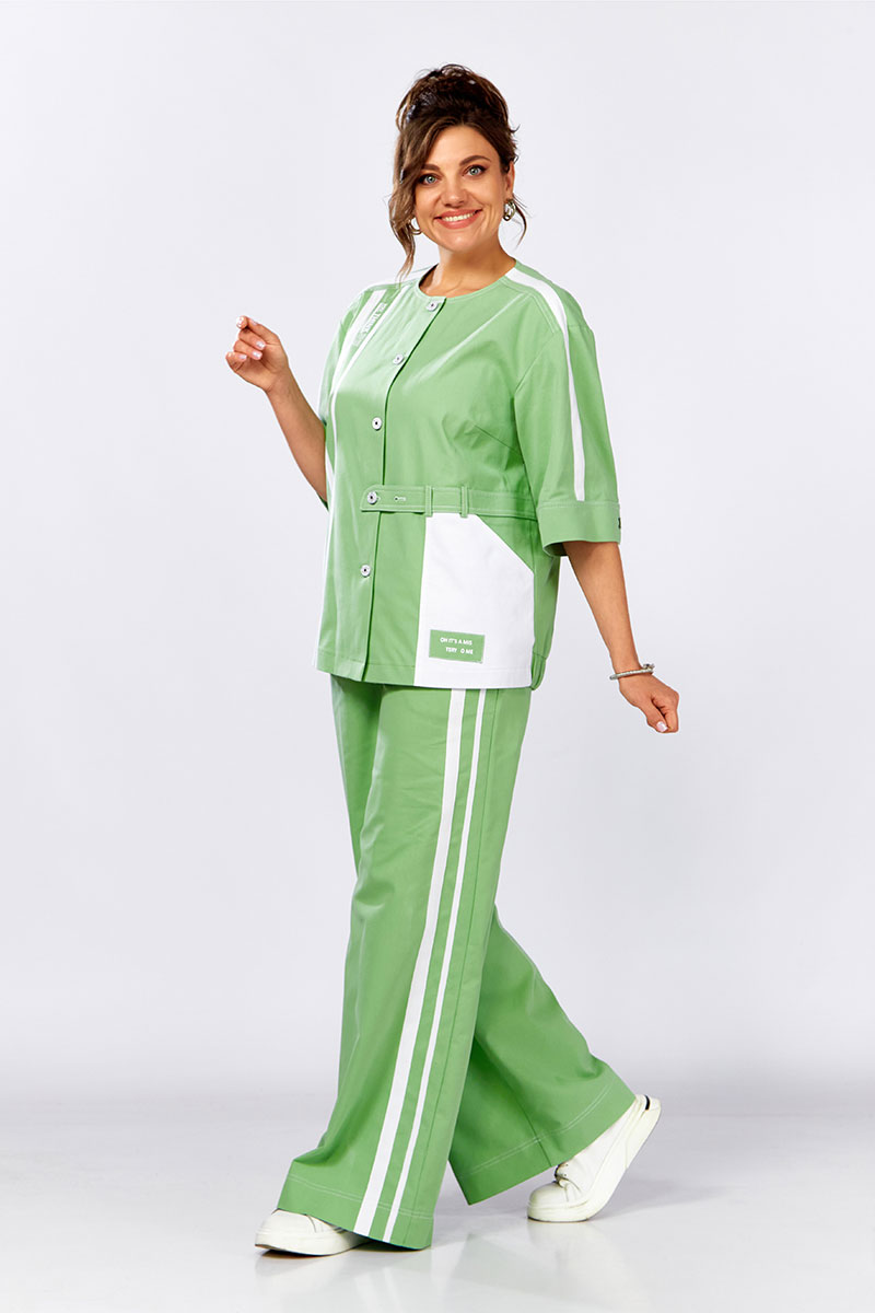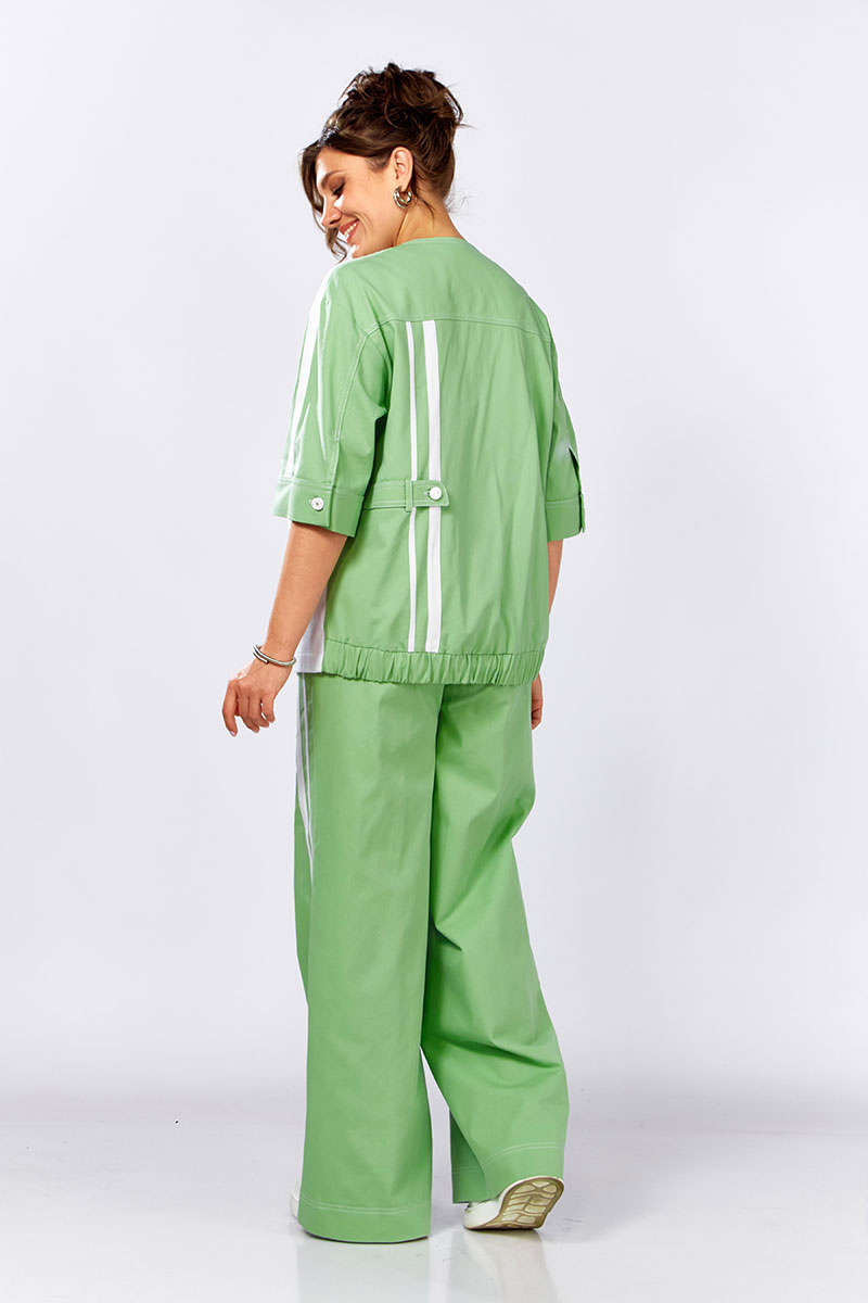 Супермодный костюм в стиле спорт-шик из легкого хлопкового джинса, идеален для летнего отдыха и городских прогулок. Яркий акцент костюму придает асимметричный карман на полочке с декоративными элементами имитации пояса и отделка из киперной белой тесьмы по рукаву полочке, спинке и брюкам.