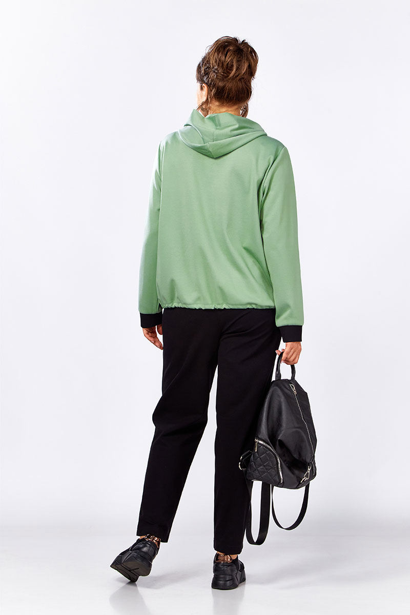 Бомбер с капюшоном и накладными карманами. Застежка на молнию. Яркий акцент придает контрастная отделка в цвет брюк.