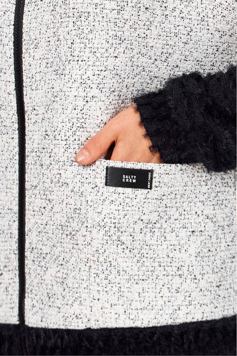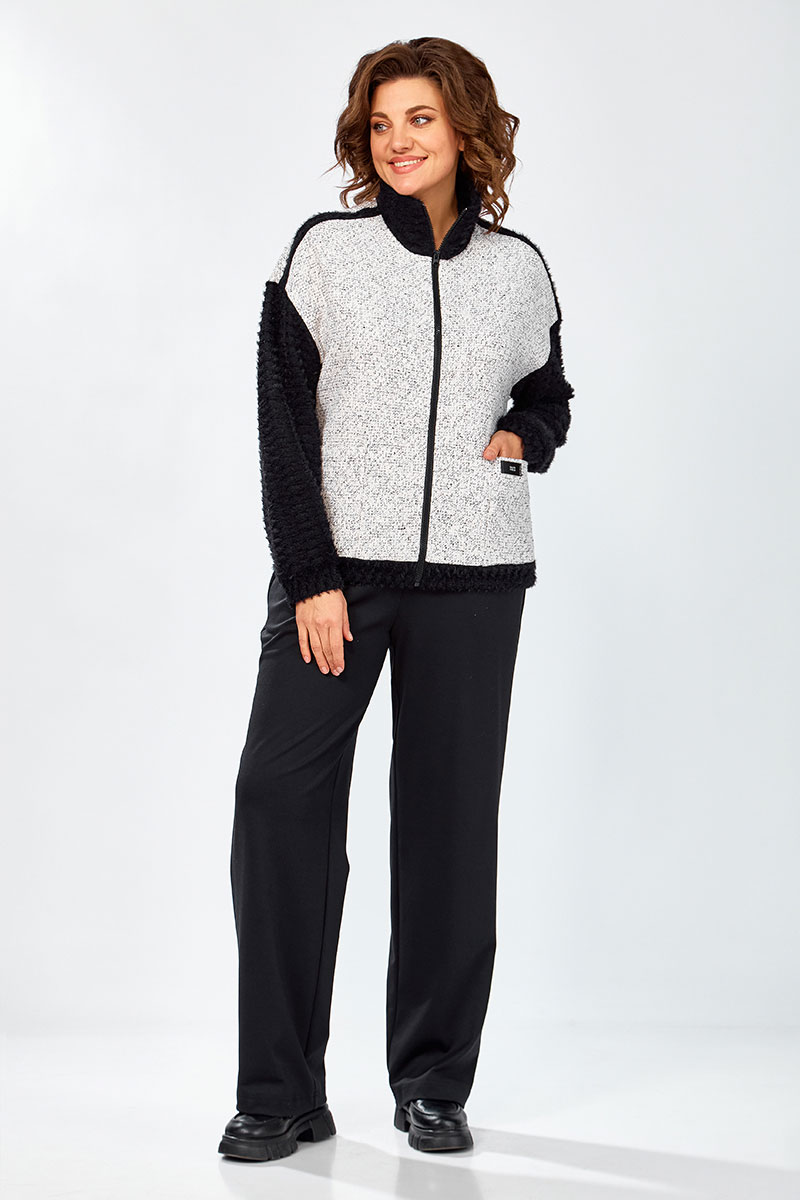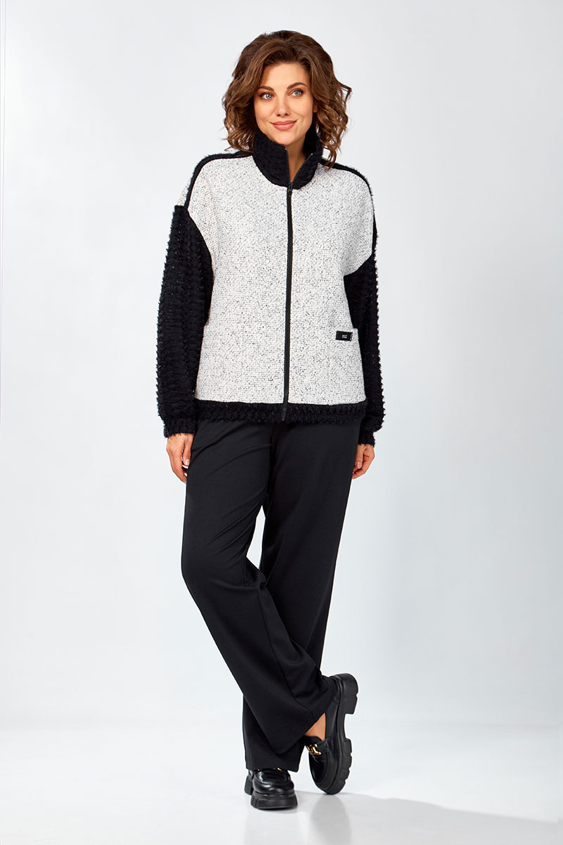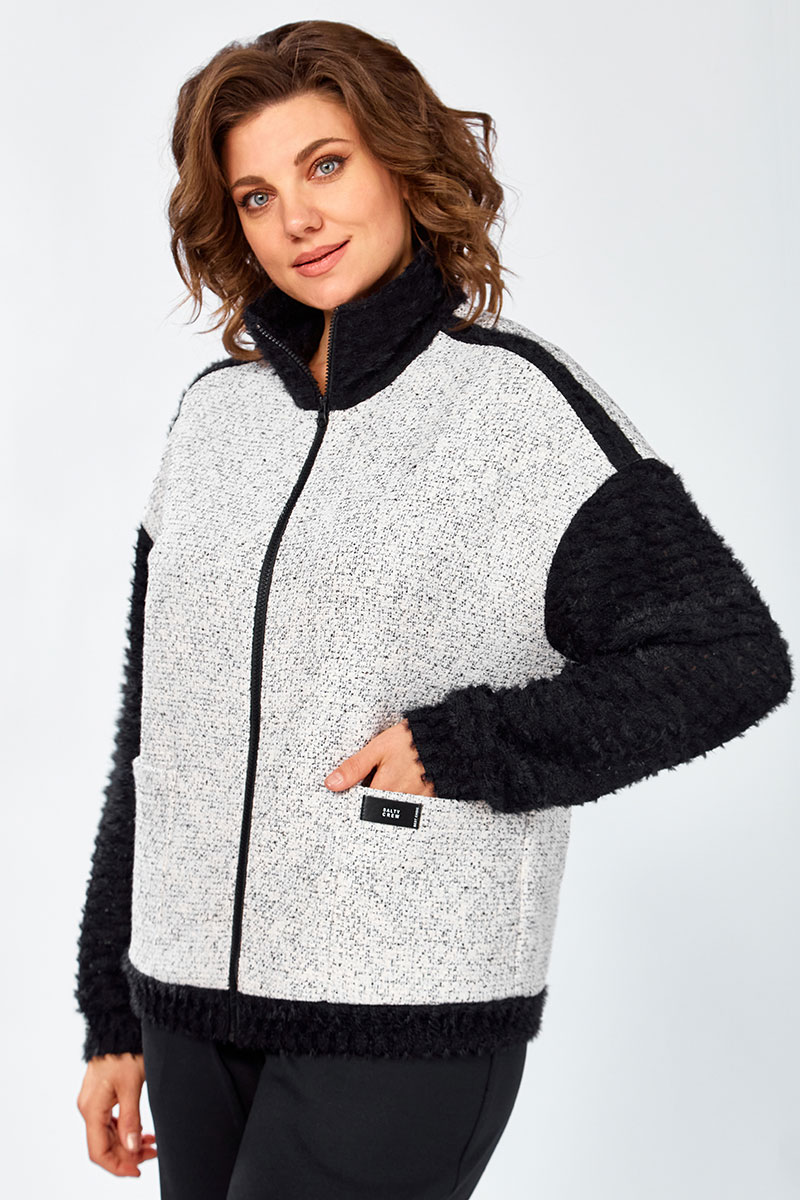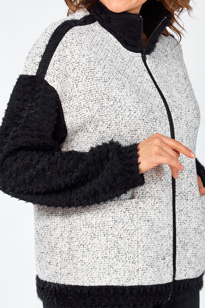 Жакет-бомбер на молнии свободного силуэта, с накладными карманами, комбинированный. Полочки и спинка из твидовой ткани. Рукава, воротник, манжеты из мягкого ворсистого трикотажа кроше.