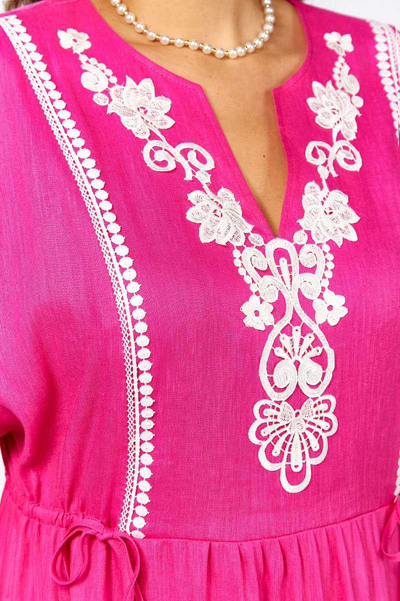 Легкое летнее платье в ярусы, из высококачественной натурального ткани, в которой вам будет комфортно даже с самую жаркую погоду. Свободный универсальный фасон, спущенный цельнокроеный рукав, слегка завышенная линия талии с регулируемой сборкой на декоративный шнур, аккуратно оформленный вырез горловины, подойдет для любого вида фигуры, а аппликация трендовый акцент, который сделает ваш образ стильным и неповторимым!