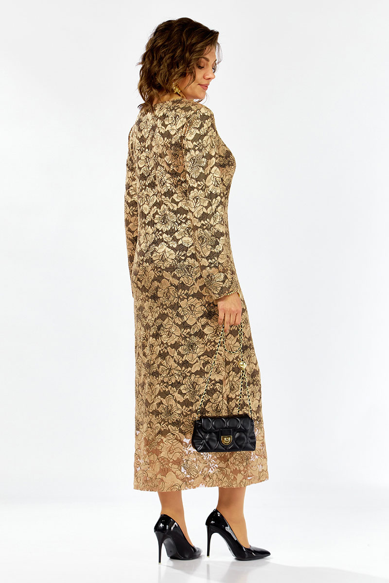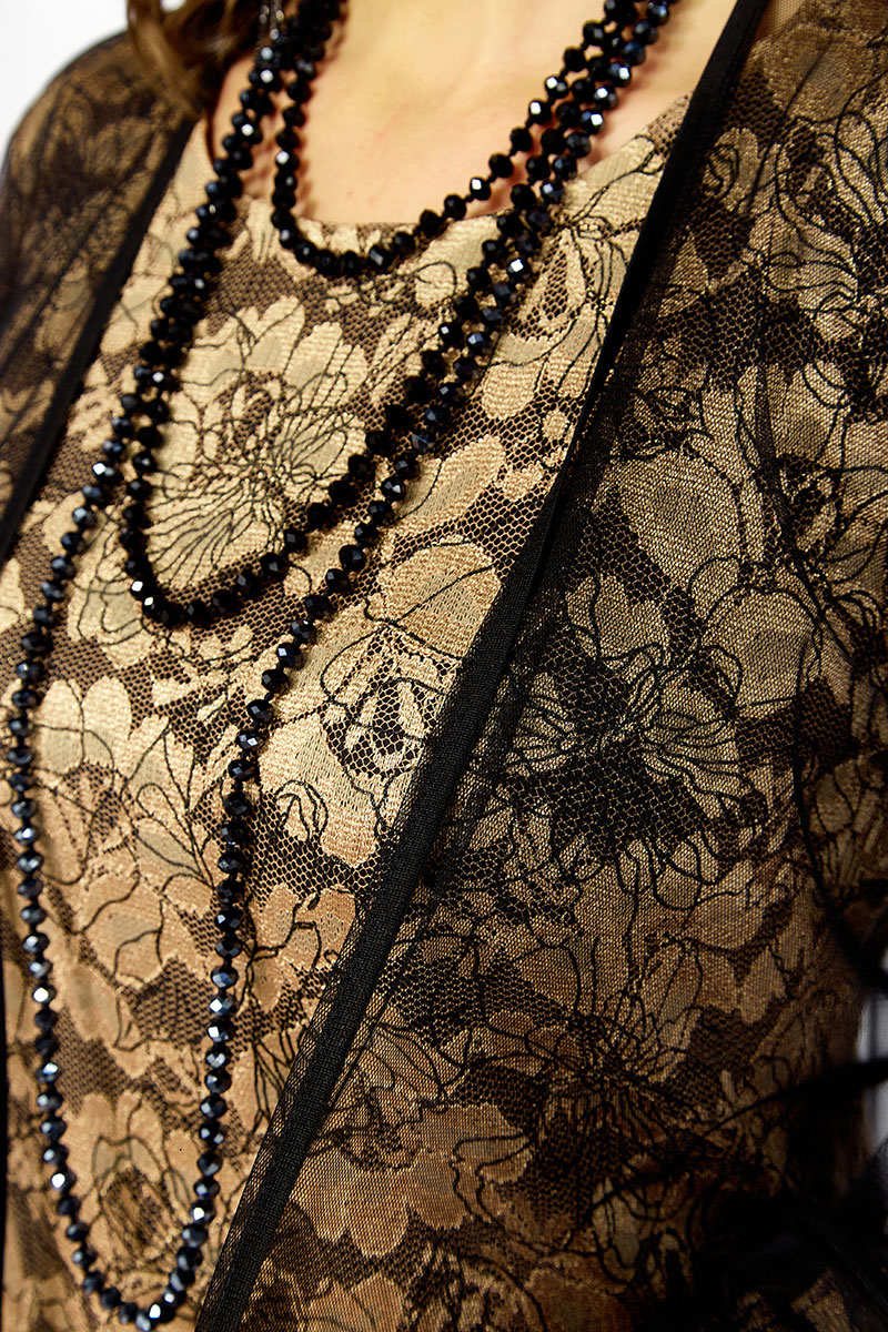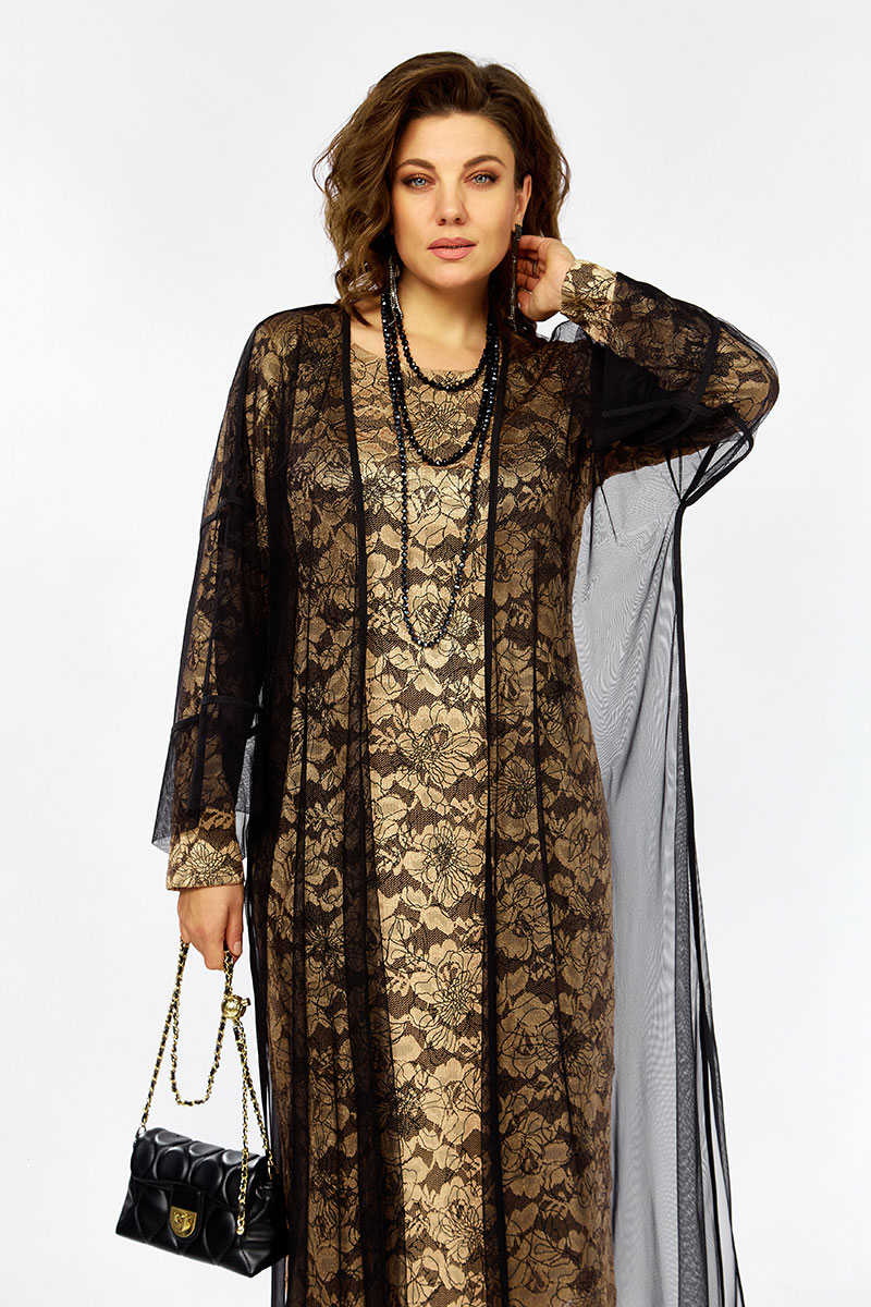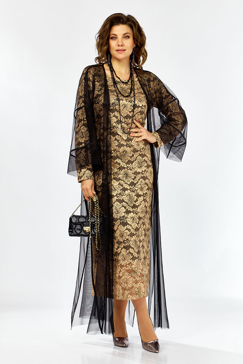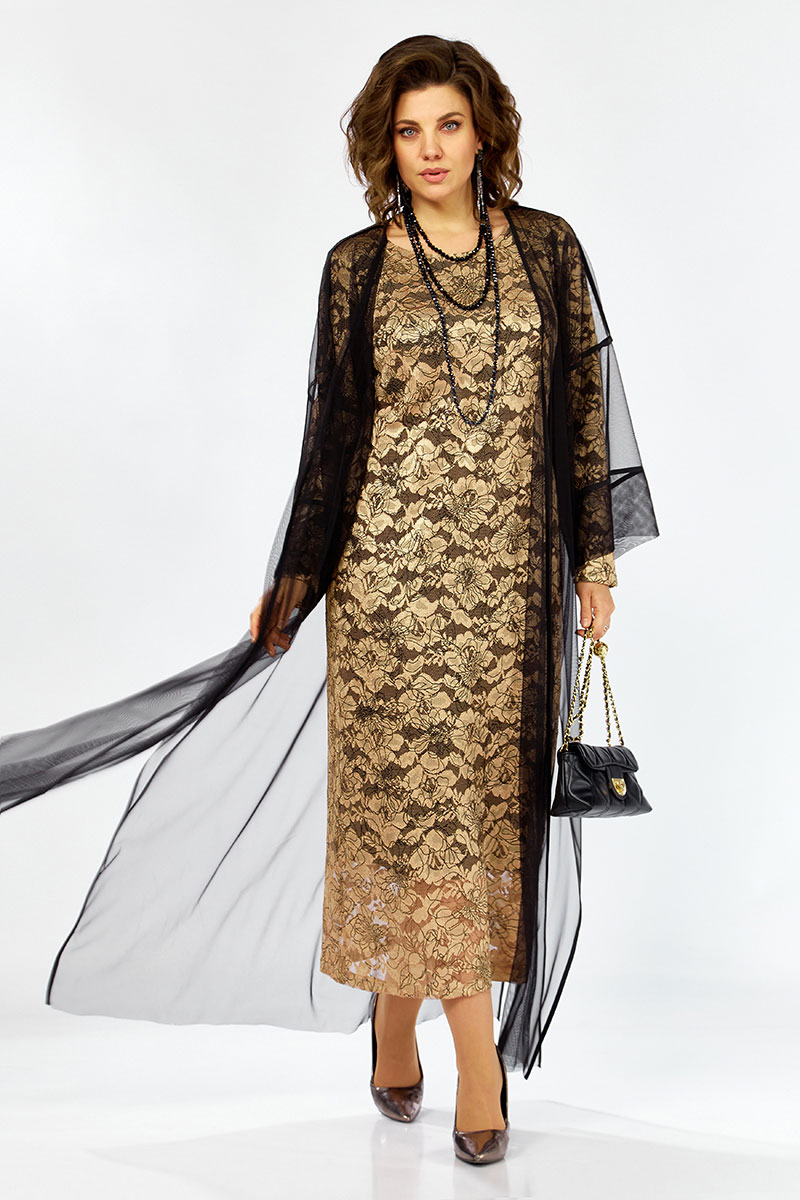 Элегантный и утонченный комплект созданный для особых случаев в основе платье полуприлегающего силуэта на трикотажной подкладке из кружевного гипюра с контрастным рисунком в цветочной тематике.