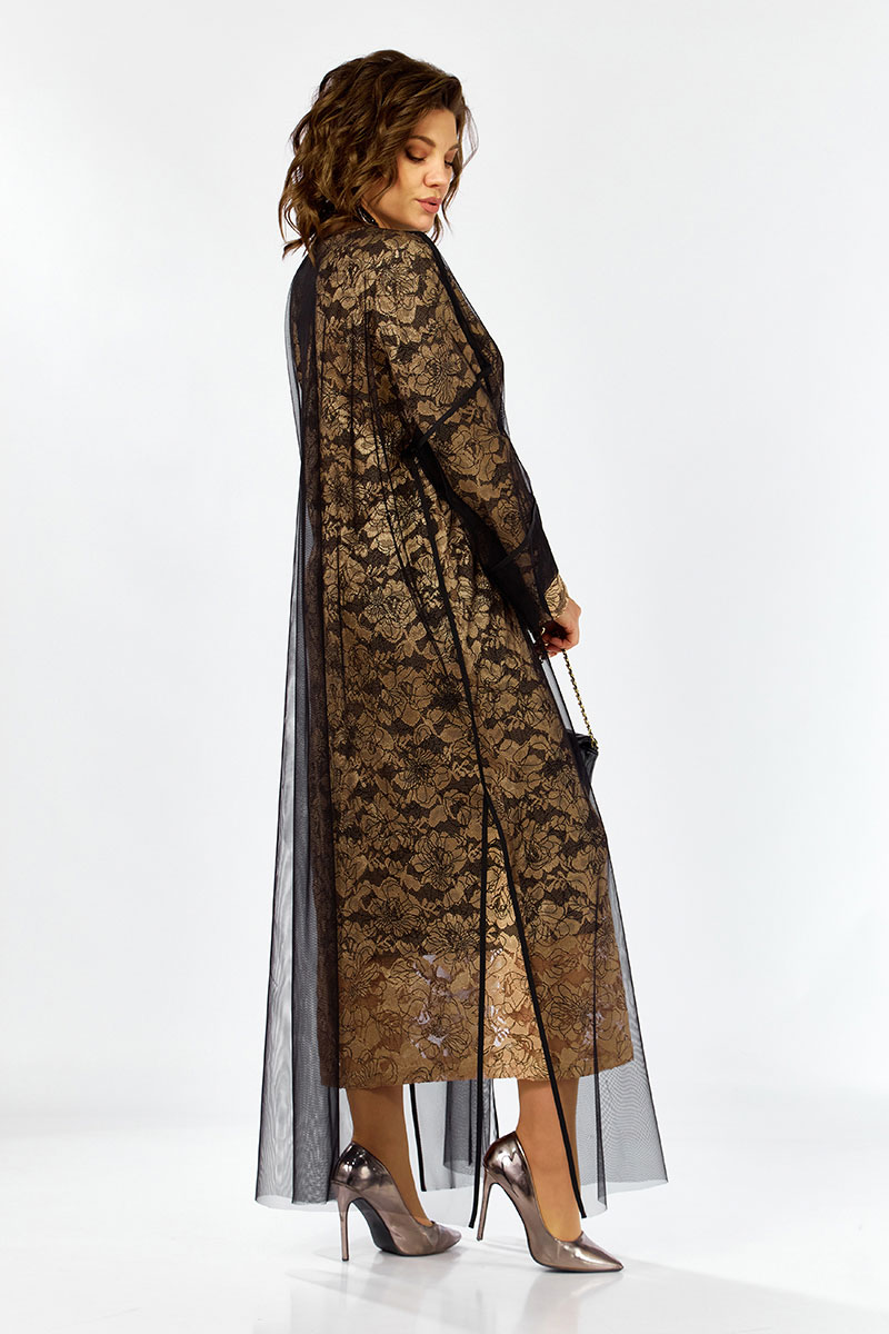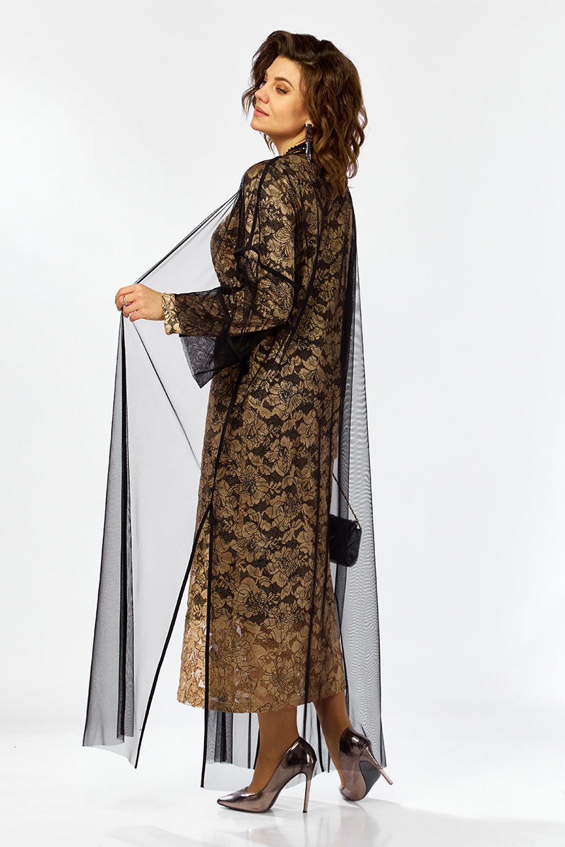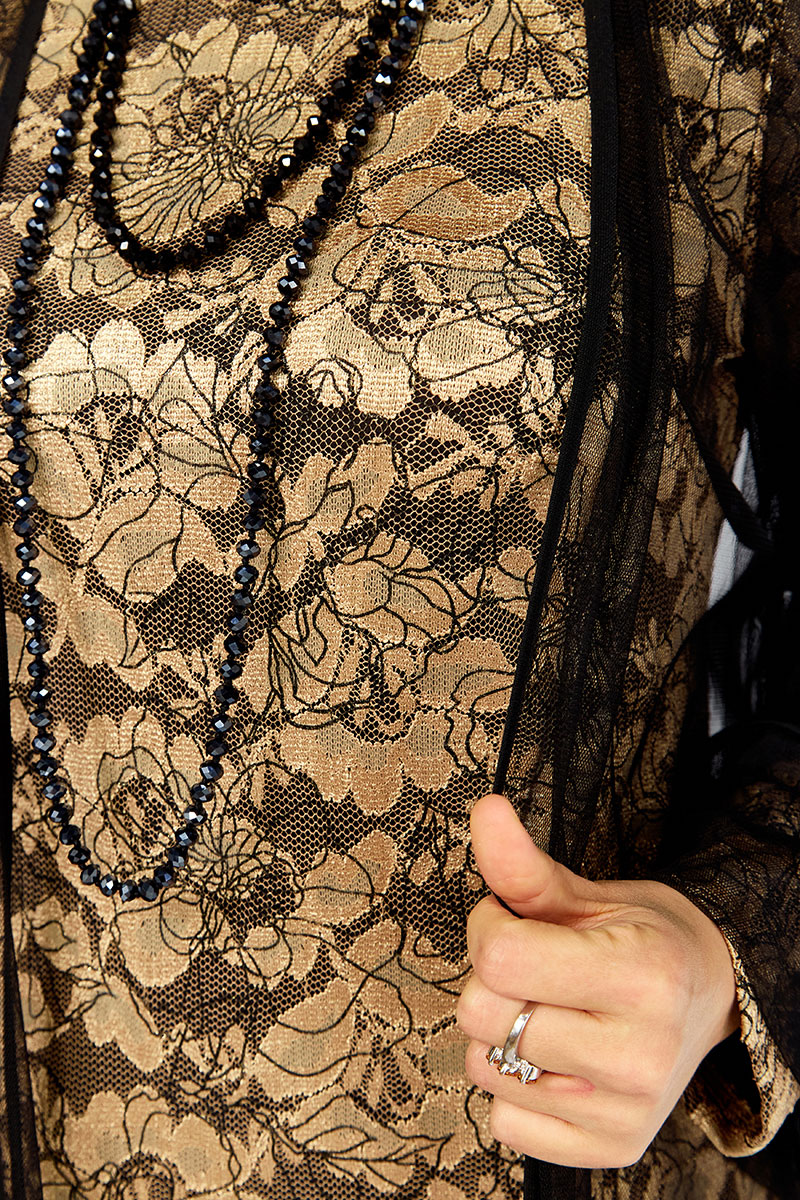 Сверху легкая накидка шазюбль из прозрачной сетки , она мягко драпируется, создавая воздушный легкий силуэт. Длинные рукава и свободный крой добавляют образу благородства и загадочности.