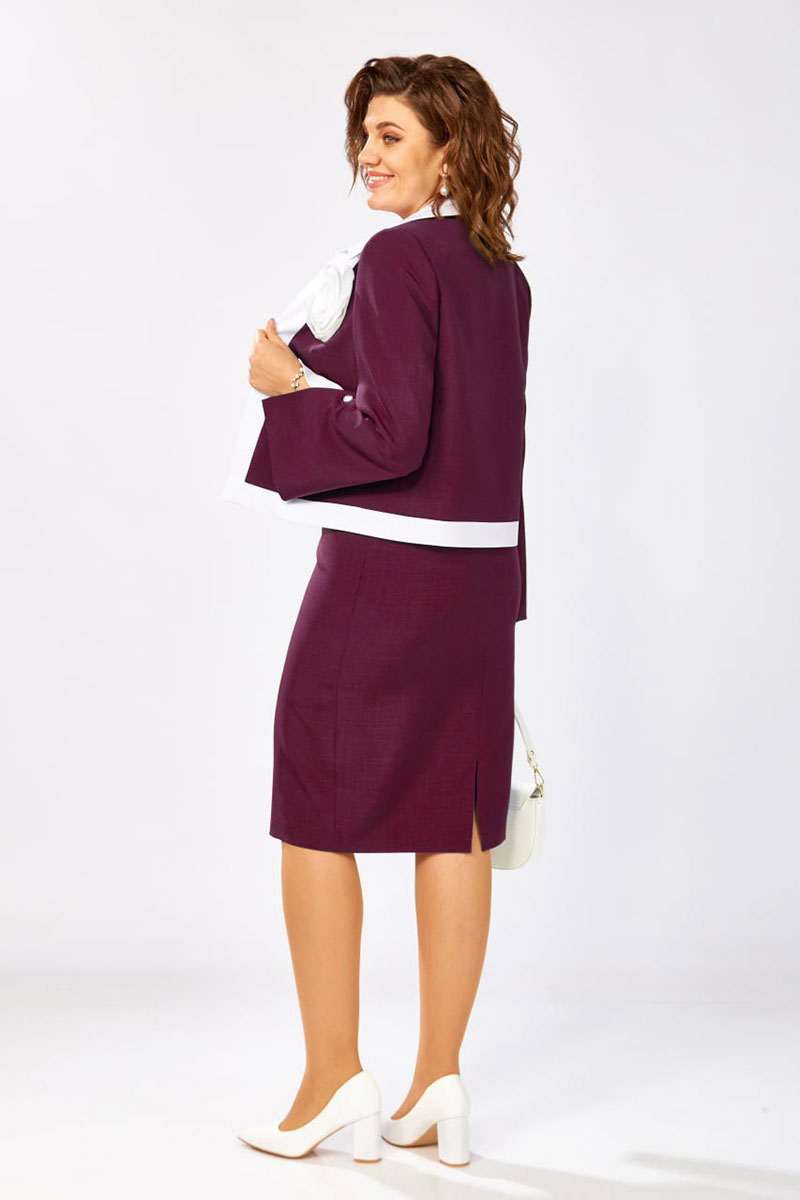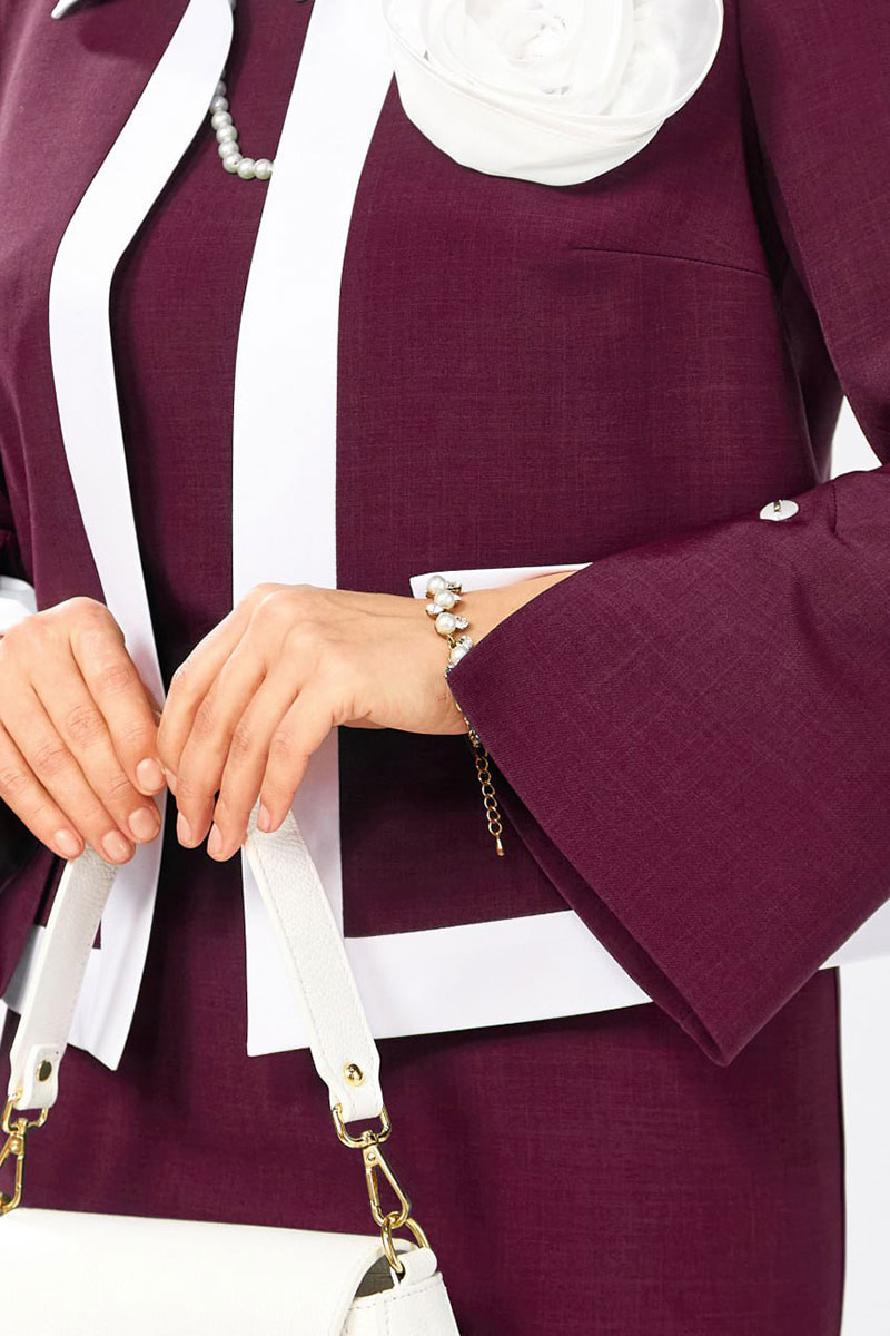 Изящность комплекту придает контрастная отделка воротника, планок, разреза шлицы и съемного декоративного цветка ручной работы подчеркнет вашу неотразимость и безупречный вкус.