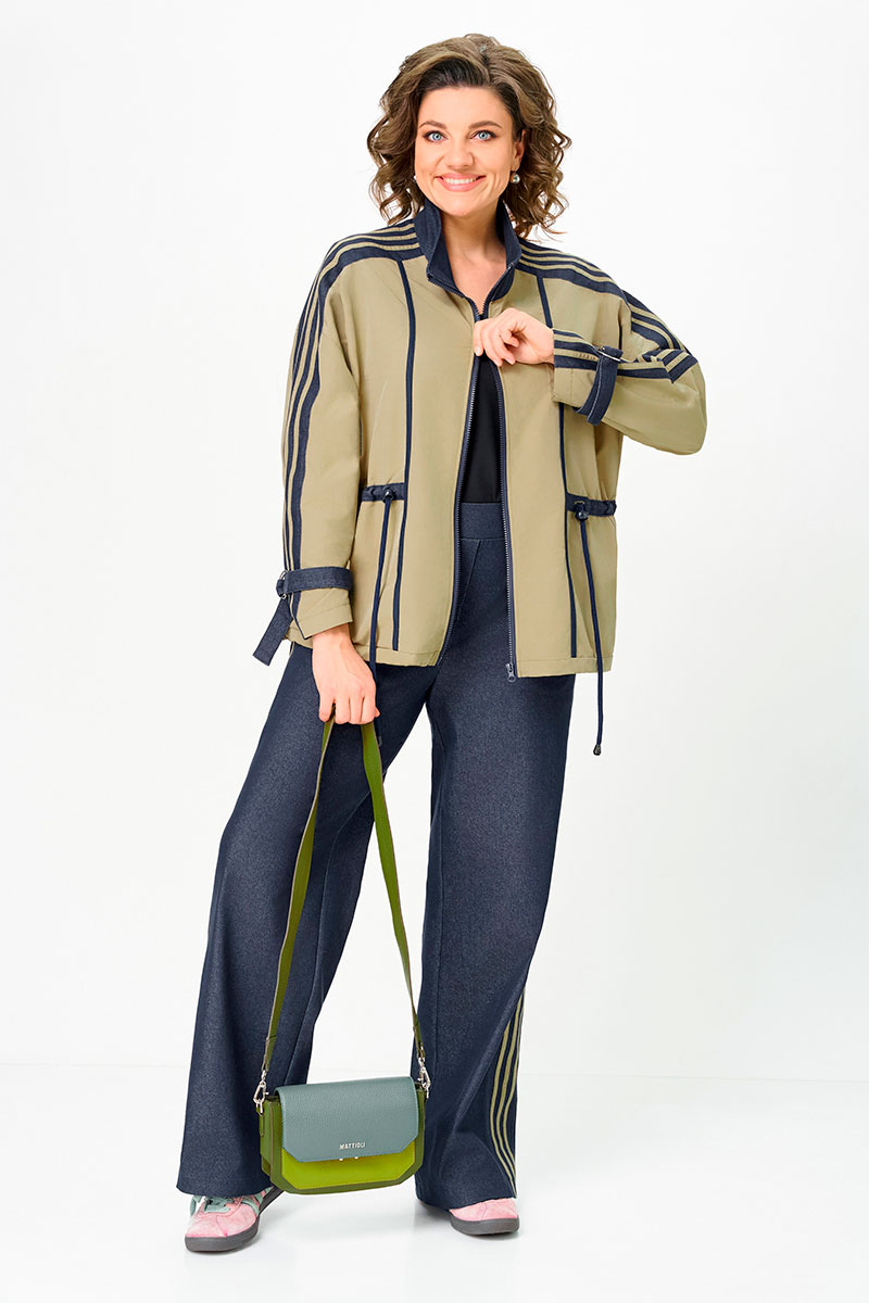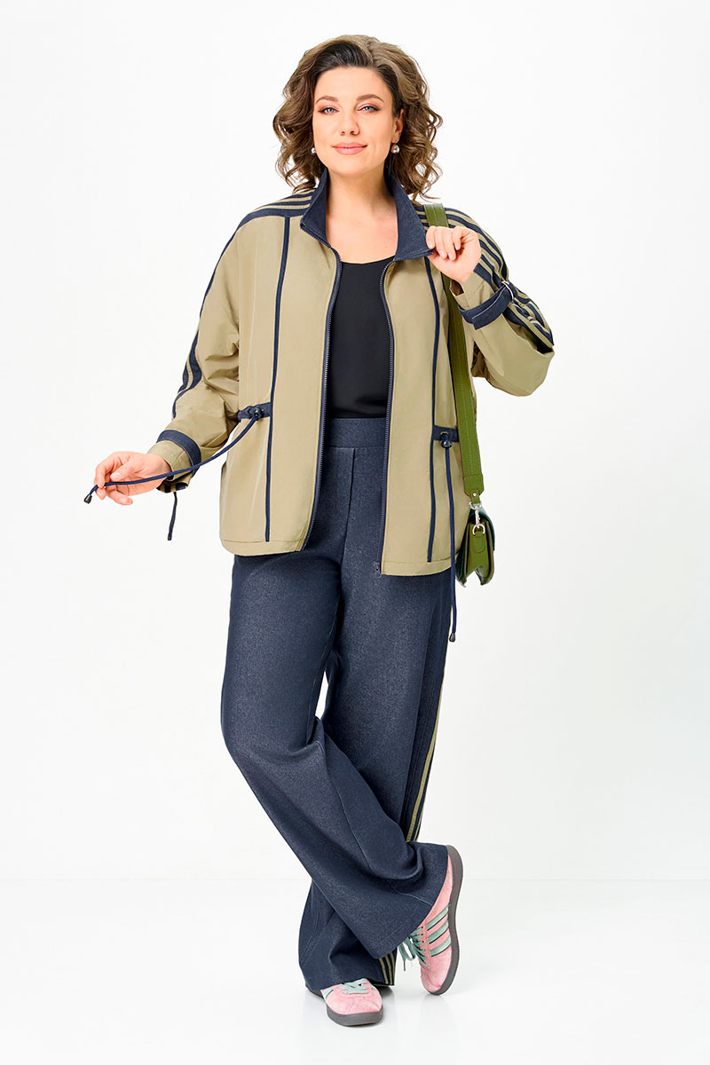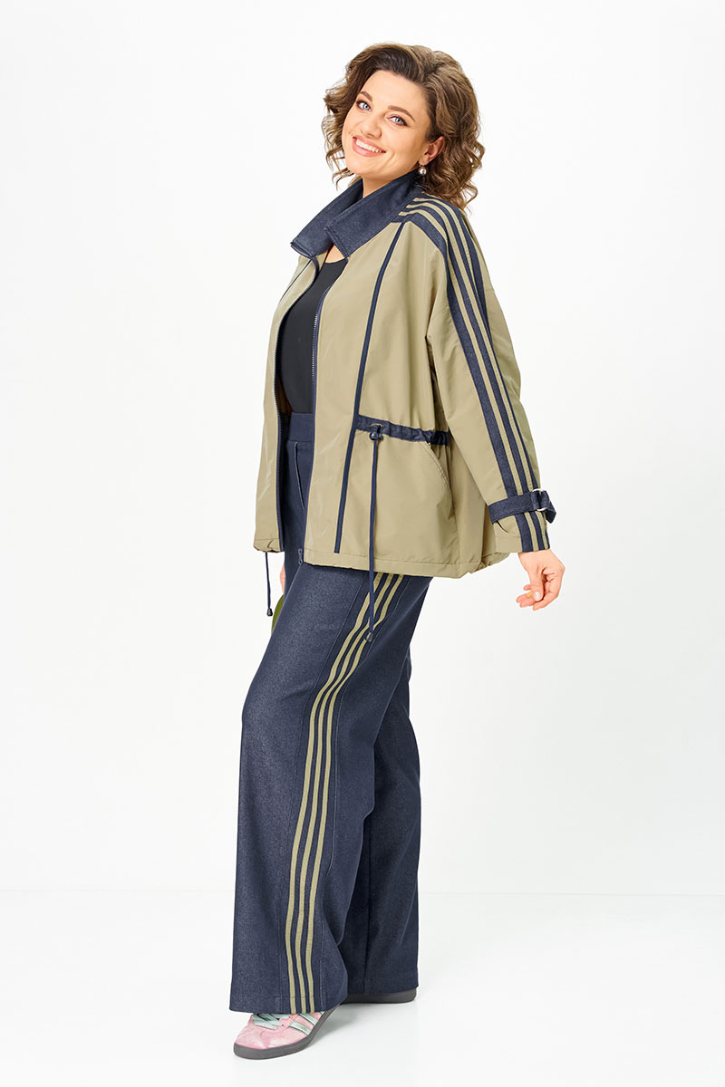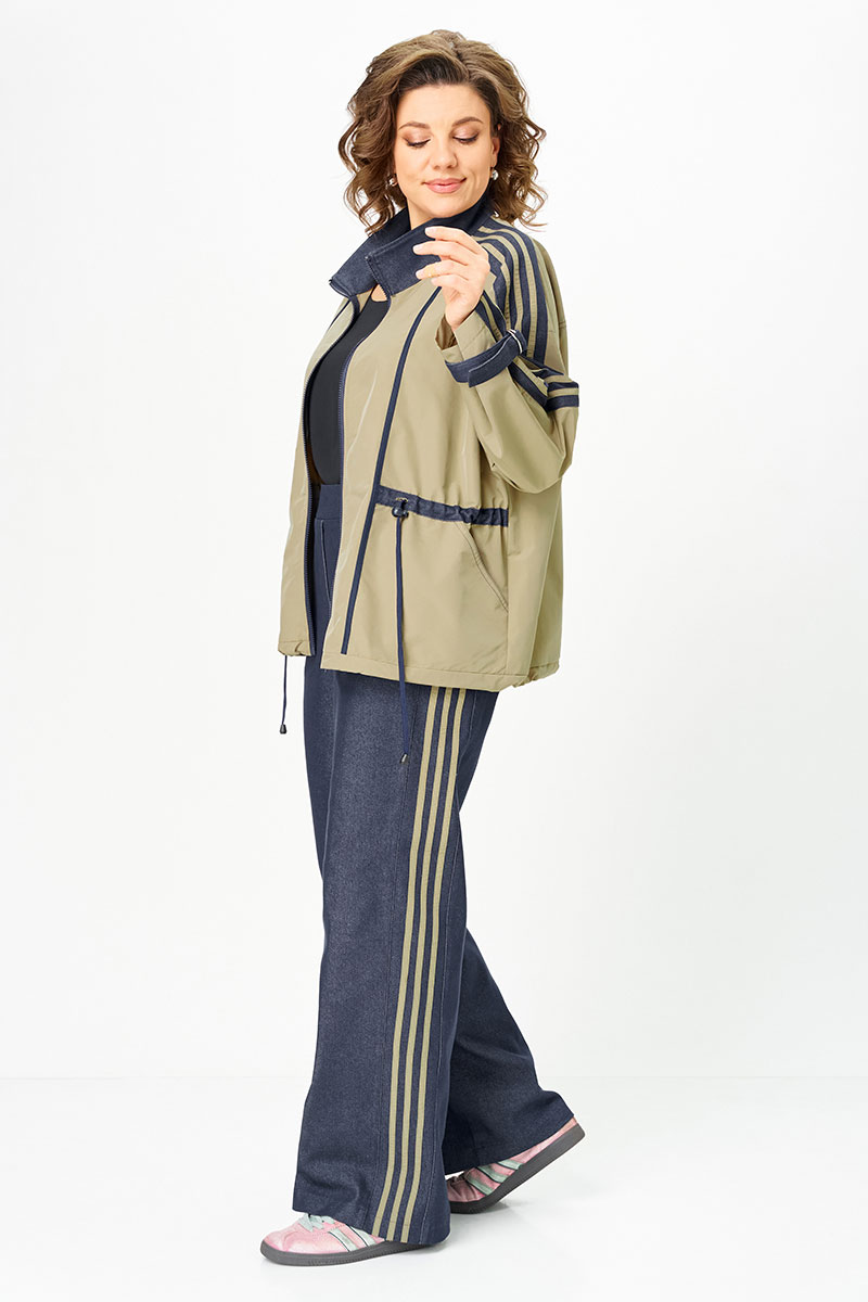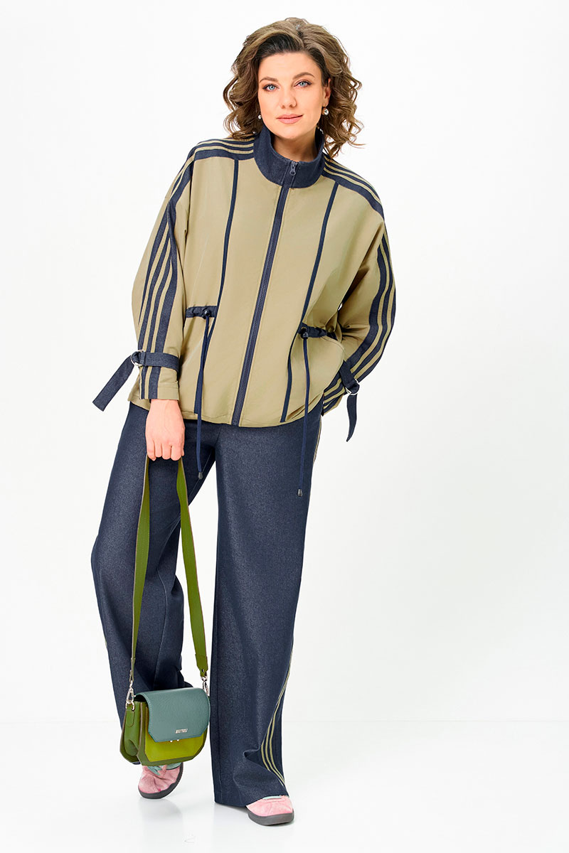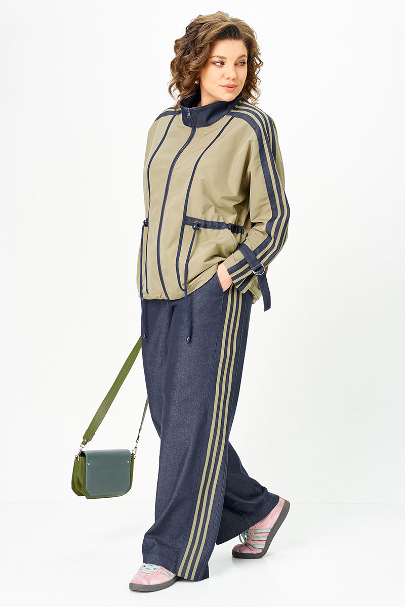 Комбинированный брючный премиум комплект в стиле спорт шик для внесезонной носки. Кртка-ветровка средней длины без подкладки, свободного силуэта на молнии, со множеством декоративных элементов в контраст, по талии и низу куртки регулируемая кулиса. Накладные карманы с боковым входом, воротник - высокая отложная стойка, по рукаву контрастная отделка и регулируемый хлястик. Спинка с кокеткой. Брюки средней посадки, прямые к низу с декоративными лампасами , без застежки, на круговой резинке по талии, с карманами в боковых швах.