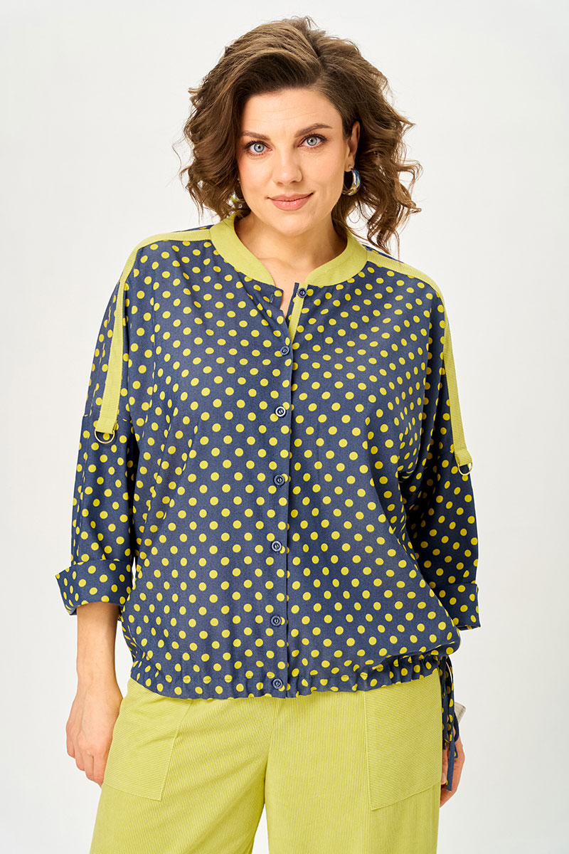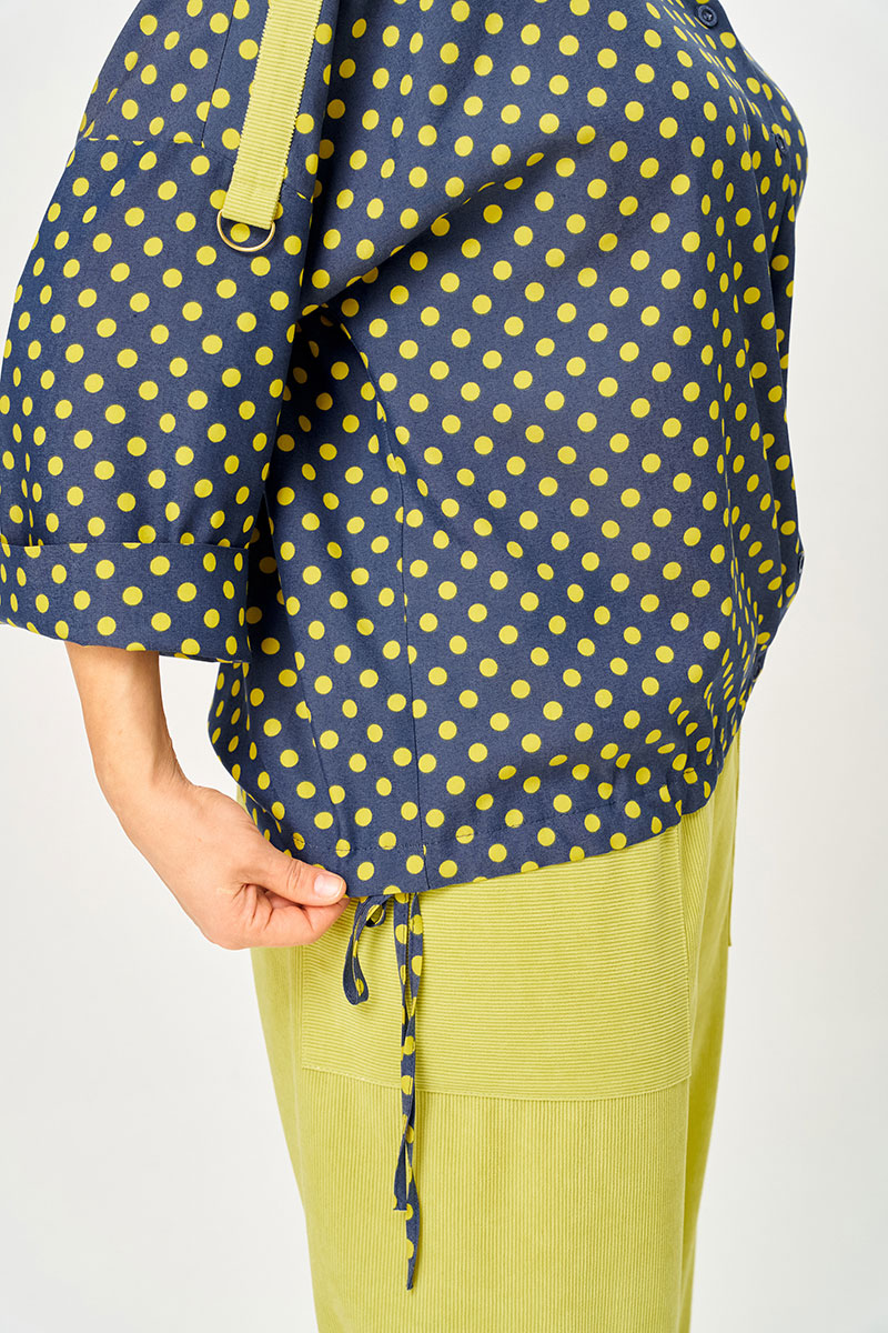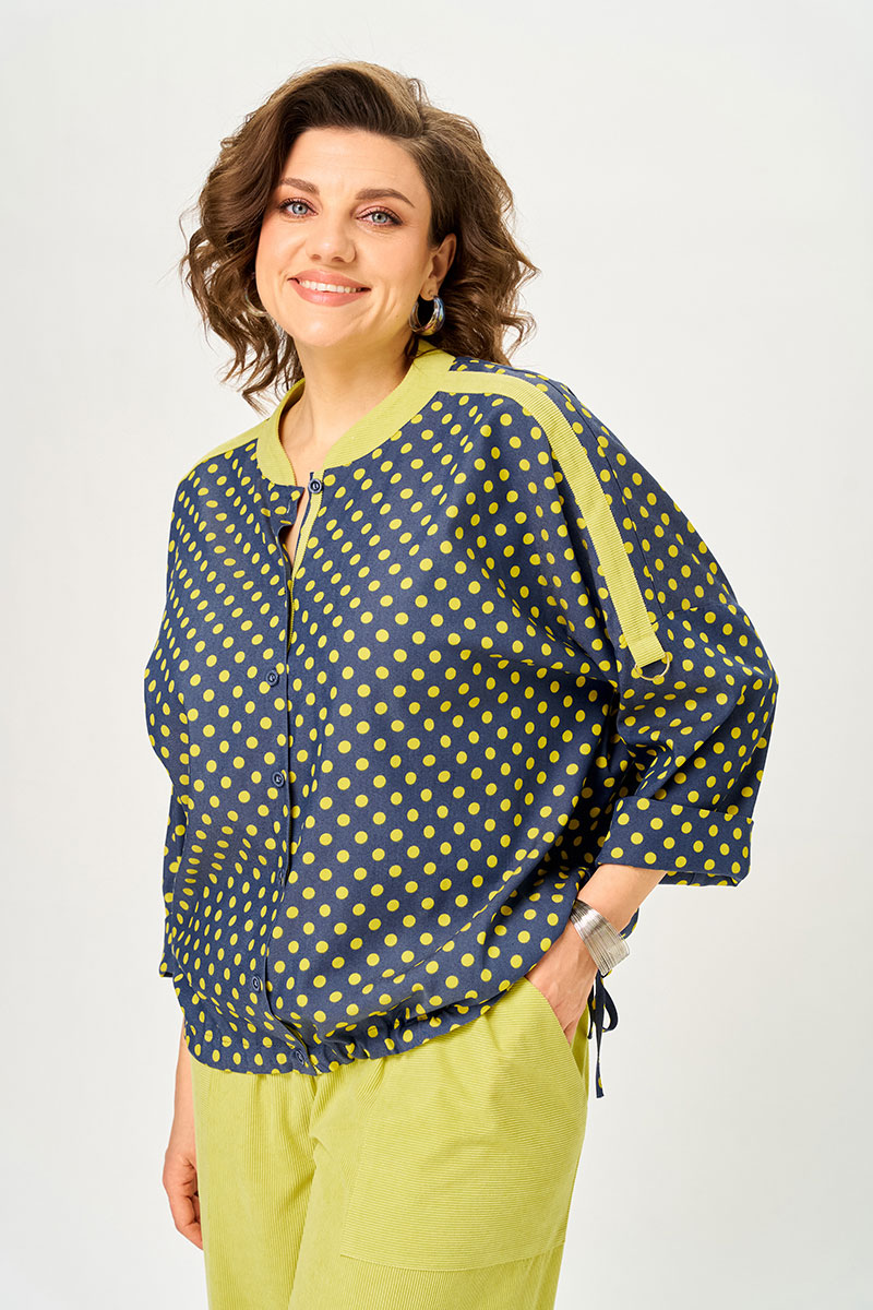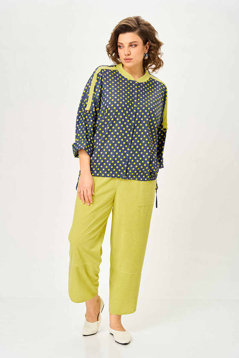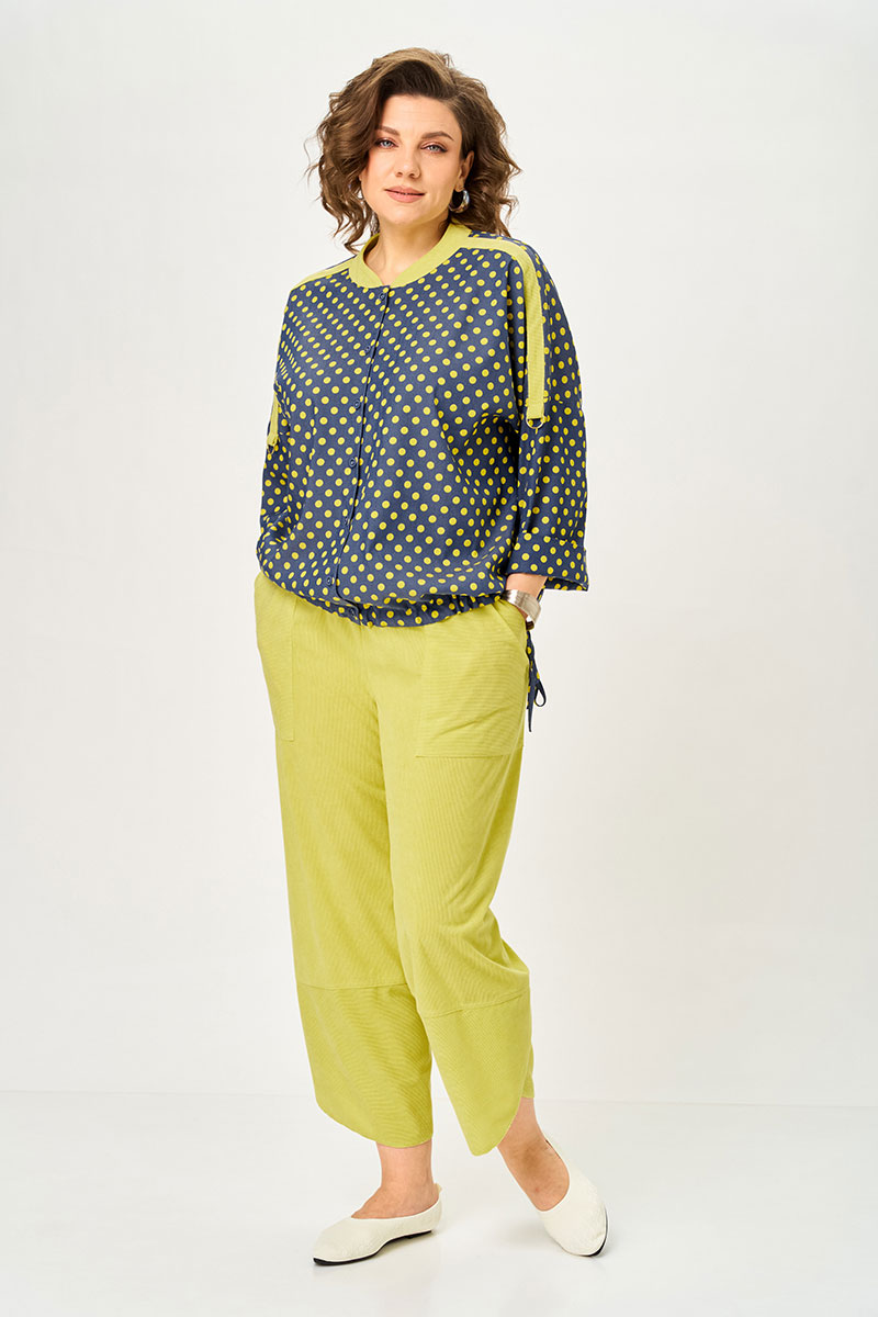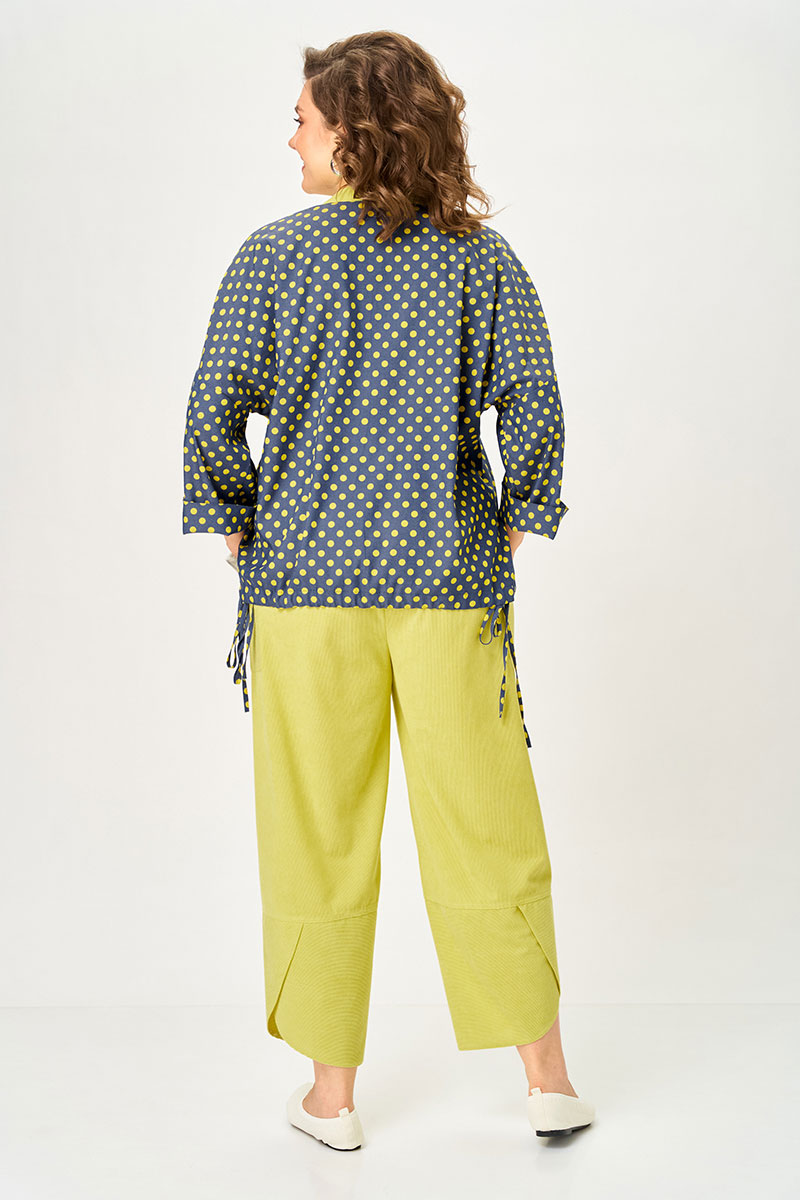 Стильный брючный комплект идеальный наряд для лета . Блузон из легкой ткани в горошек , с яркой отделкой, свободного силуэта на регулируемой кулисе по низу , воротник - втачной стойка, рукав укороченный на спущенной пройме с притачной манжетой , застежка на петли пуговицы , Брюки из облегченного вельвета , модного фасона "Багги" (мешковатые, широкие), с подрезами в запах по низу , средней посадки, без застежки, на эластичном поясе , с прорезными карманами. Возможна замена фурнитуры.